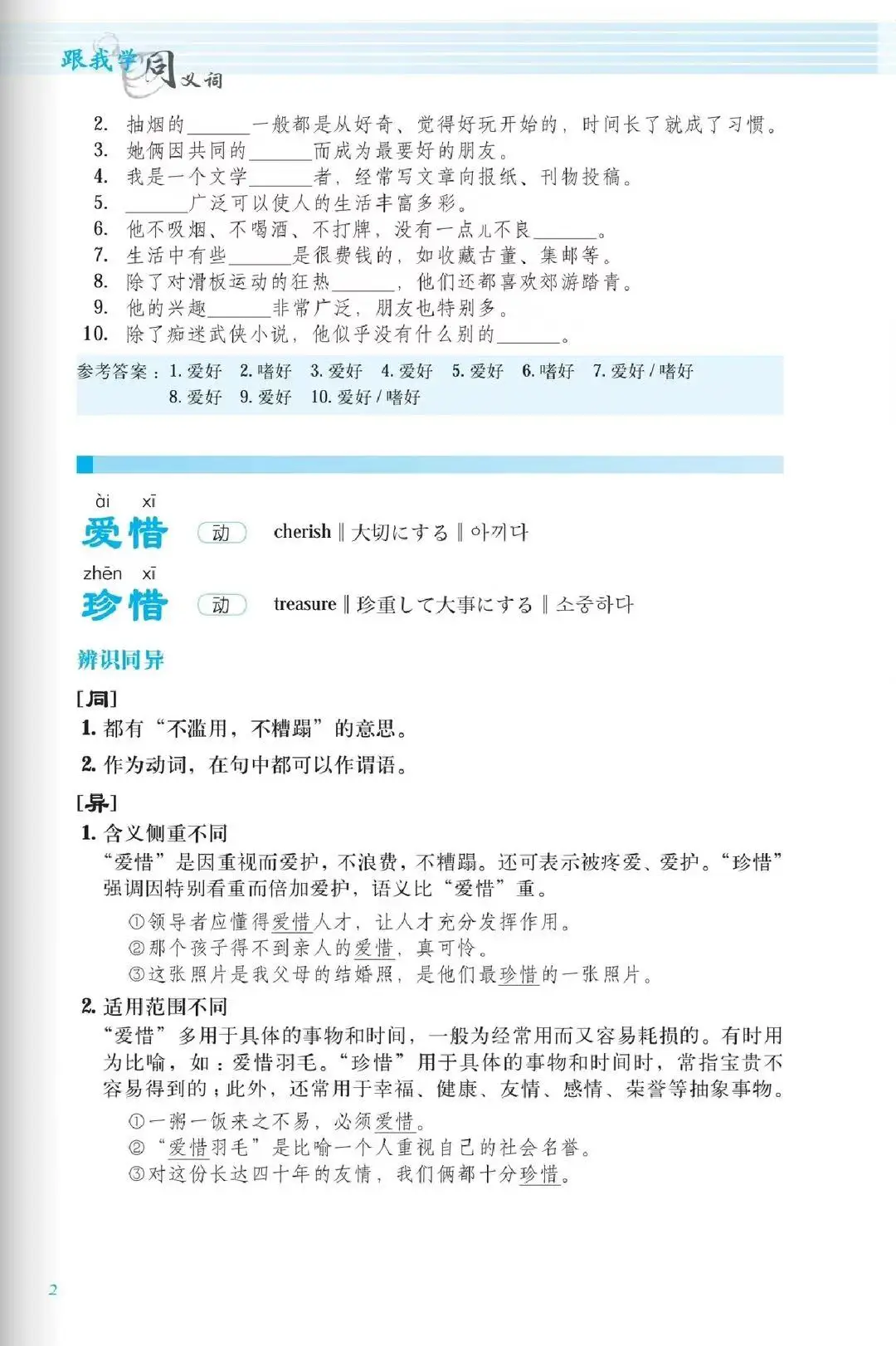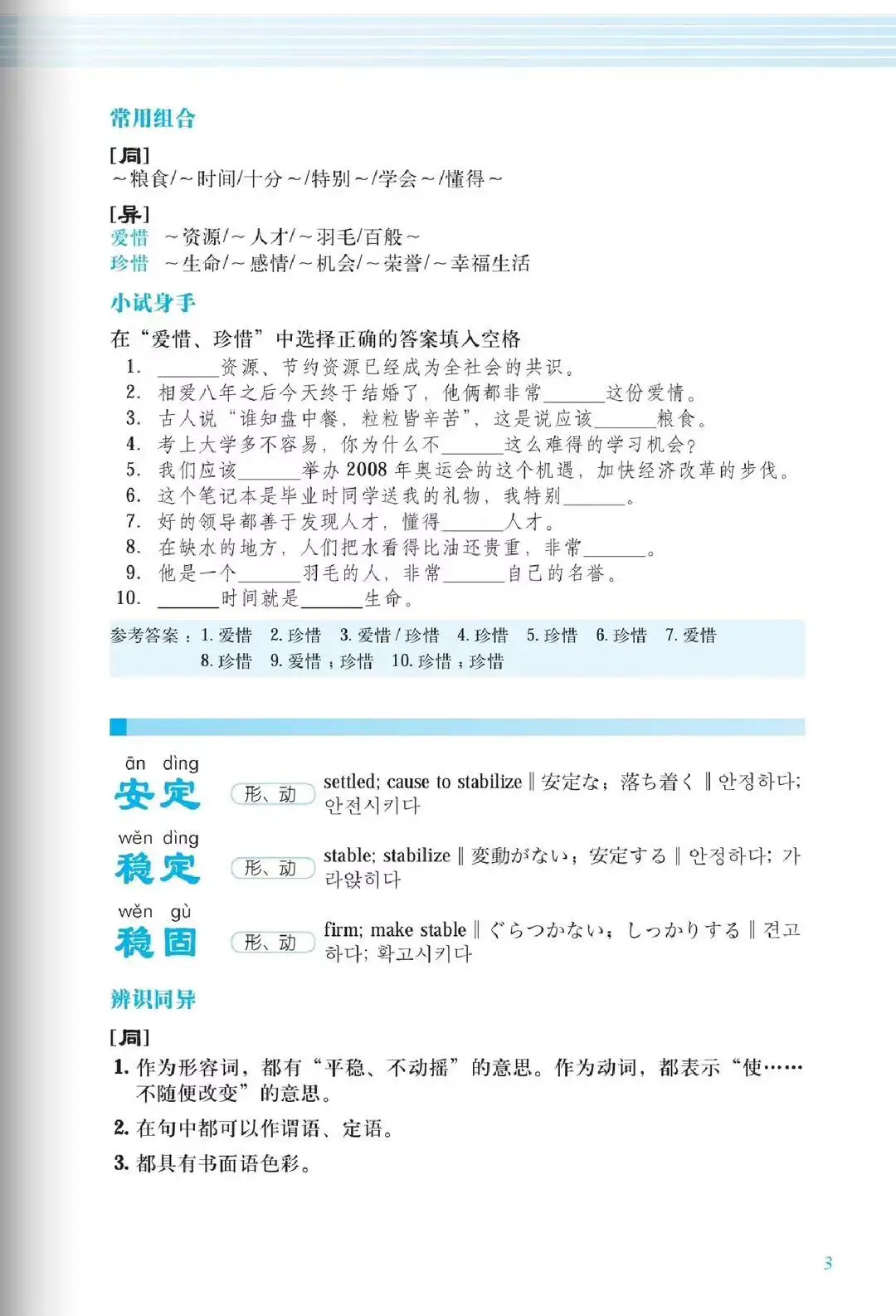 A Handbook of Chinese Synonym is a thesaurus designed for intermediate and advanced Chinese learners who want to learn how to discriminate between synonyms. It contains a total of 725 sets of synonyms, totalling about 1600 words which are common and easy to misuse. The headwords in every set of synonyms are annotated with the part-of-speech, pinyin and corresponding translation in English, Japanese and Korean. There are three sections for every set of synonyms, named "Similarities and differences", "Collocation" and "Exercises".