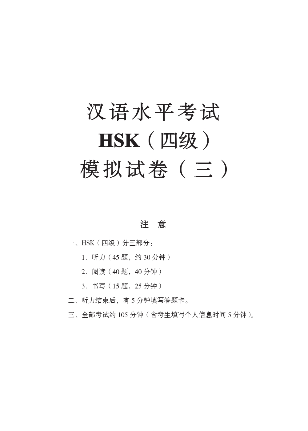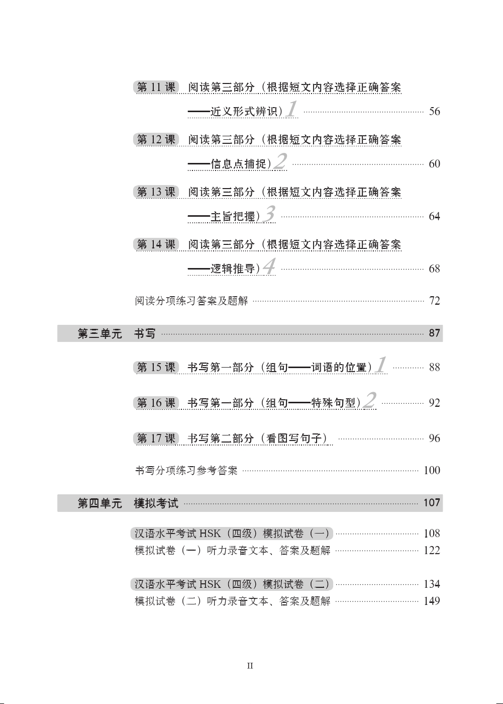 This is the Workbook matching A Short Intensive Course of New HSK (Level 4), targeted at HSK level 4 candidates and training institutions. This workbook is divided into two parts: skill training and simulation tests. Skill training is subdivided into listening, reading and writing, with several lessons devoted to each. The content and emphasis of each lesson are in accordance with those in the textbook. As for the simulation tests, there are four complete sets of test papers, each set including a test paper, the listening script, reference answers, and explanations. The listening sections are provided with audio recordings, which can be acquired by scanning the QR codes in the book.
