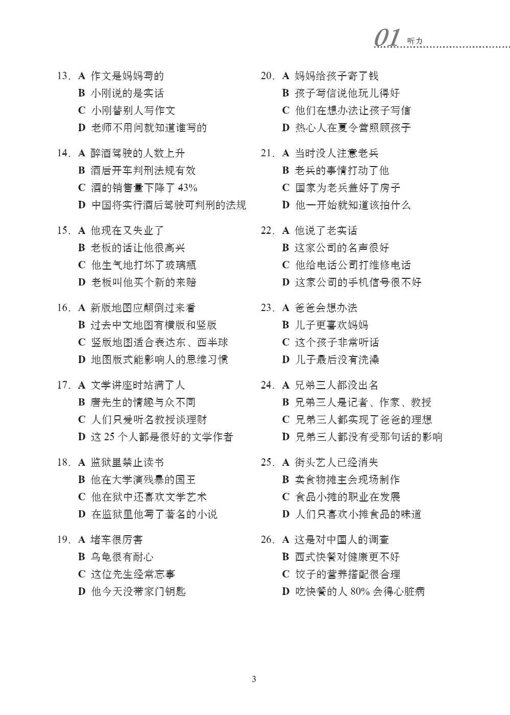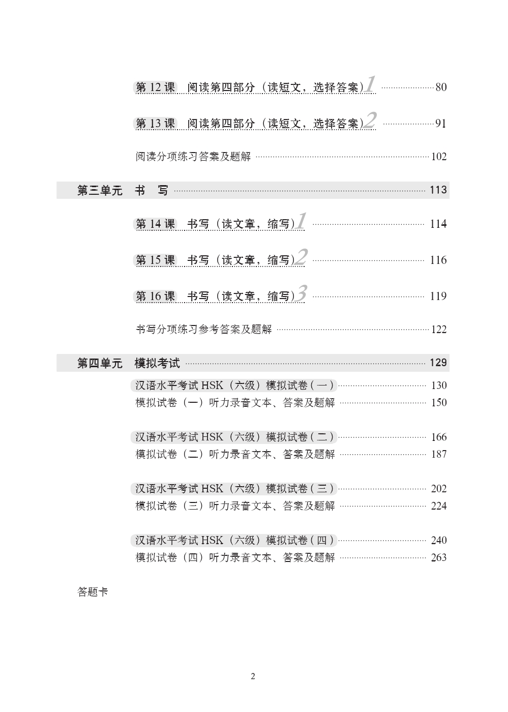 This is the Workbook matching A Short Intensive Course of New HSK (Level 6), targeted at HSK level 6 candidates and training institutions. This workbook is divided into two parts: skill training and simulation tests. Skill training is subdivided into listening, reading and writing, with several lessons devoted to each. The content and emphasis of each lesson are in accordance with those in the textbook. As for simulation tests, there are four complete sets of test papers, each set including a test paper, the listening script, reference answers, and explanations. The listening sections are provided with audio recordings, which can be acquired by scanning the QR codes in the book.