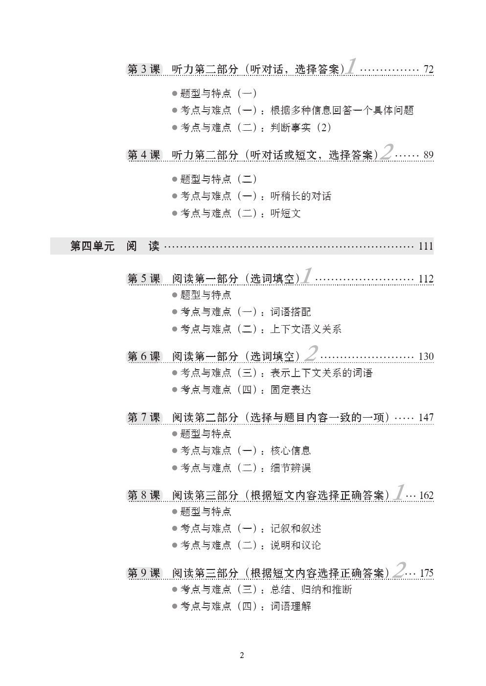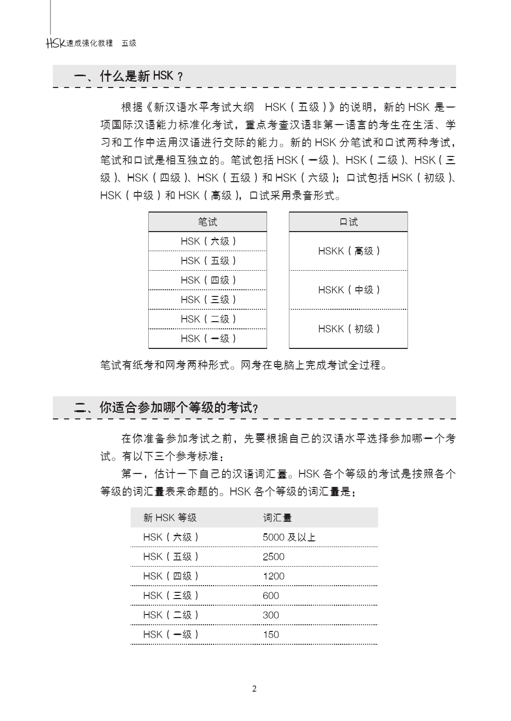 A Short Intensive Course of New HSK, aimed at providing pre-exam guidance and intensive training for the New HSK candidates and training institutions, includes 10 volumes altogether, i.e., the intensive training courses respectively for levels 3~6, the workbooks supporting the intensive courses, the volumes for intermediate spoken Chinese and advanced spoken Chinese. The intensive training course for each level provides two model tests and specific intensive training on the testing points and difficult points about grammar, vocabulary etc., the common errors, and test-taking strategies. The model tests and exercises demonstrate similarity to the official New HSK in difficulty.