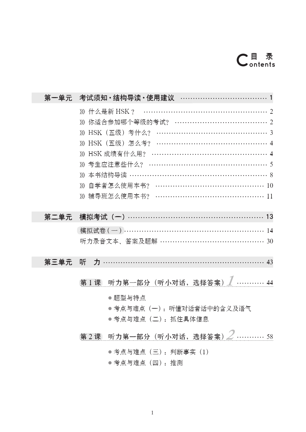 This book, written for the New HSK (Level 5) training institutions, candidates and their Chinese teachers, is based on the testing points and difficult points of level 5, illustrating them with examples from the past tests, combining instruction with practice, reinforcing learning through immediate exercises, and making timely summaries so that candidates can make steady progress. It also studies the key words prescribed in the outline of level 5. The book is divided into the following parts: About the Test/Introduction to the Structure/Advice for Users—Model Test 1 (pre-tutorial test so that you’ll find your weak points)—Unit of Listening Comprehension (specific training)—Unit of Reading Comprehension (specific training)—Unit of Writing (specific training)—Model Test 2 (summary, warm-up exercise before the real test). The stylistic features are explained in detail in the writing part, illustrating and analyzing them with students’ sample essays.