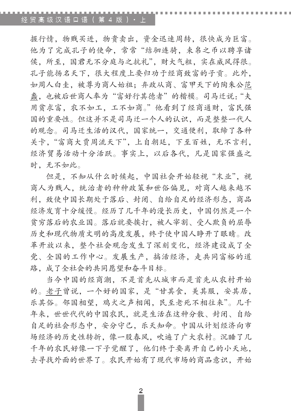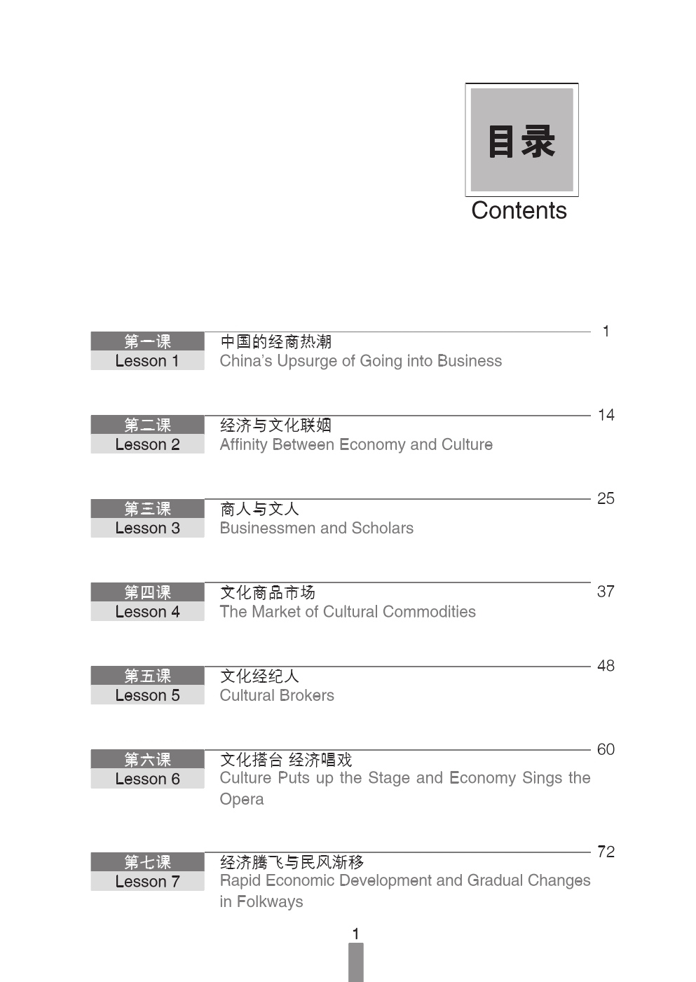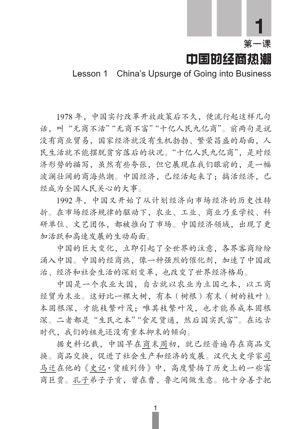 This is a business Chinese textbook for foreigners learning Chinese, suitable for international students of advanced Chinese language programs and third-year (or above) undergraduates studying at Chinese universities. It is also suitable for students with equivalent Chinese proficiency in Chinese training classes or universities in countries other than China. It is composed of 15 lessons. Every lesson or every two lessons comprise one topic, covering the major areas that foreign businessmen take their business activities in China: China’s economic situations, investment environment, investment strategy, business management, human resources, market research, marketing strategy, international trade, and corporate culture. Each lesson comprises five units, namely intensive reading, reading, writing, interactive activities, and comprehensive exercises, which improve students’ proficiency in business Chinese from listening, speaking, reading, and writing perspectives and enhance their understanding of China’s economy and trade.
