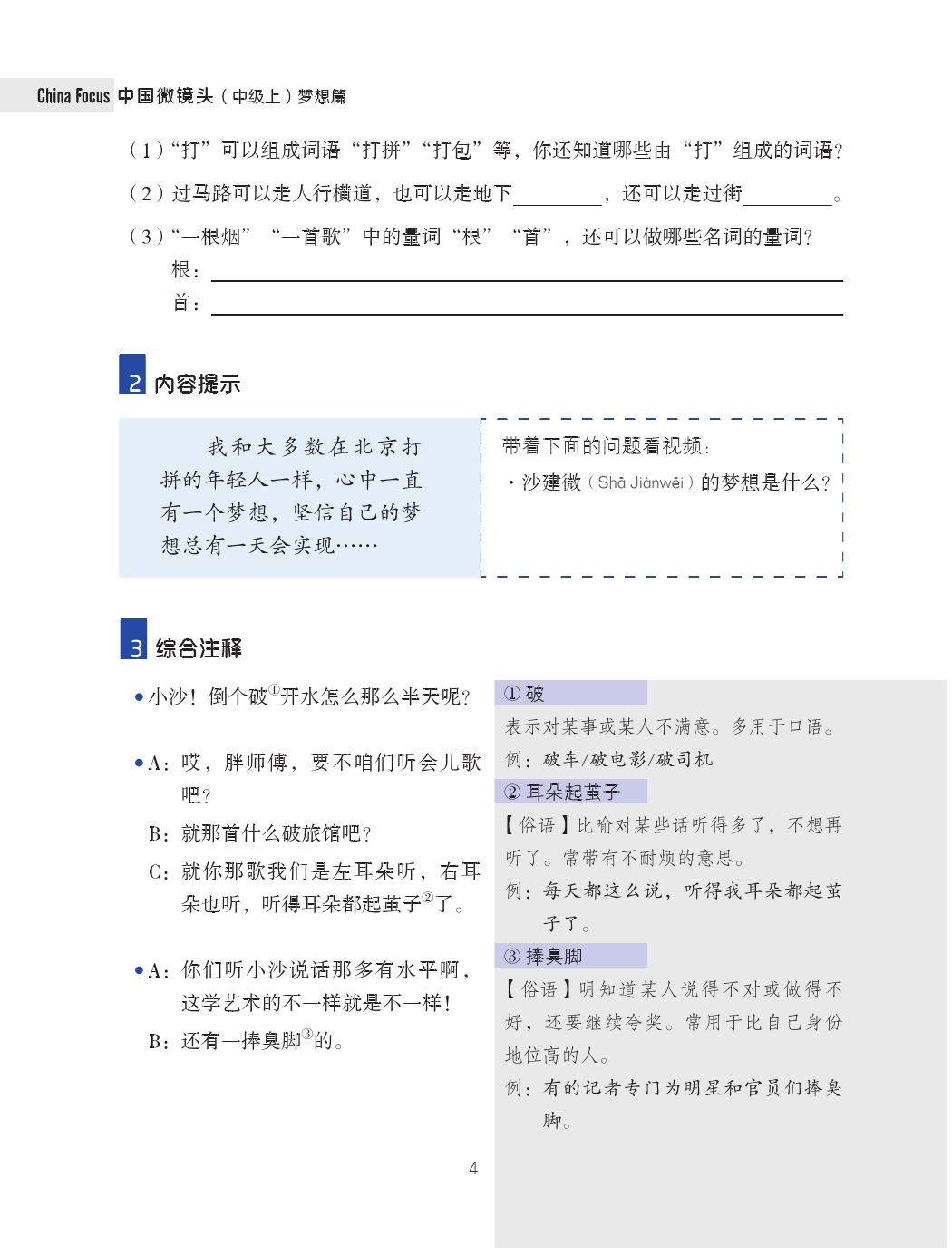 China Focus is a set of comprehensive Chinese teaching materials specially designed for the Chinese audiovisual-speaking course. The video clips are extracted from contemporary Chinese social hot issues, feature programs, news, sitcoms, documentaries, talk shows, interviews, entertainment programs, films and TV plays, micro films, advertisements, songs, etc. Using abundant online video resources, it builds a natural-language-based classroom teaching environment, giving full play to the Chinese audiovisual-speaking course's function of being a window to the society, and promoting the integration of language learning and cultural understanding.