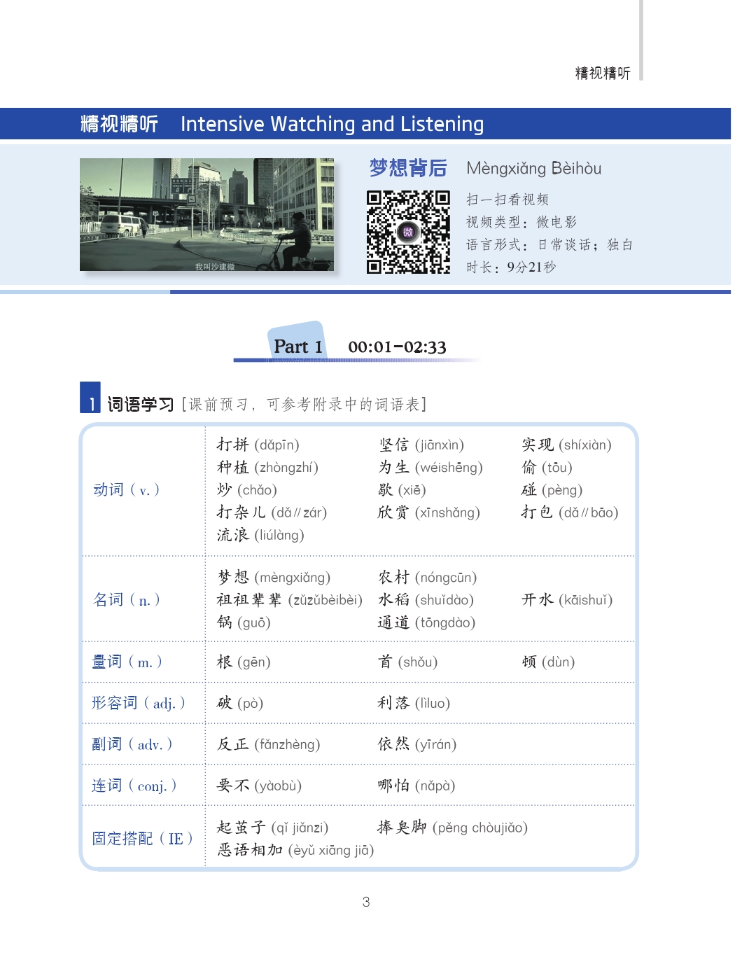 This set of materials is divided into six levels, each of which is composed of several themes, encompassing society, economy, culture, education, life, love, and art. Several course modules are designed under each theme. The intermediate level (I) includes 10 volumes, each taking 4 class hours and covering the communication functions and scenes commonly used in the elementary level, intermediate level and advanced level. Teachers can develop a personalized assortment of teaching materials based on the themes they are interested in, which can either be independently used in an audiovisual-speaking course, or as exercise materials in a comprehensive class, speaking class, listening class and other classes.