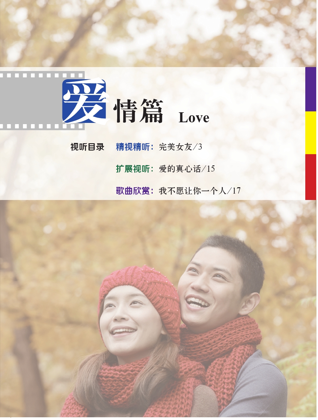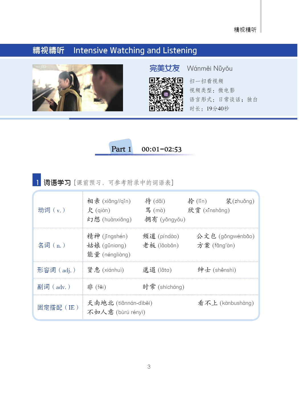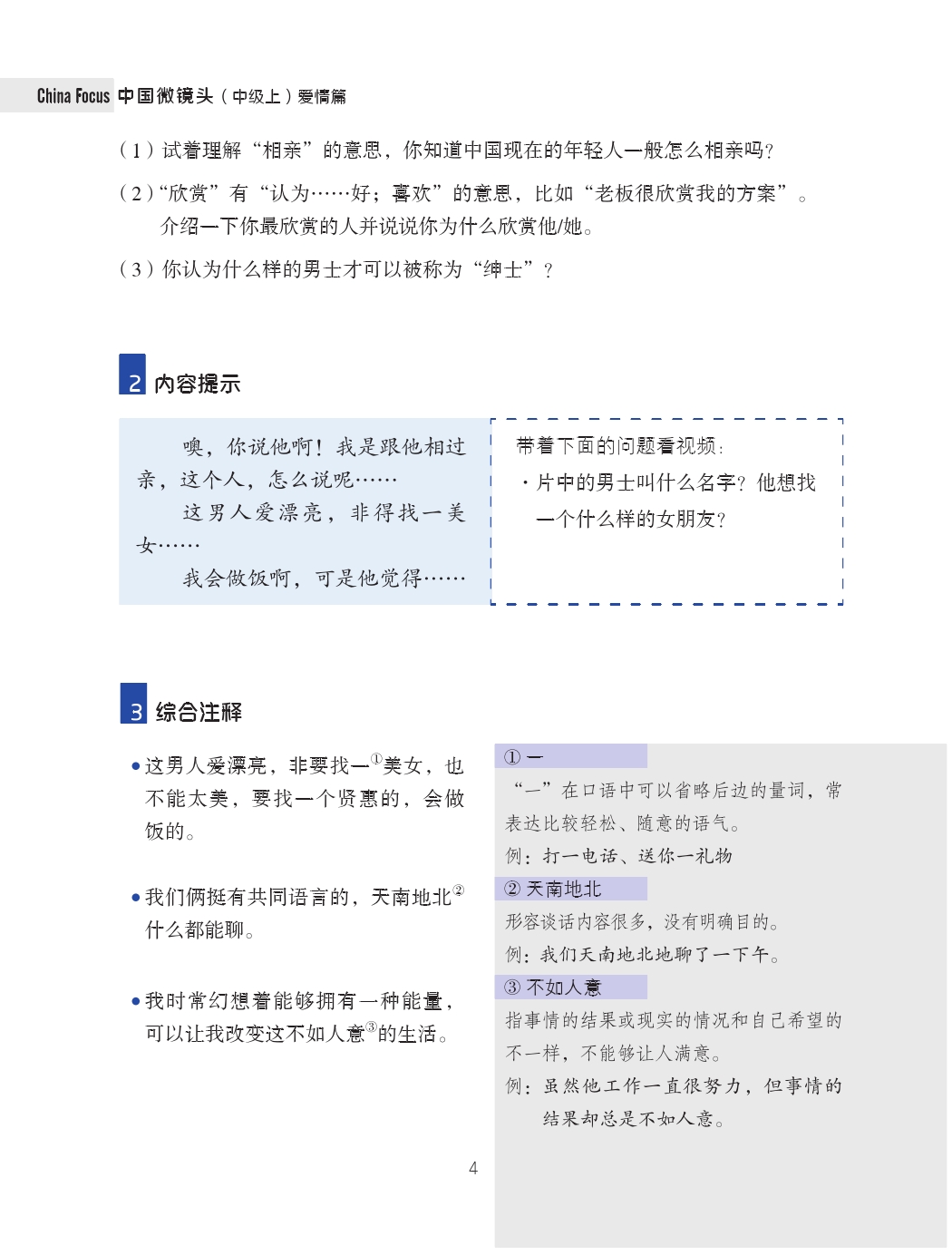 This set of materials is divided into six levels, each of which is composed of several themes, encompassing society, economy, culture, education, life, love, and art. Several course modules are designed under each theme. The intermediate level (I) includes 10 volumes, each taking 4 class hours and covering the communication functions and scenes commonly used in the elementary level, intermediate level and advanced level. Teachers can develop a personalized assortment of teaching materials based on the themes they are interested in, which can either be independently used in an audiovisual-speaking course, or as exercise materials in a comprehensive class, speaking class, listening class and other classes.