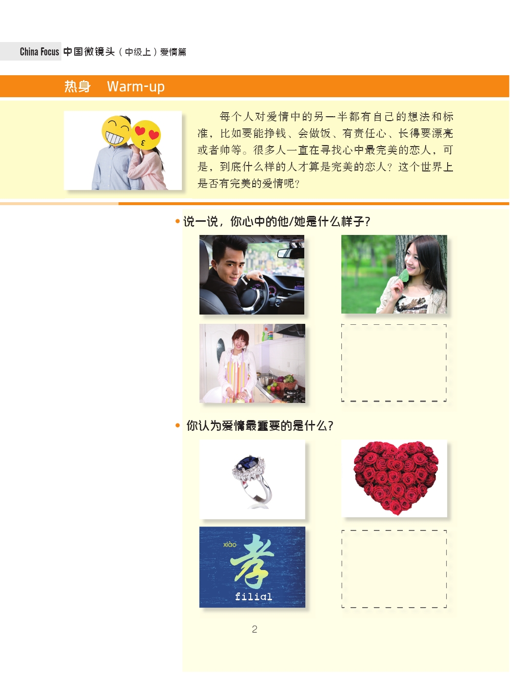 China Focus is a set of comprehensive Chinese teaching materials specially designed for the Chinese audiovisual-speaking course. The video clips are extracted from contemporary Chinese social hot issues, feature programs, news, sitcoms, documentaries, talk shows, interviews, entertainment programs, films and TV plays, micro films, advertisements, songs, etc. Using abundant online video resources, it builds a natural-language-based classroom teaching environment, giving full play to the Chinese audiovisual-speaking course's function of being a window to the society, and promoting the integration of language learning and cultural understanding.