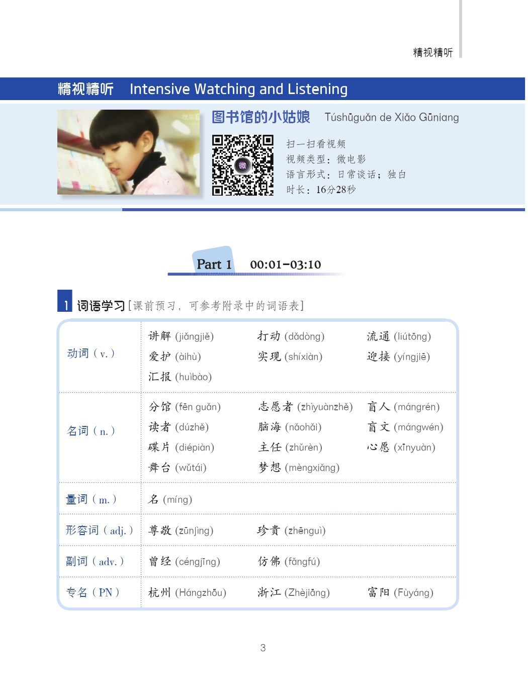 This set of materials is divided into six levels, each of which is composed of several themes, encompassing society, economy, culture, education, life, love, and art. Several course modules are designed under each theme. The intermediate level (I) includes 10 volumes, each taking 4 class hours and covering the communication functions and scenes commonly used in the elementary level, intermediate level and advanced level. Teachers can develop a personalized assortment of teaching materials based on the themes they are interested in, which can either be independently used in an audiovisual-speaking course, or as exercise materials in a comprehensive class, speaking class, listening class and other classes.