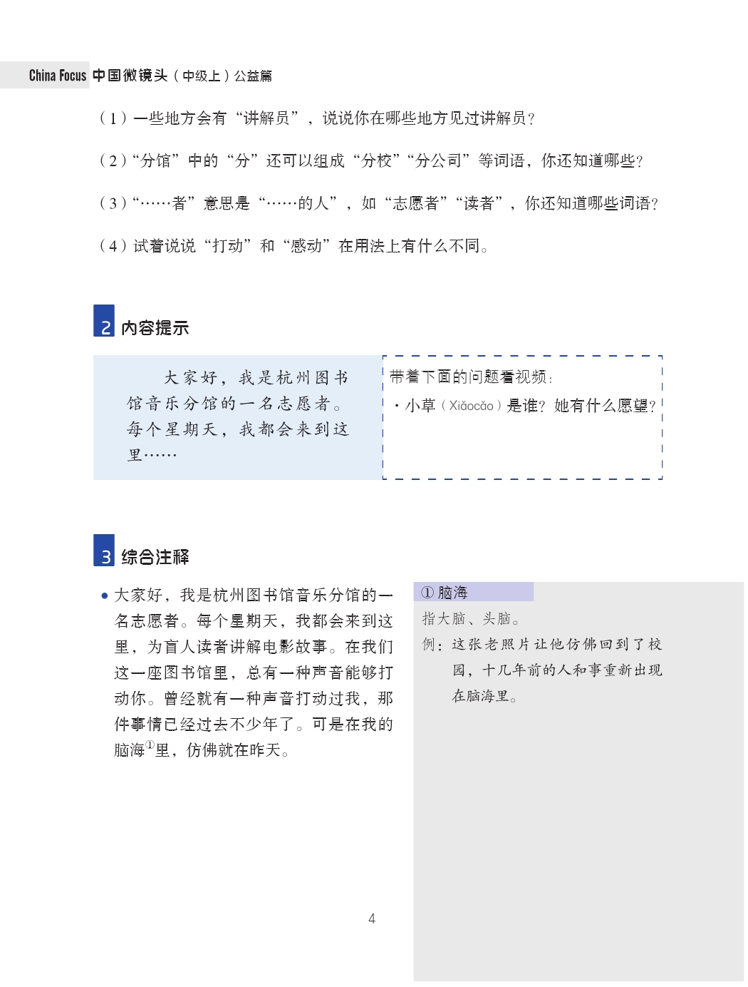 China Focus is a set of comprehensive Chinese teaching materials specially designed for the Chinese audiovisual-speaking course. The video clips are extracted from contemporary Chinese social hot issues, feature programs, news, sitcoms, documentaries, talk shows, interviews, entertainment programs, films and TV plays, micro films, advertisements, songs, etc. Using abundant online video resources, it builds a natural-language-based classroom teaching environment, giving full play to the Chinese audiovisual-speaking course's function of being a window to the society, and promoting the integration of language learning and cultural understanding.