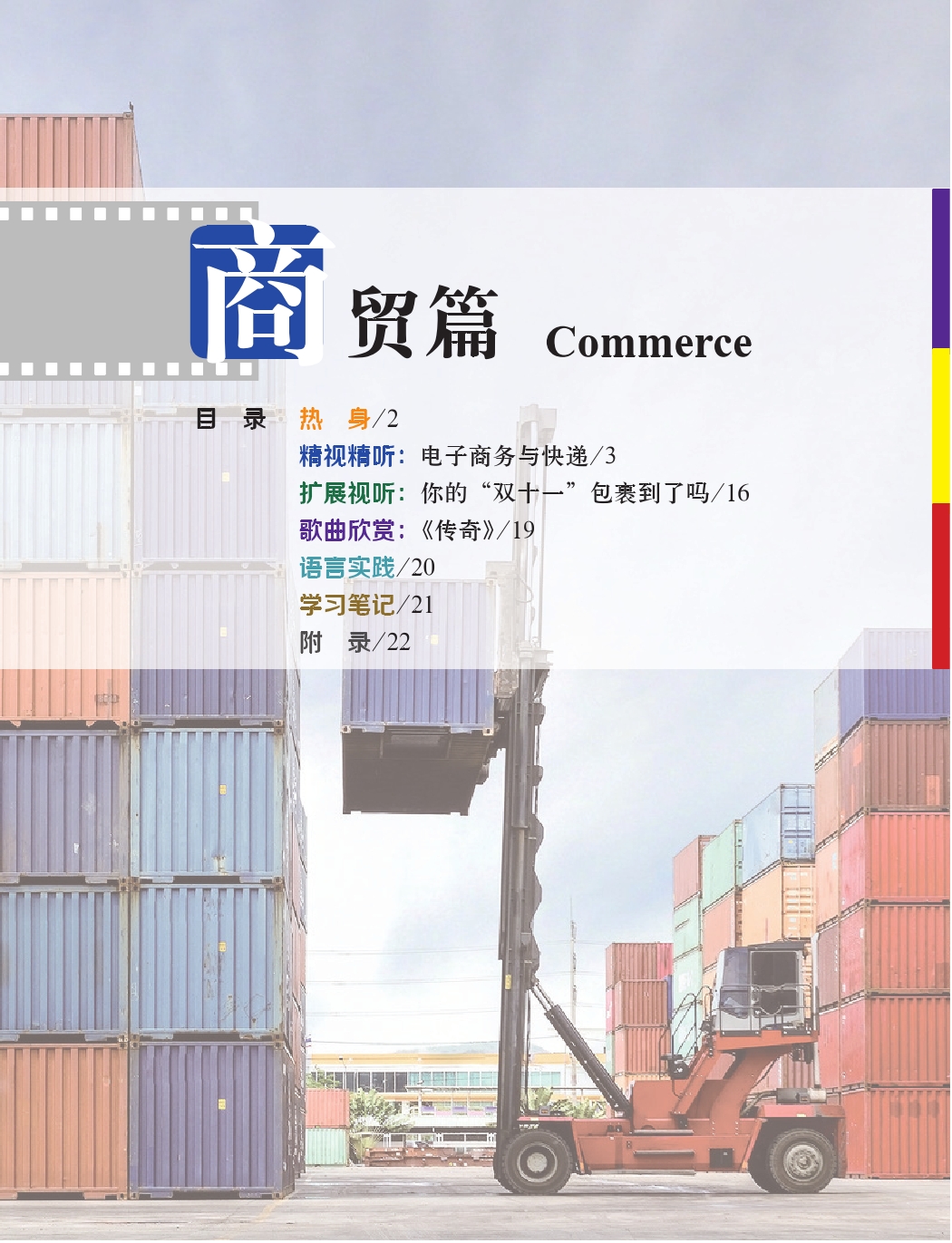This set of materials is divided into six levels, each of which is composed of several themes, encompassing society, economy, culture, education, life, love, and art. Several course modules are designed under each theme. The intermediate level (Ⅱ) includes 10 volumes, each taking four class hours and covering the communication functions and scenes commonly used in the elementary level, intermediate level and advanced level. Teachers can develop a personalized assortment of teaching materials based on the themes they are interested in, which can either be independently used in an audiovisual-speaking course, or as exercise materials in a comprehensive class, speaking class, listening class and other classes.
