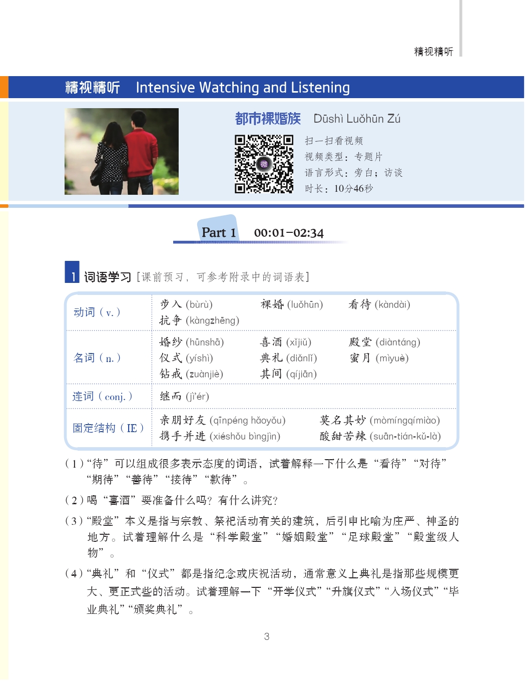 This set of materials is divided into six levels, each of which is composed of several themes, encompassing society, economy, culture, education, life, love, and art. Several course modules are designed under each theme. The intermediate level (Ⅱ) includes 10 volumes, each taking four class hours and covering the communication functions and scenes commonly used in the elementary level, intermediate level and advanced level. Teachers can develop a personalized assortment of teaching materials based on the themes they are interested in, which can either be independently used in an audiovisual-speaking course, or as exercise materials in a comprehensive class, speaking class, listening class and other classes.
