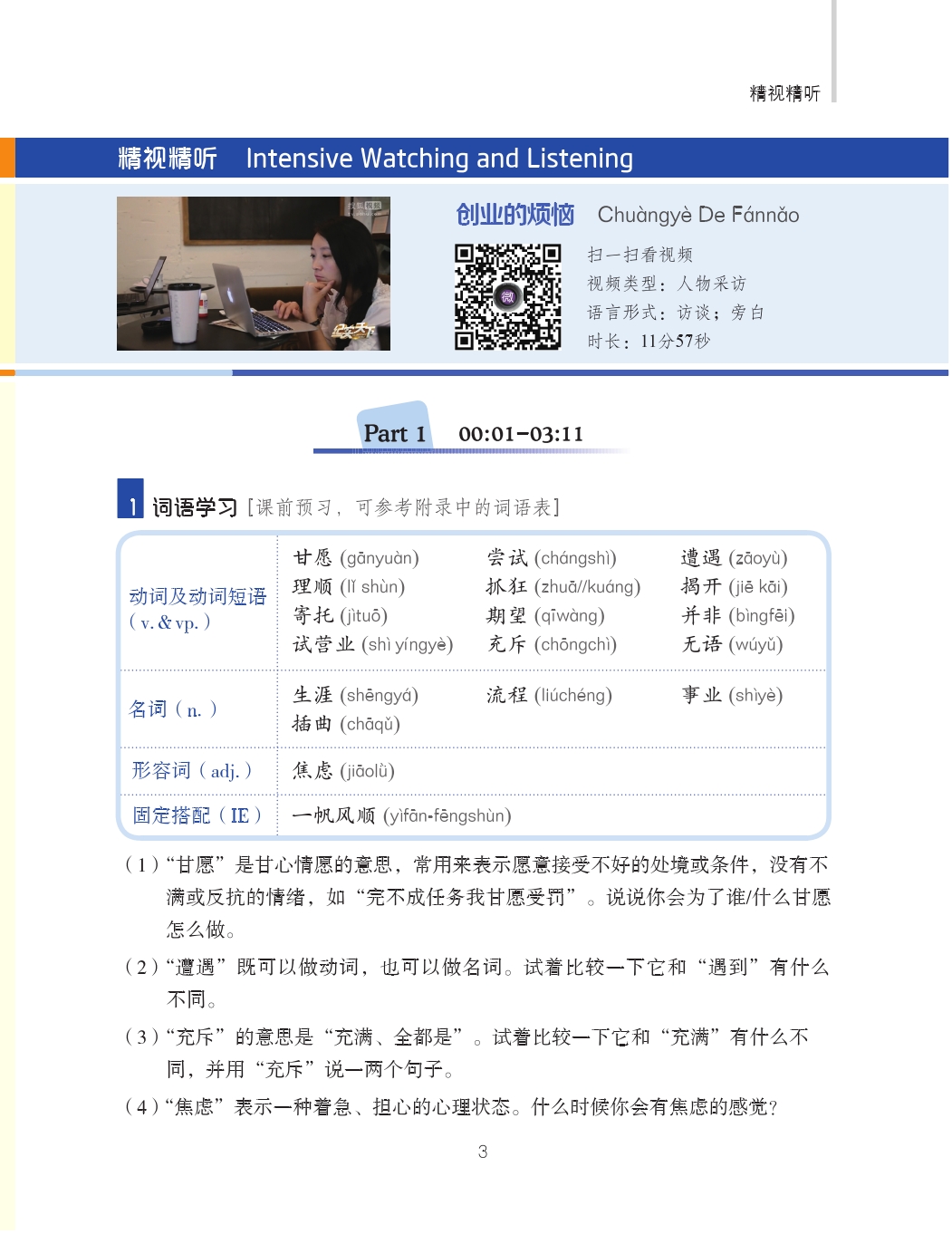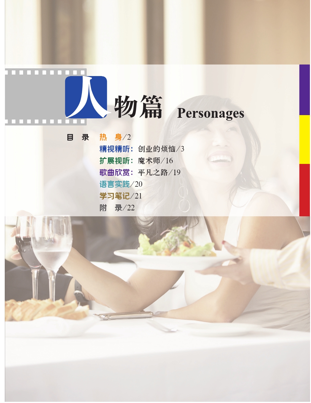 This set of materials is divided into six levels, each of which is composed of several themes, encompassing society, economy, culture, education, life, love, and art. Several course modules are designed under each theme. The intermediate level (Ⅱ) includes 10 volumes, each taking four class hours and covering the communication functions and scenes commonly used in the elementary level, intermediate level and advanced level. Teachers can develop a personalized assortment of teaching materials based on the themes they are interested in, which can either be independently used in an audiovisual-speaking course, or as exercise materials in a comprehensive class, speaking class, listening class and other classes.