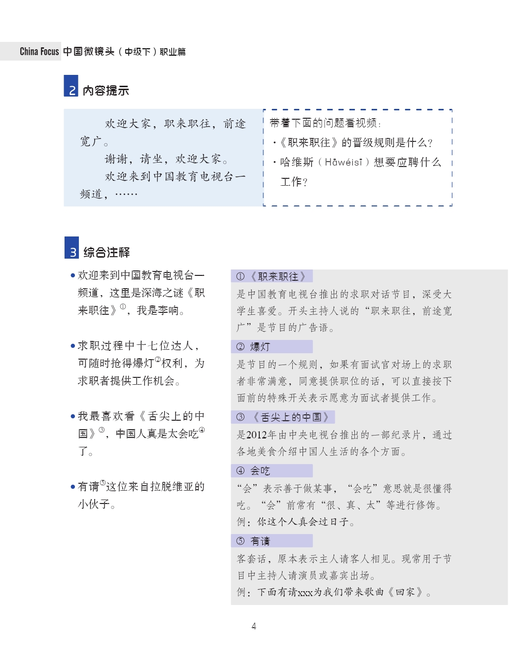 China Focus is a set of comprehensive Chinese teaching materials specially designed for the Chinese audiovisual-speaking course. The video clips are extracted from contemporary Chinese social hot issues, feature programs, news, sitcoms, documentaries, talk shows, interviews, entertainment programs, films and TV plays, micro films, advertisements, songs, etc. Using abundant online video resources, it builds a natural-language-based classroom teaching environment, giving full play to the Chinese audiovisual-speaking course's function of being a window to the society, and promoting the integration of language learning and cultural understanding.