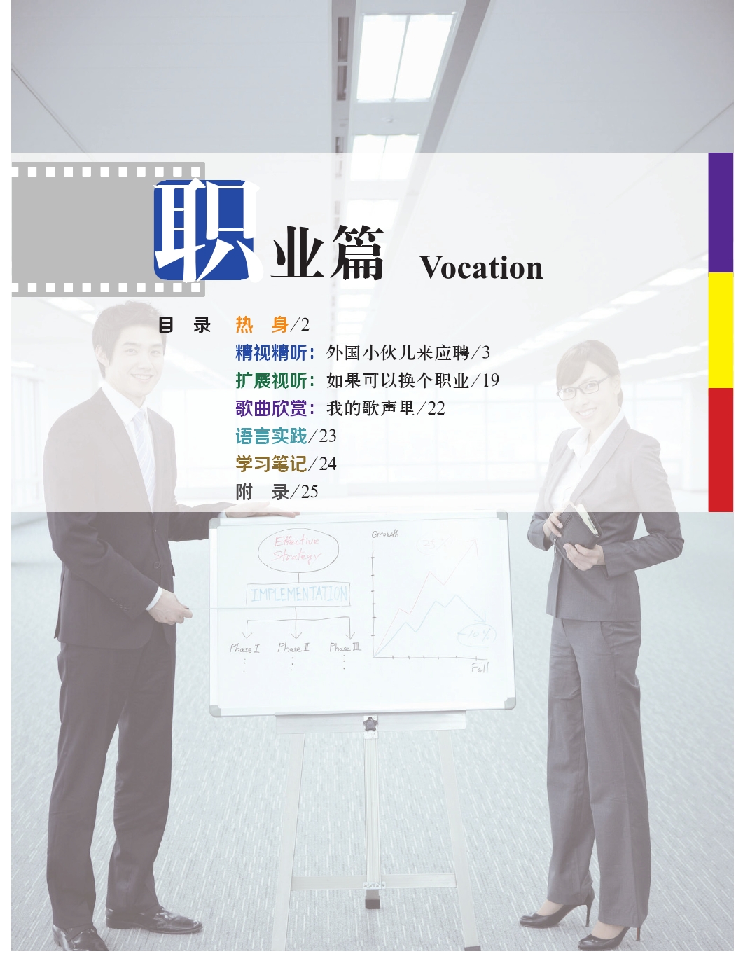 This set of materials is divided into six levels, each of which is composed of several themes, encompassing society, economy, culture, education, life, love, and art. Several course modules are designed under each theme. The intermediate level (Ⅱ) includes 10 volumes, each taking four class hours and covering the communication functions and scenes commonly used in the elementary level, intermediate level and advanced level. Teachers can develop a personalized assortment of teaching materials based on the themes they are interested in, which can either be independently used in an audiovisual-speaking course, or as exercise materials in a comprehensive class, speaking class, listening class and other classes.