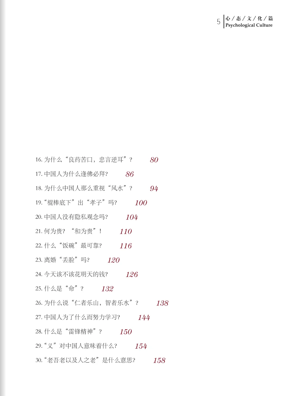 This is the volume of Psychological Culture, focusing on the thoughts and concepts of Chinese people that often cause foreigners’ confusion or even misunderstanding, such as those regarding family, age-based and social hierarchy, time, hometown nostalgia, life and death, religion, privacy, peace and harmony, and money, etc. This book integrates society, history and philosophy into the analysis of how these thoughts, concepts and ways of thinking are formed, the cultural psychology behind them, and the changes in the thinking of contemporary Chinese people, thus ushering readers into the inner world of Chinese people.