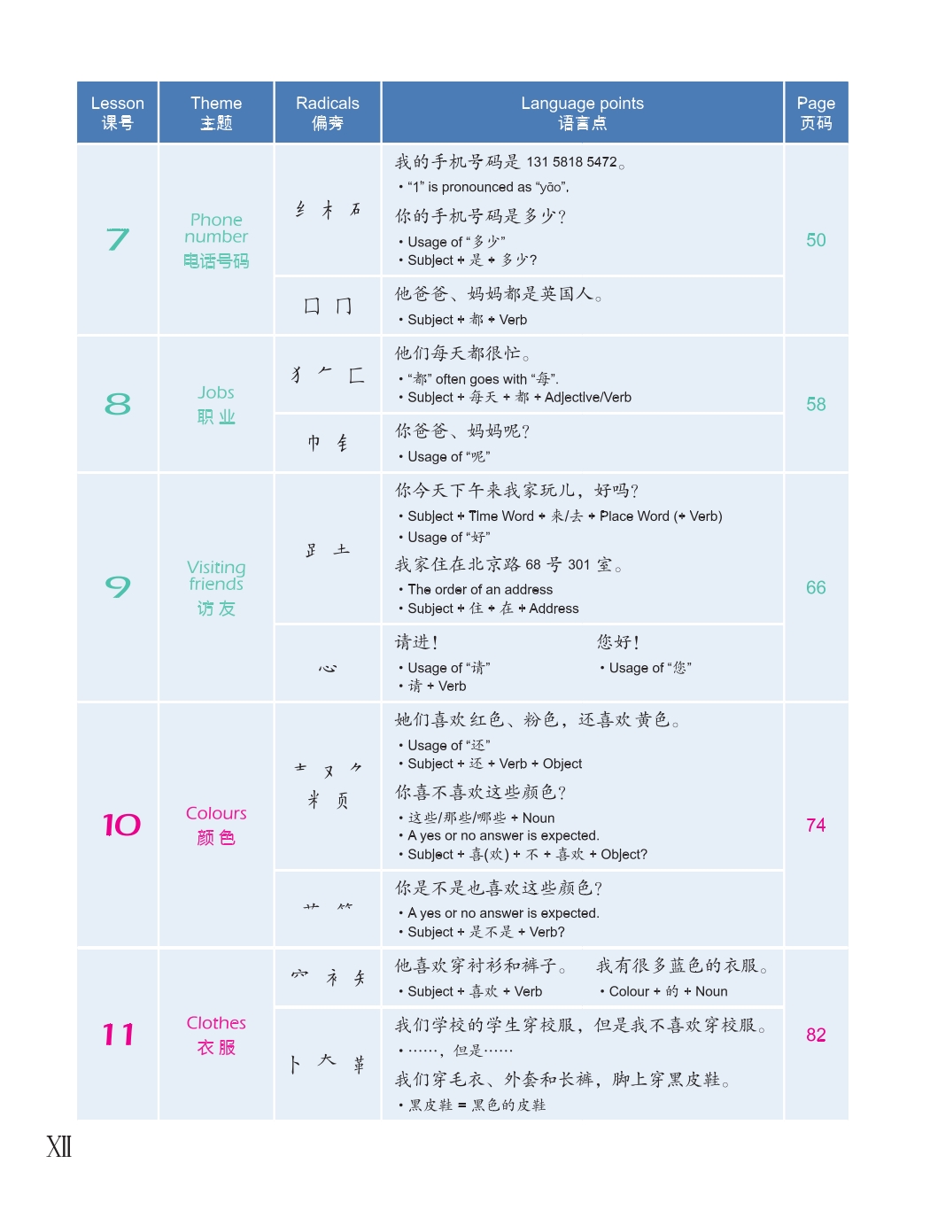 Stage 1: Books 1-2·Numbers·Personal identification·Parts of the body·Colours and clothing·Food and drinks·Daily routines·Schooling·Hobbies·Life at home·Means of transport·Daily articles·Weather