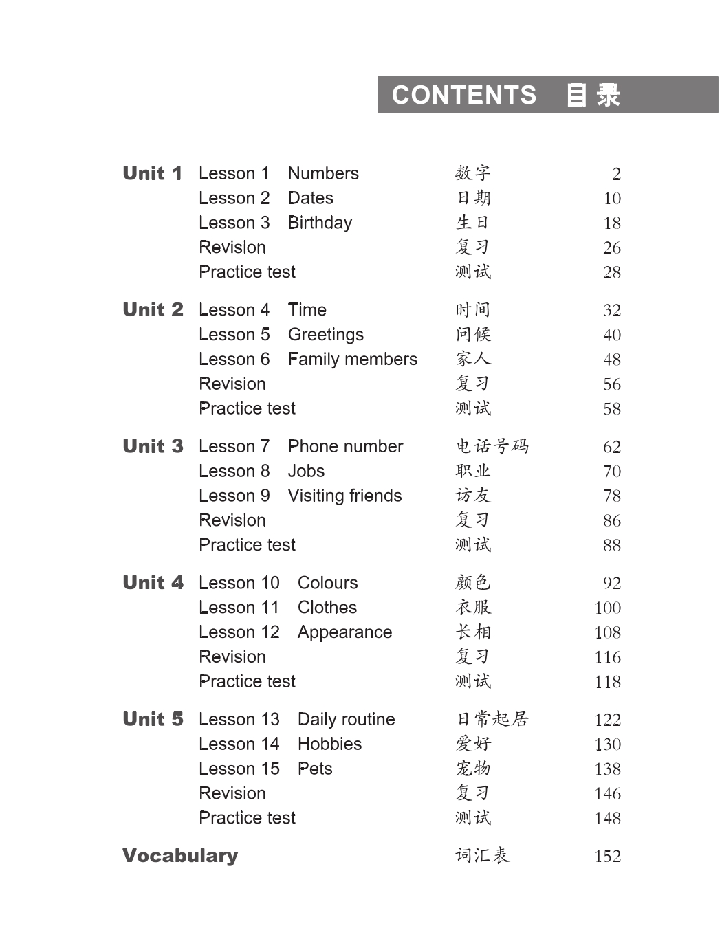 Stage 1: Books 1-2·Numbers·Personal identification·Parts of the body·Colours and clothing·Food and drinks·Daily routines·Schooling·Hobbies·Life at home·Means of transport·Daily articles·Weather
