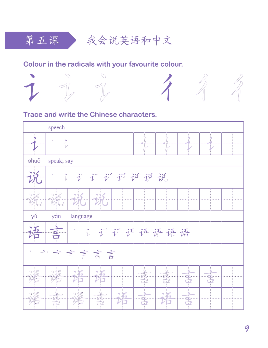 ■ Students are encouraged to sound the characters and words out while writing, and remember the meaning of these characters and words at the same time.