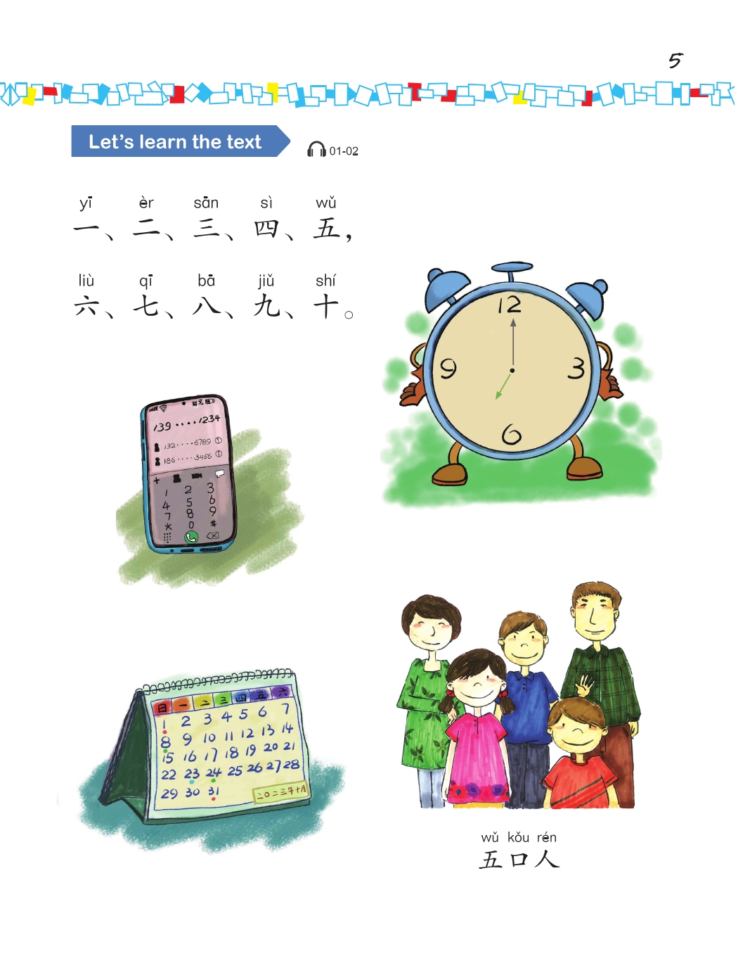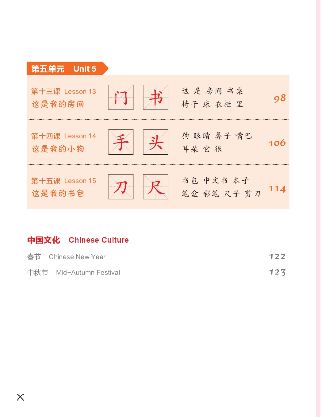 The course is designed with reference to the preschool and primary school education guidelines of China and other countries. It covers five themes: health, language, society, science and art. There are five units in each book: numbers, me and my family, school life, daily life, and home and community. The contents of the five themes are naturally integrated into the five units of each book. Chinese culture, such as traditional festivals, customs, etc. is introduced throughout the course. In addition, while teaching Chinese, this course strives to promote the development of students’ emotion, attitude, ability, knowledge, skills, etc.
