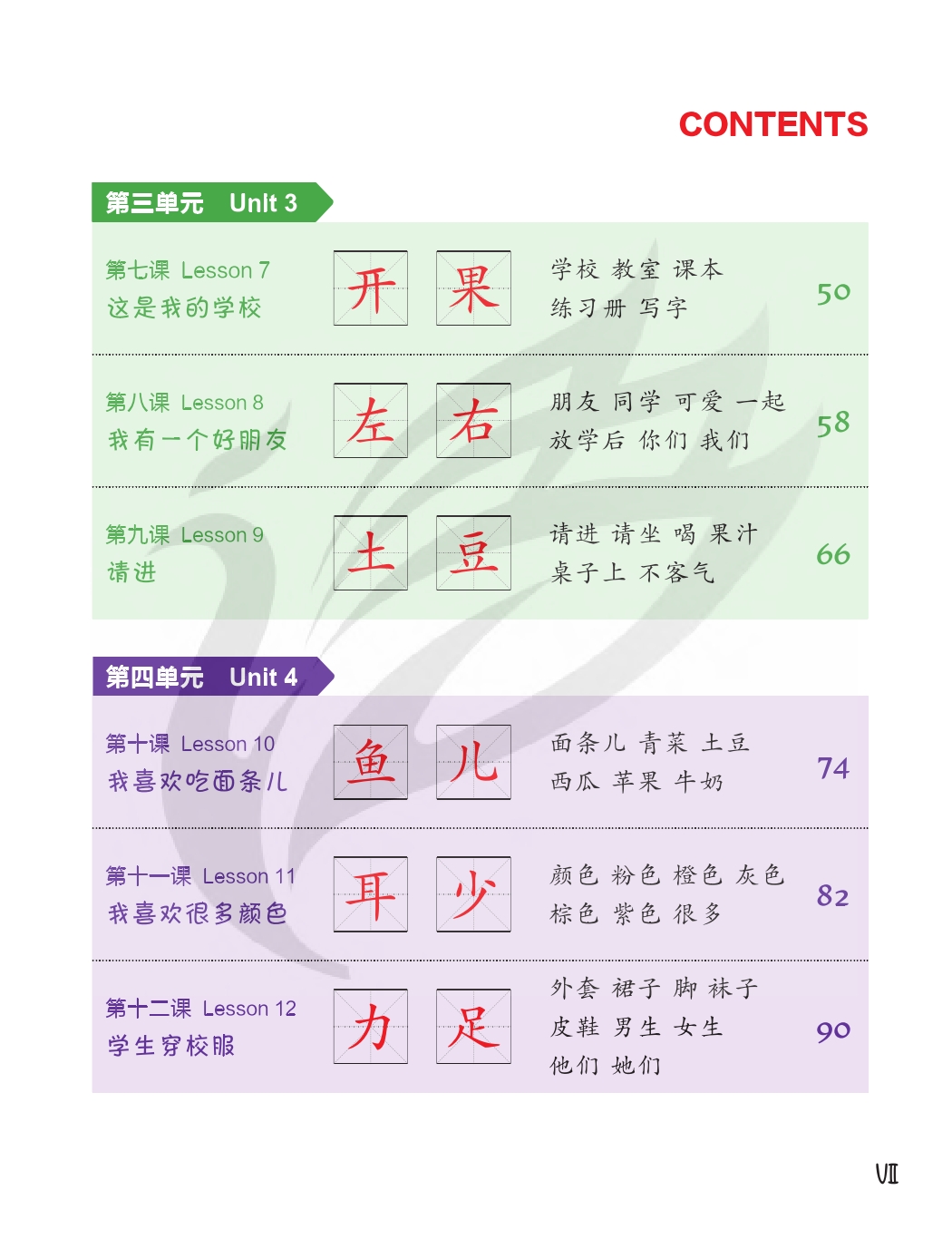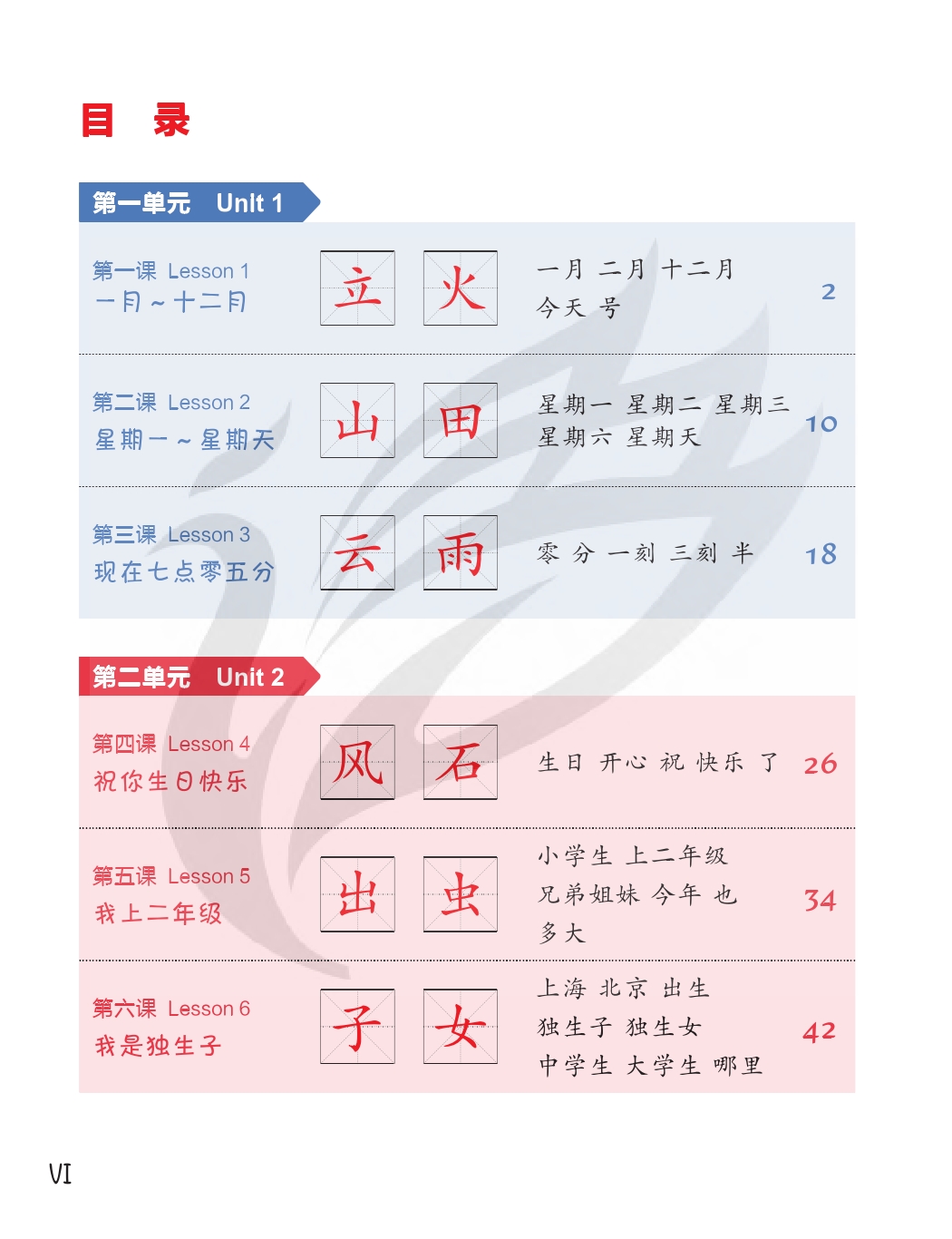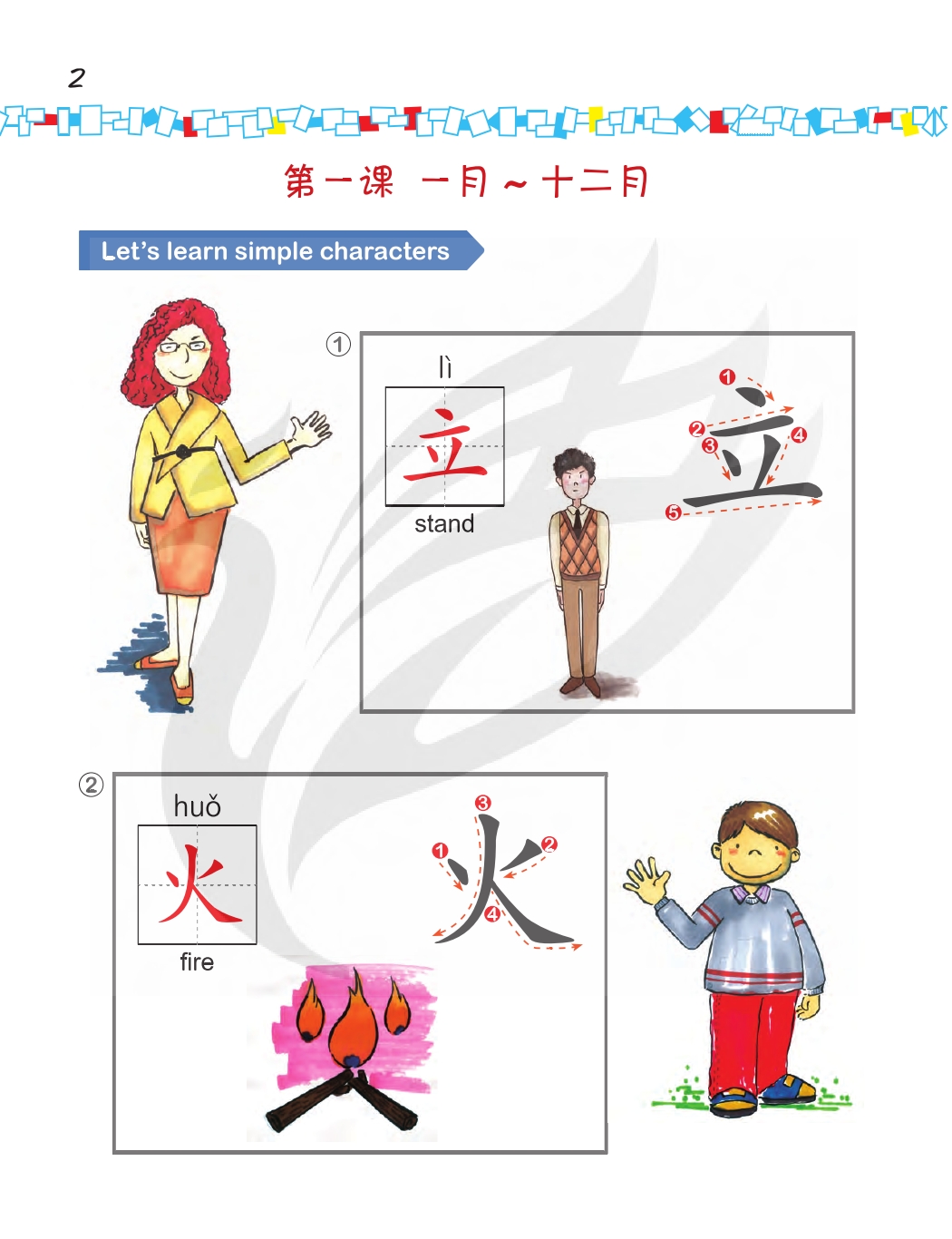 ■ In the second edition, 61 simple characters are formally taught, compared to 28 simple characters in the first edition. Learning simple characters is the “stepping stone” for learning Chinese characters. Once a certain number of simple characters are mastered, students will learn compound characters more easily and confidently. The teacher should encourage students to memorize the pronunciation, shape and meaning of each simple character.