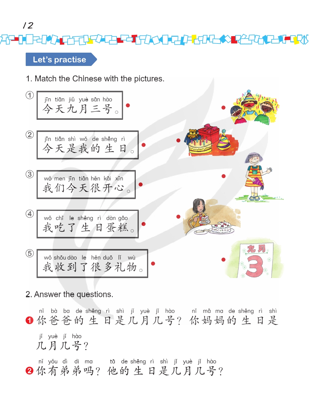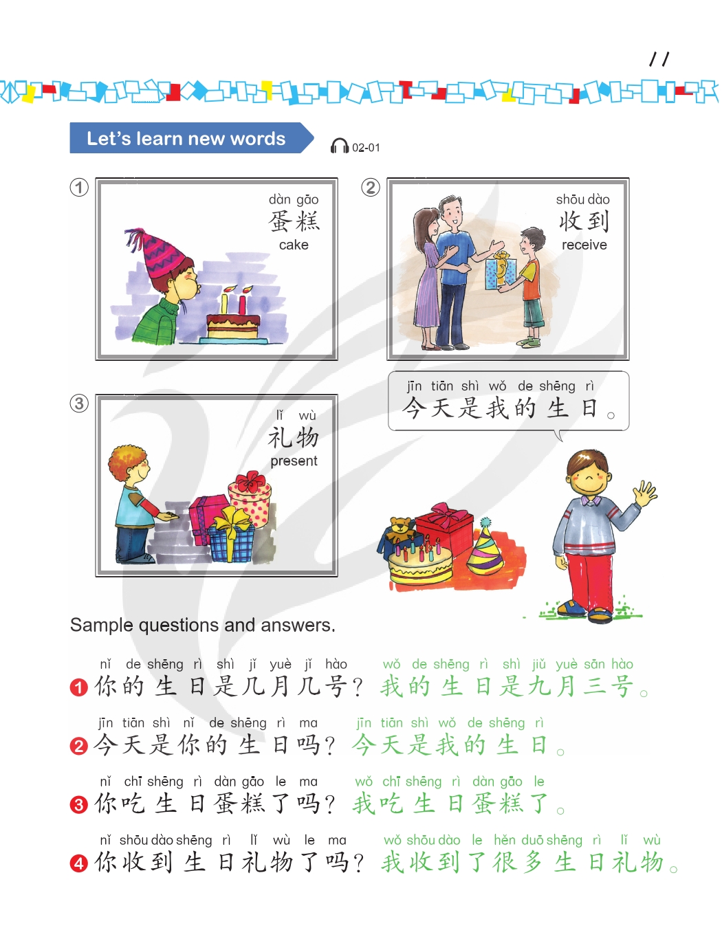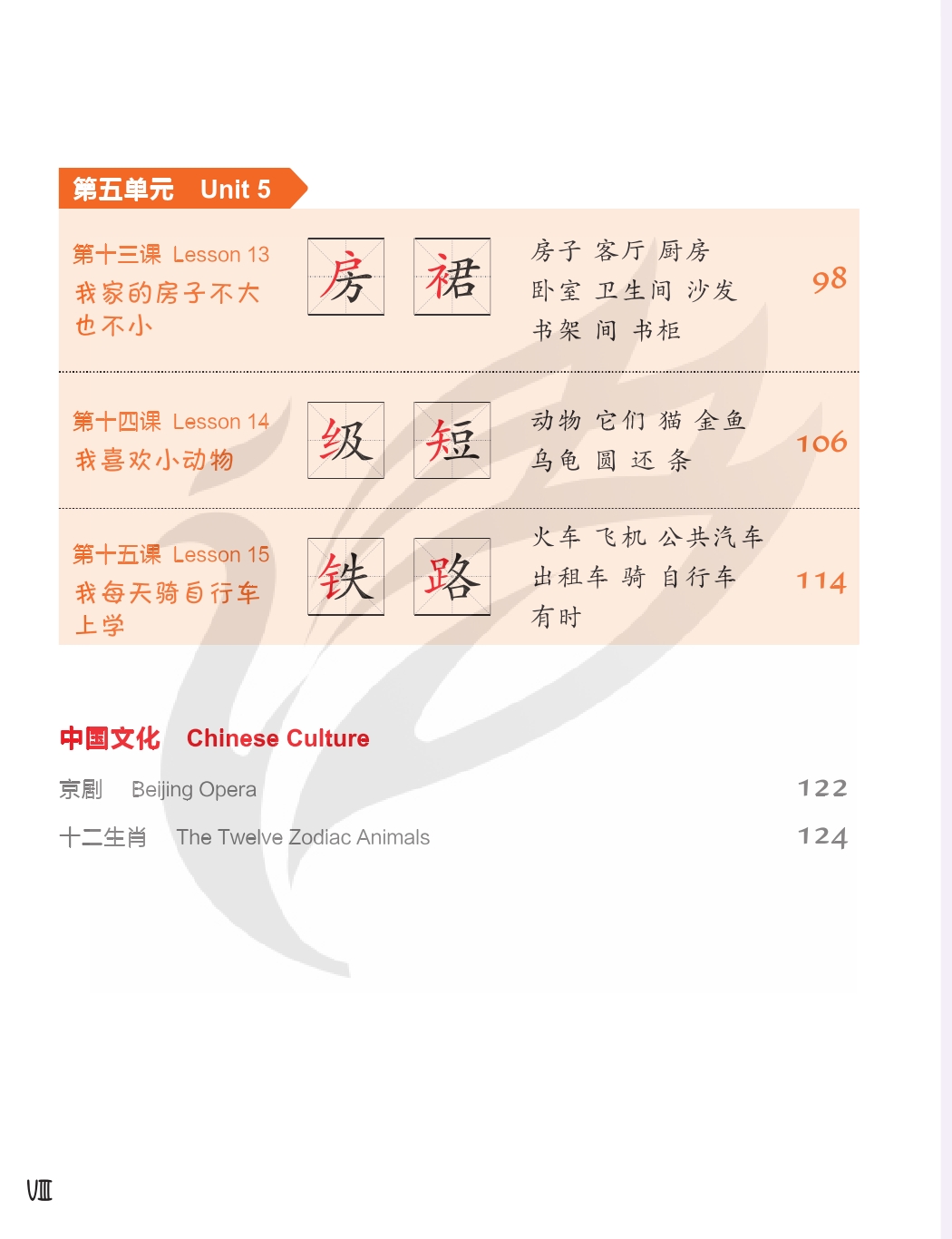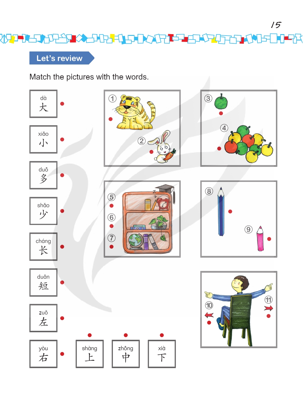 The Textbook plays an important role in helping students gain knowledge of the Chinese language needed to develop their communicative competence. The Workbook takes a supporting role, providing various age-appropriate and interesting exercises and activities that serve as meaningful practice and reinforcement.