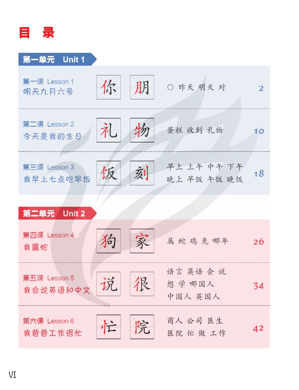 ■ In the second edition, 61 simple characters are formally taught, compared to 28 simple characters in the first edition. Learning simple characters is the “stepping stone” for learning Chinese characters. Once a certain number of simple characters are mastered, students will learn compound characters more easily and confidently. The teacher should encourage students to memorize the pronunciation, shape and meaning of each simple character.