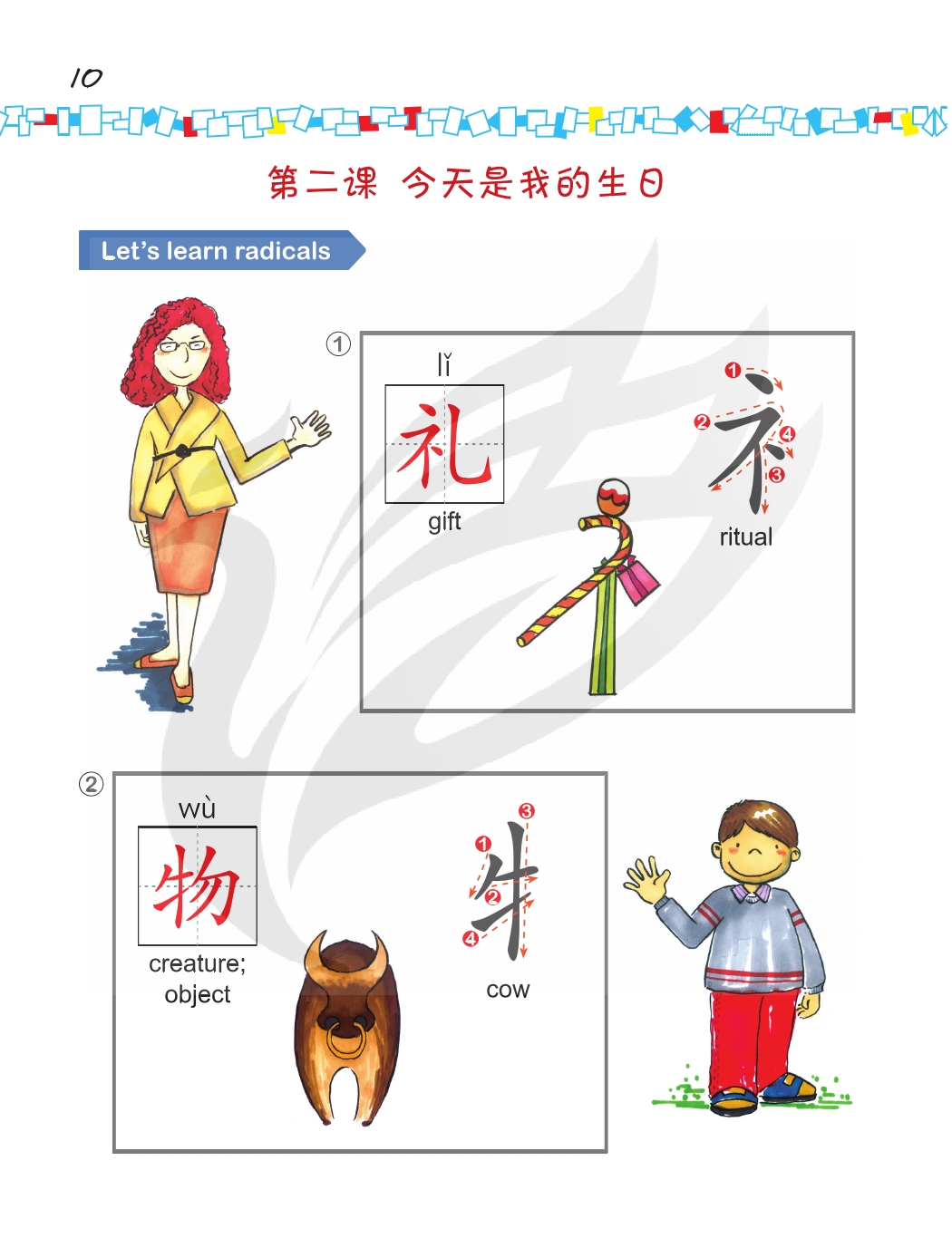 ■ The radical is an important component of most compound characters, and mastering radicals is very helpful for learning Chinese characters. Teaching experiments indicate that it is difficult to teach radicals in lower grades, therefore radicals are introduced starting Book 3. In this way, students can learn new compound characters more easily while reviewing the ones learned in Books 1 and 2.