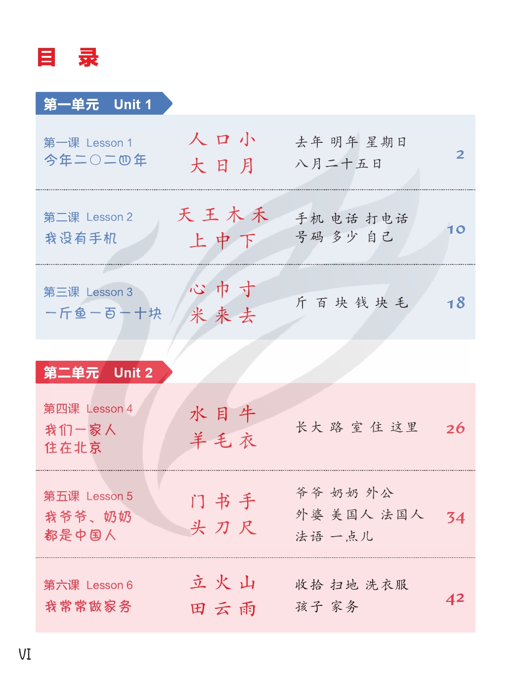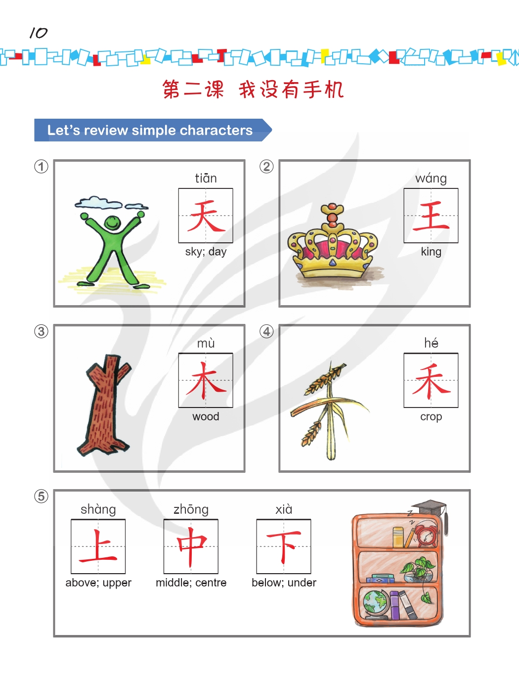 ■ In the second edition, 61 simple characters are formally taught, compared to 28 simple characters in the first edition. Learning simple characters is the “stepping stone” for learning Chinese characters. Once a certain number of simple characters are mastered, students will learn compound characters more easily and confidently. The teacher should encourage students to memorize the pronunciation, shape and meaning of each simple character.