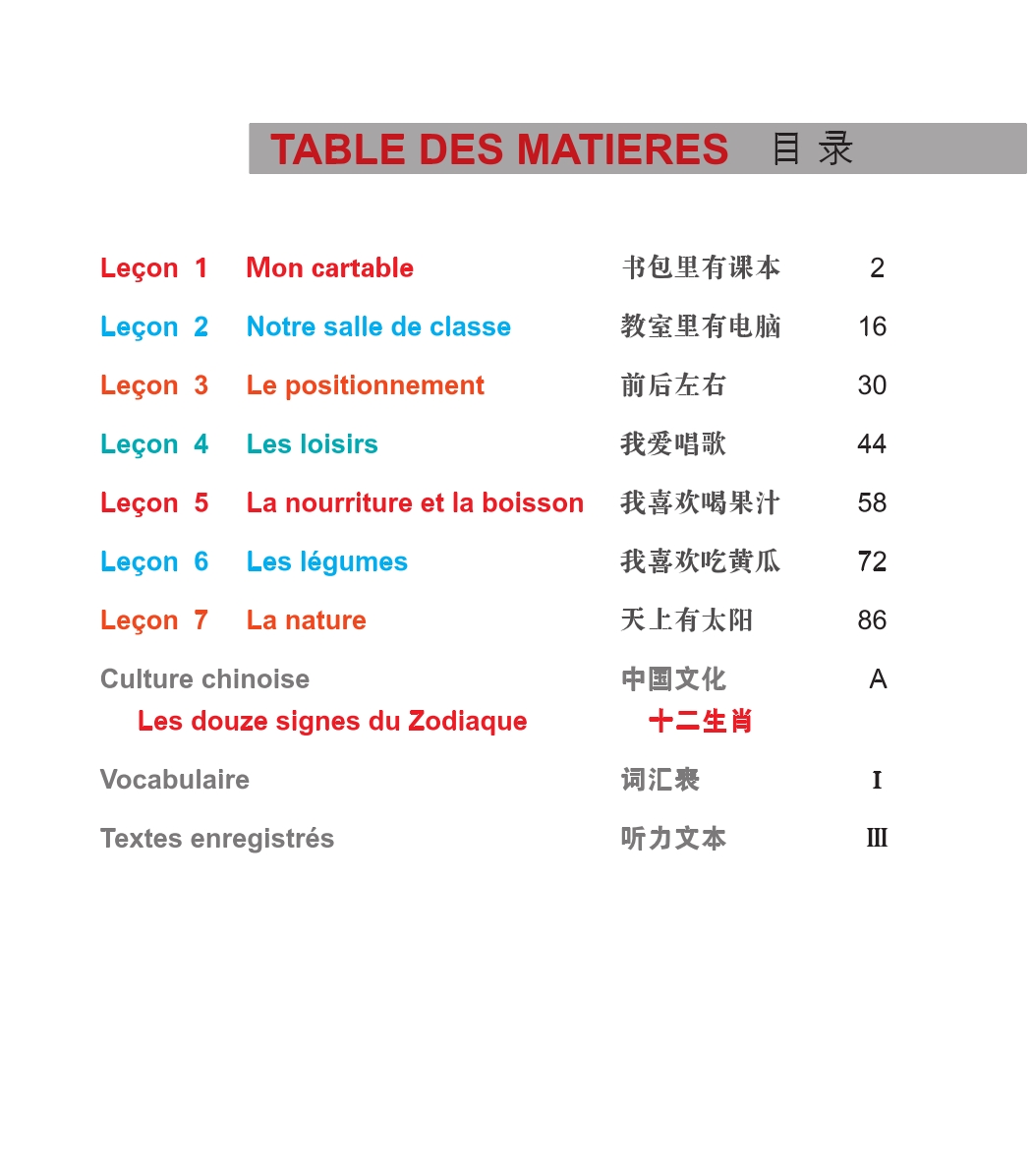 This is the French edition of Textbook 3b in the series, which is beautifully illustrated and printed in full color. It has altogether 7 lessons encompassing such topics as stationery, school facilities, positions, hobbies, food & drink, and nature. In this volume, we’ll go on with the learning of initials and compound finals of Chinese syllables. Each lesson teaches two single characters and provides more exercises on character writing, sentence making and simple composition as well as specialized listening exercises to further improve students’ integrated language skills.