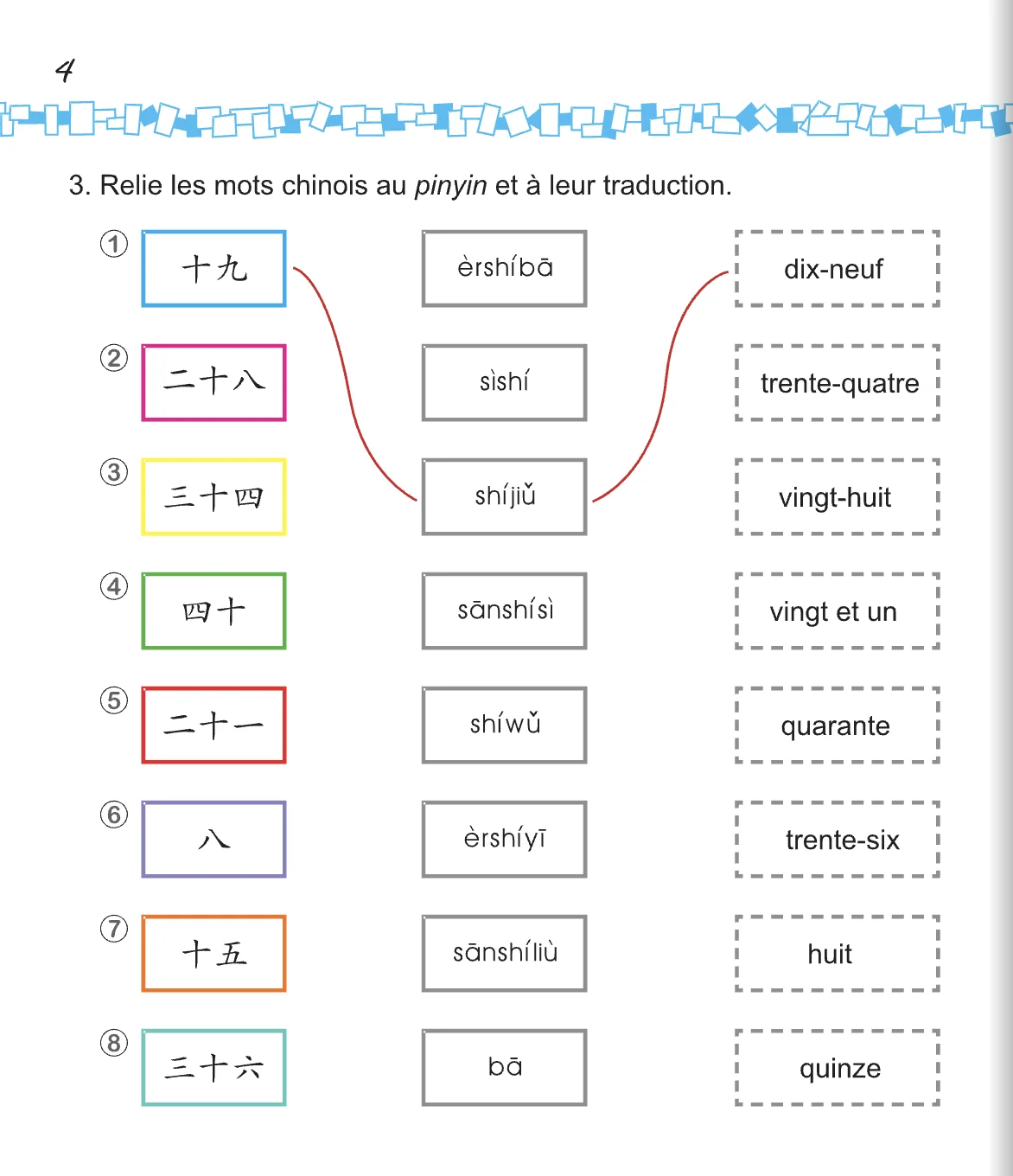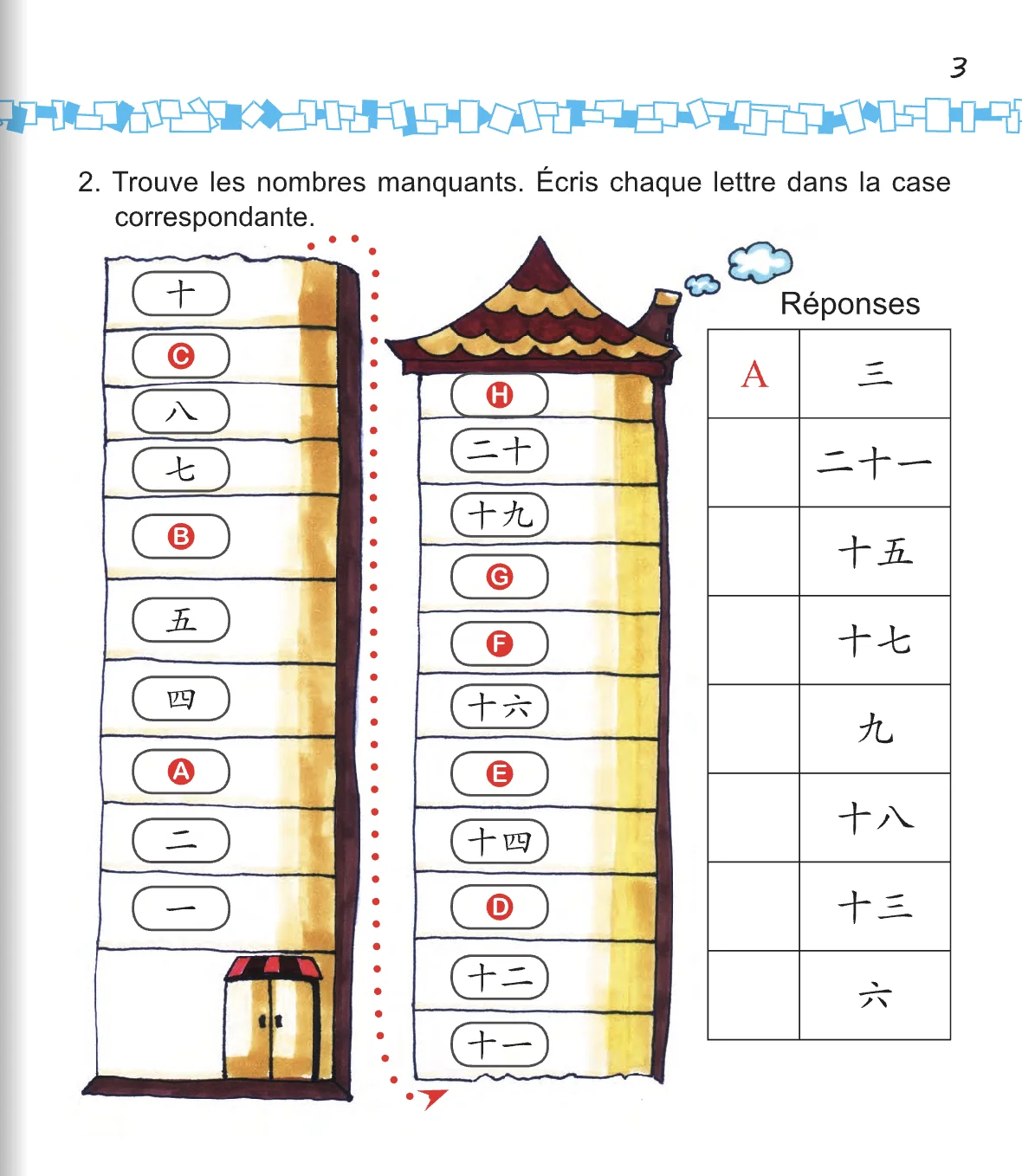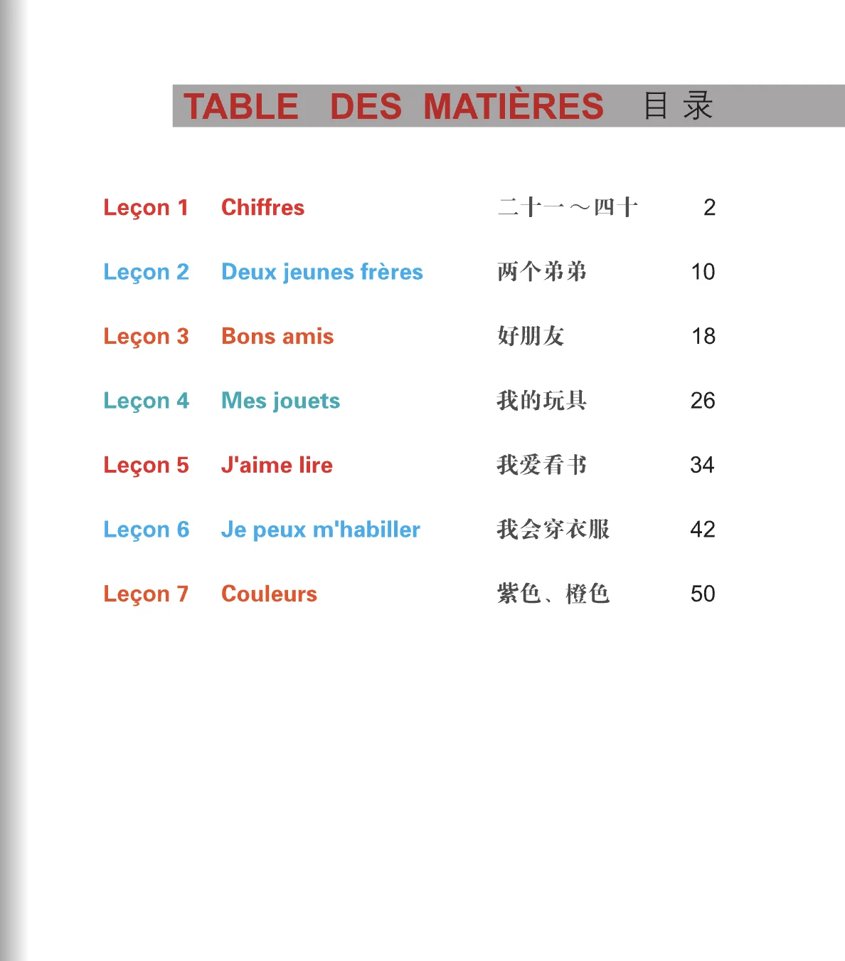 This is Workbook 2a (French Edition) in the series, a beautifully designed full-color book with altogether 7 lessons encompassing such topics as numbers, brothers and sisters, friends, toys, hobbies, daily routines and colours, etc. Considering the physical and psychological characteristics of kids in Grade 2, the Workbook provides a bunch of simple exercises, such as numbering, matching, coloring and drawing, in order to teach the kids Chinese knowledge as well as train their abilities of thinking and practice.