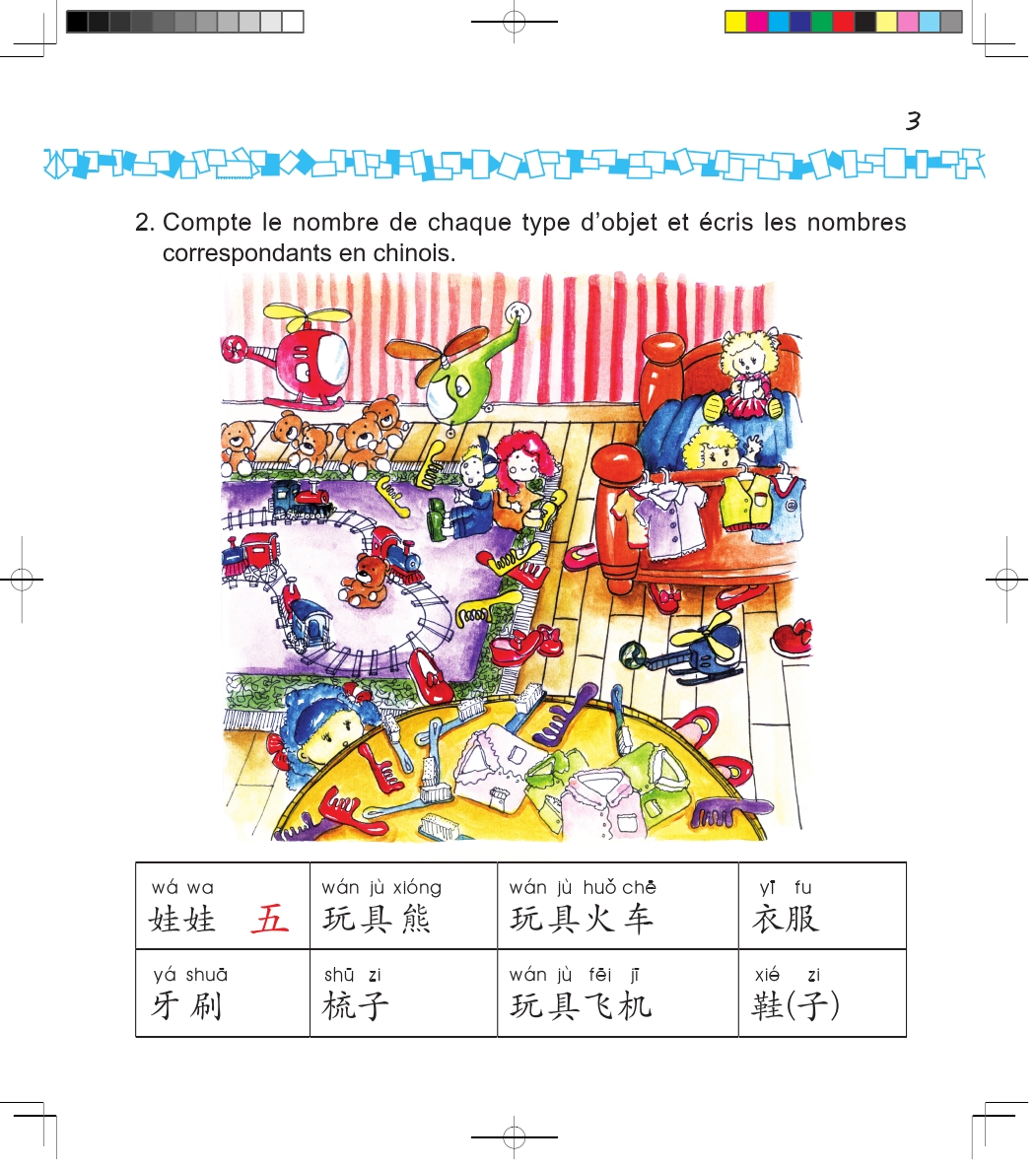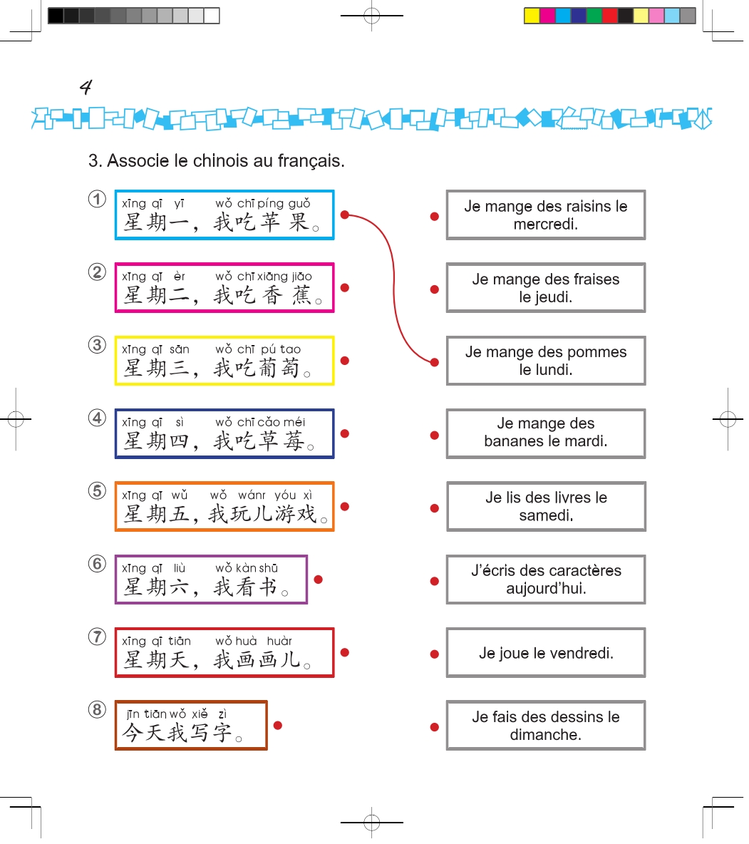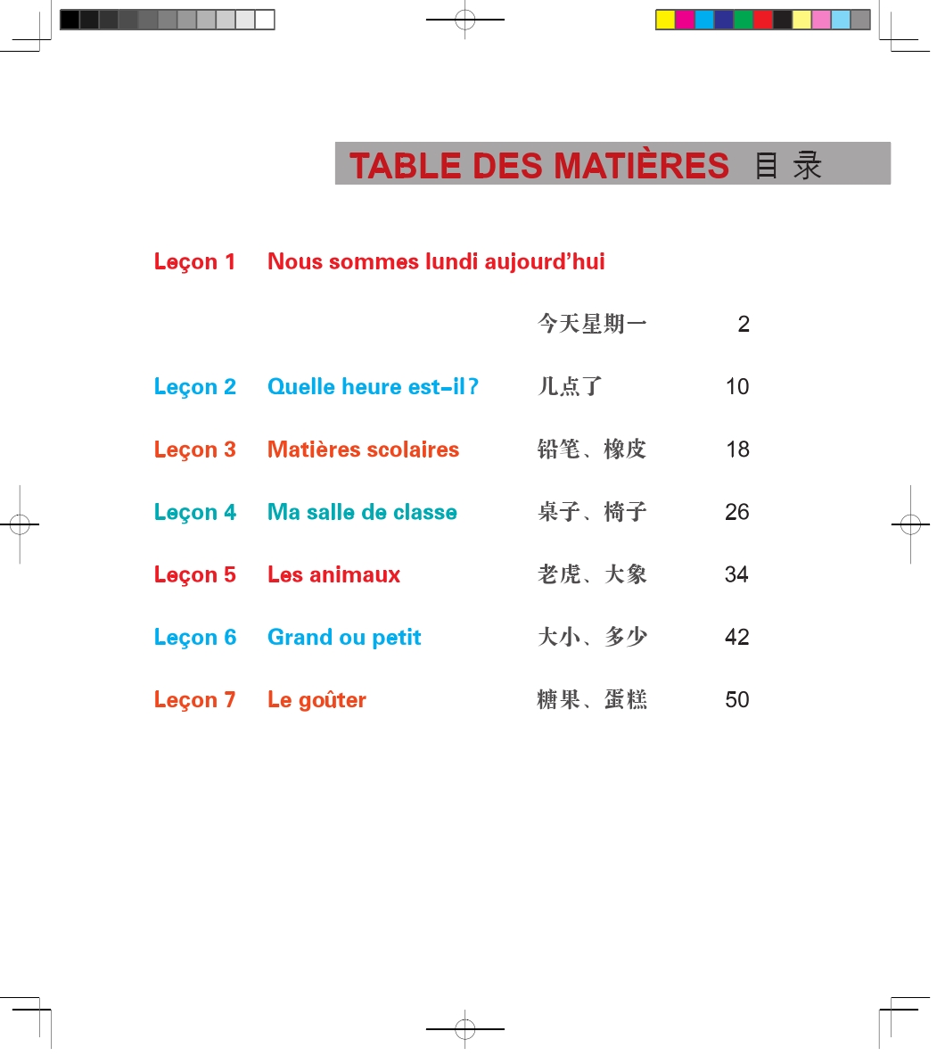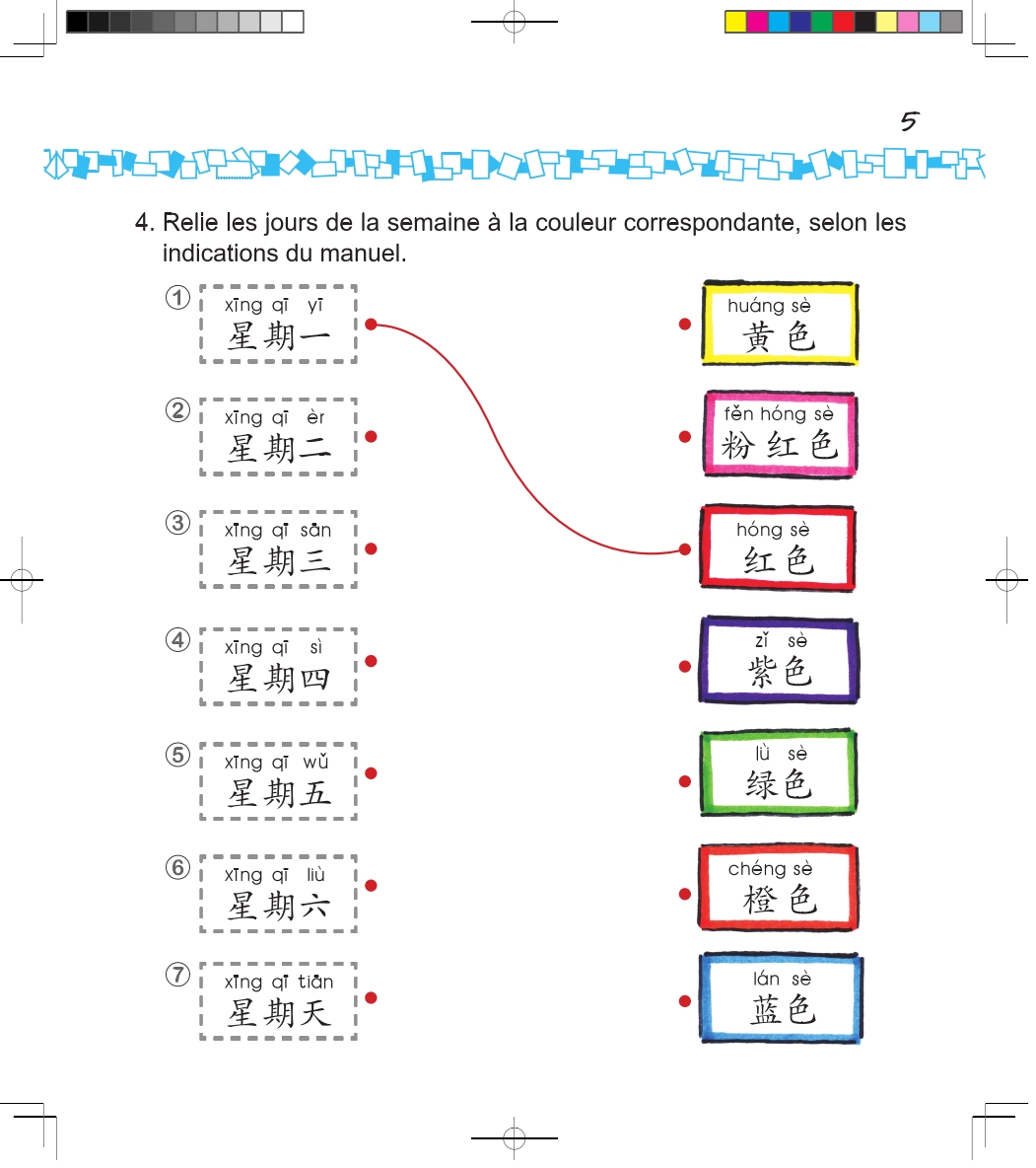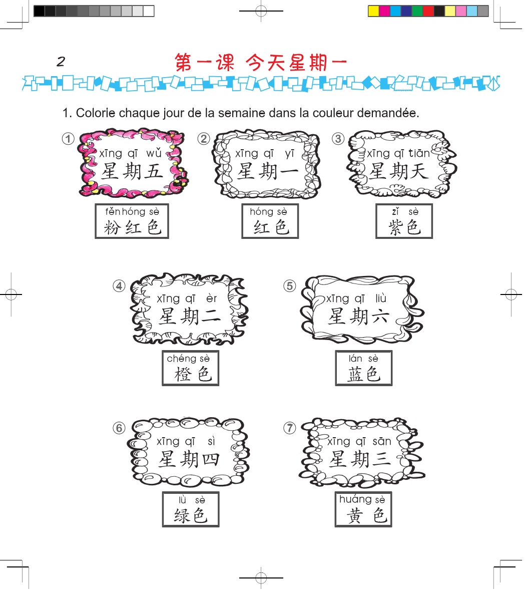 This is Workbook 2b (French Edition) in the series, a beautifully designed full-color book with altogether 7 lessons encompassing such topics as days of the week, time, stationery, classroom, animals and snacks, etc. Considering the physical and psychological characteristics of kids in Grade 2, the Workbook provides a bunch of simple exercises, in order to teach the kids Chinese knowledge as well as train their abilities of thinking and practice.