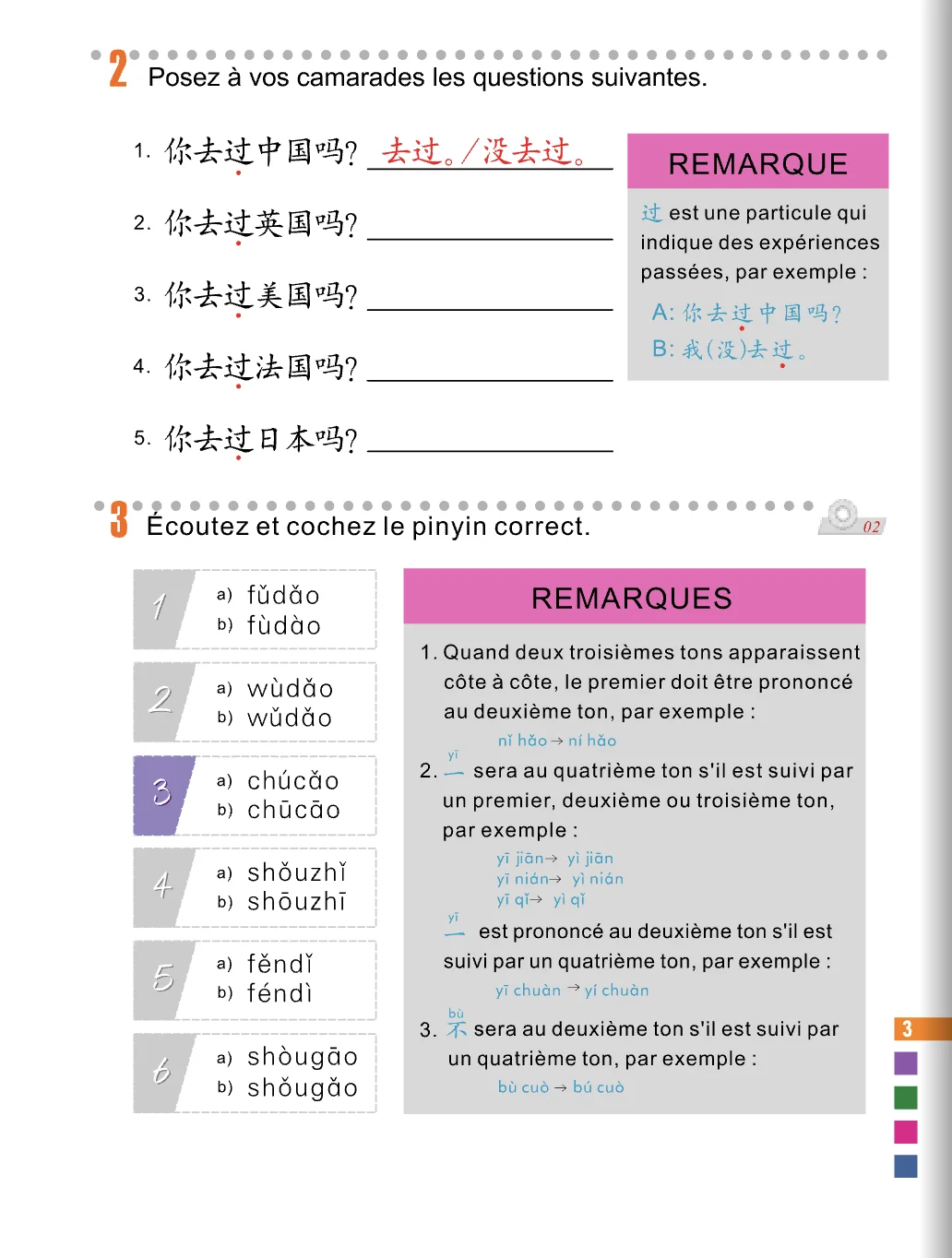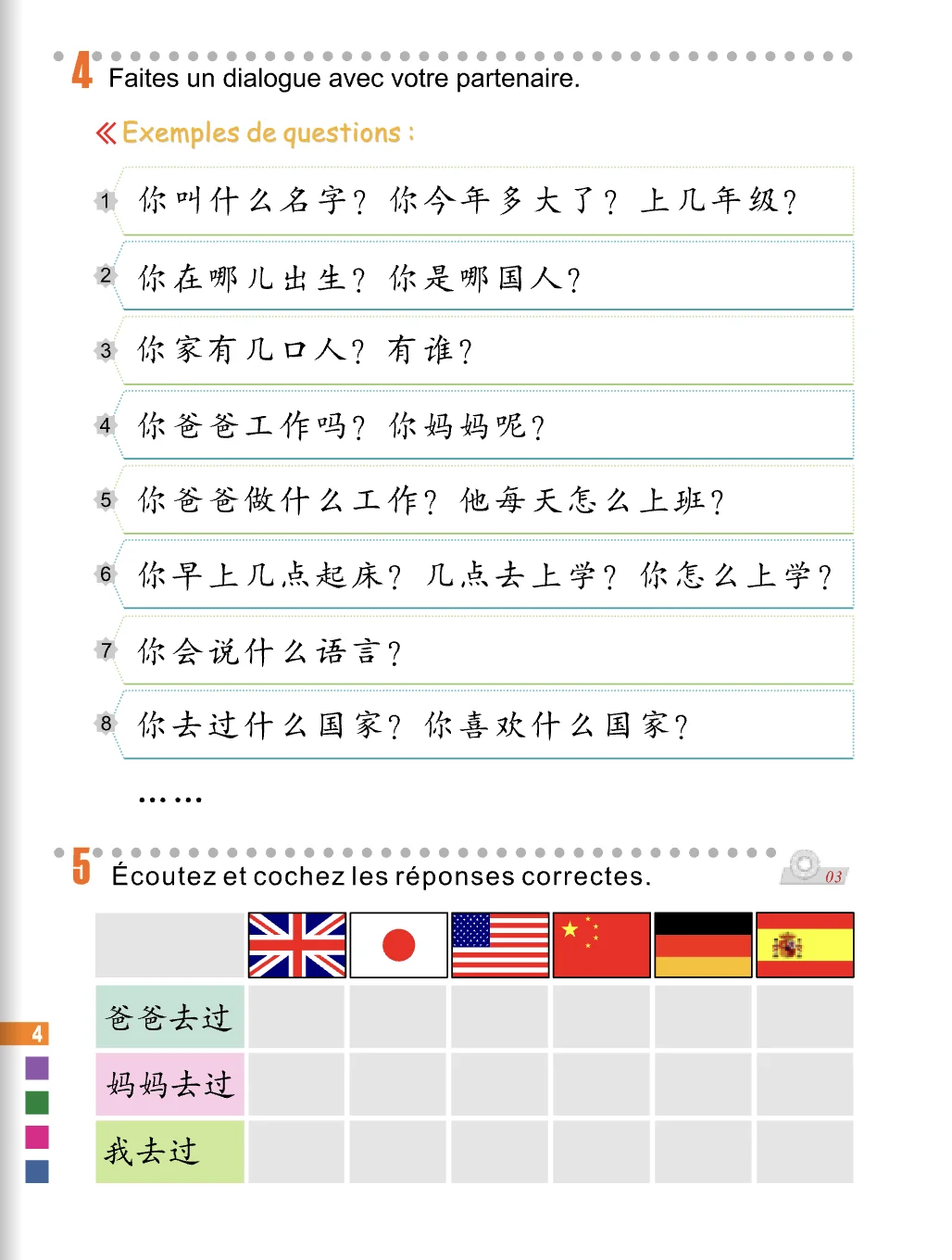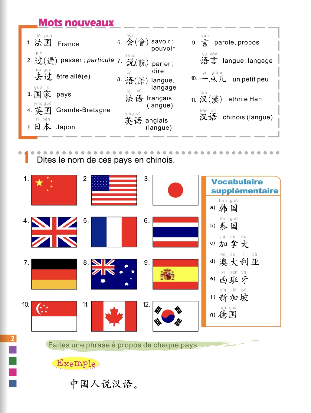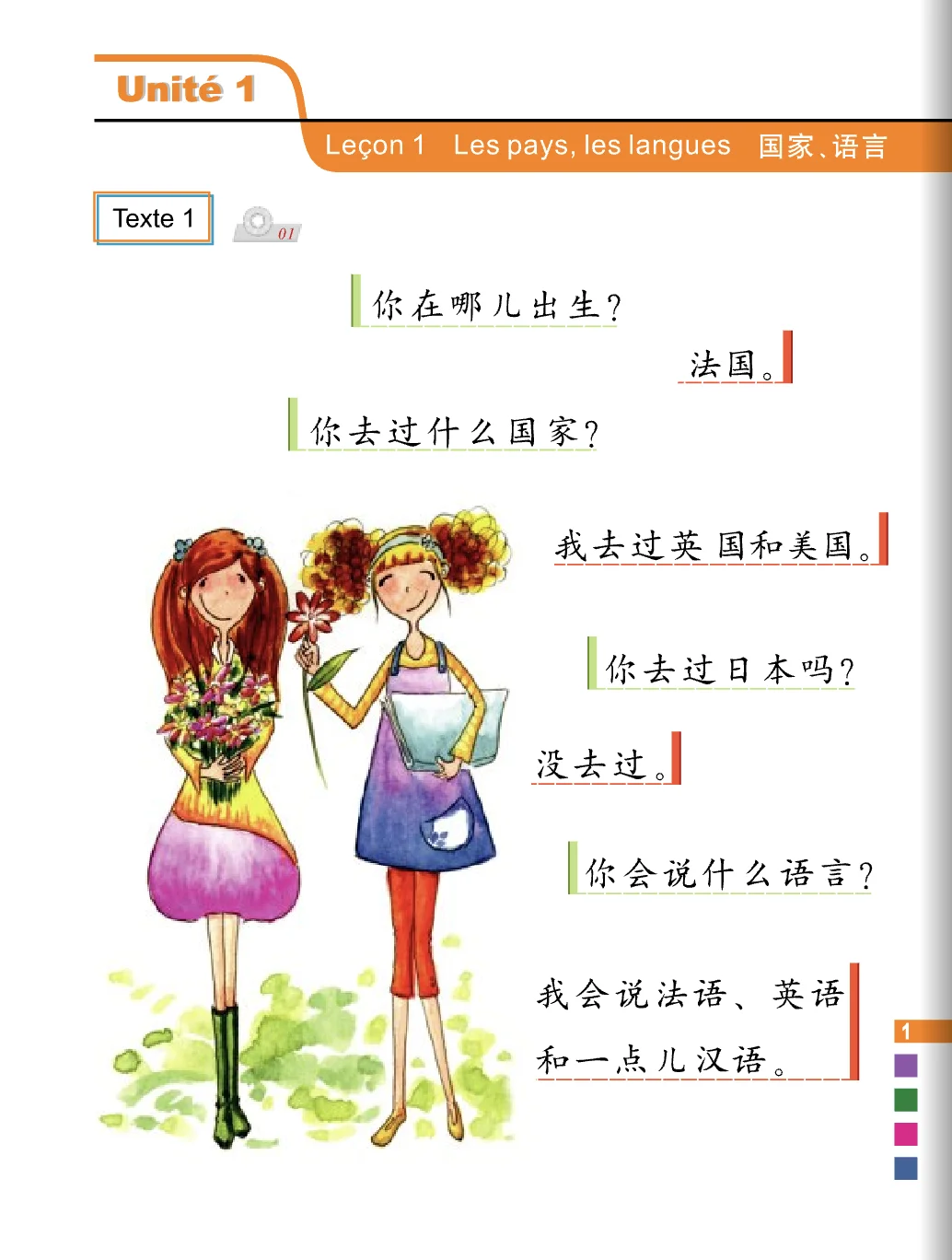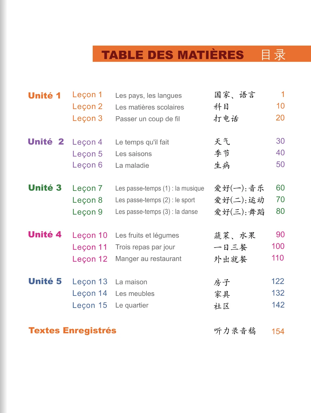 This is Textbook 2 (French Edition) in the series with altogether 5 units (three lessons in each unit) encompassing such topics as “country, language”, “subjects”, “weather”, “hobbies”, “daily meals”, etc.