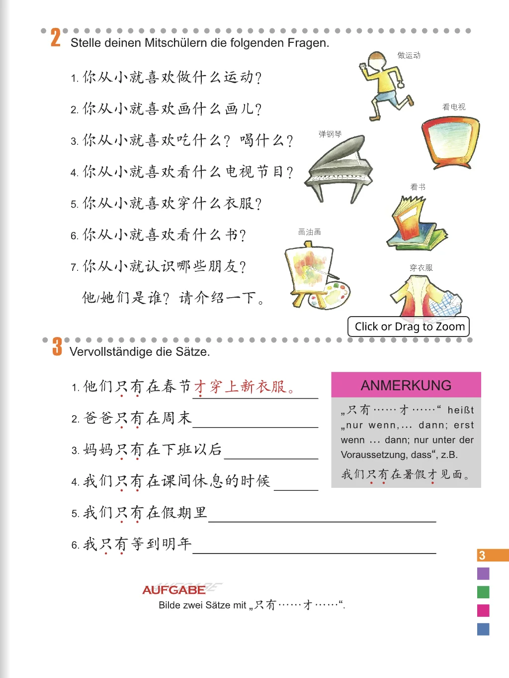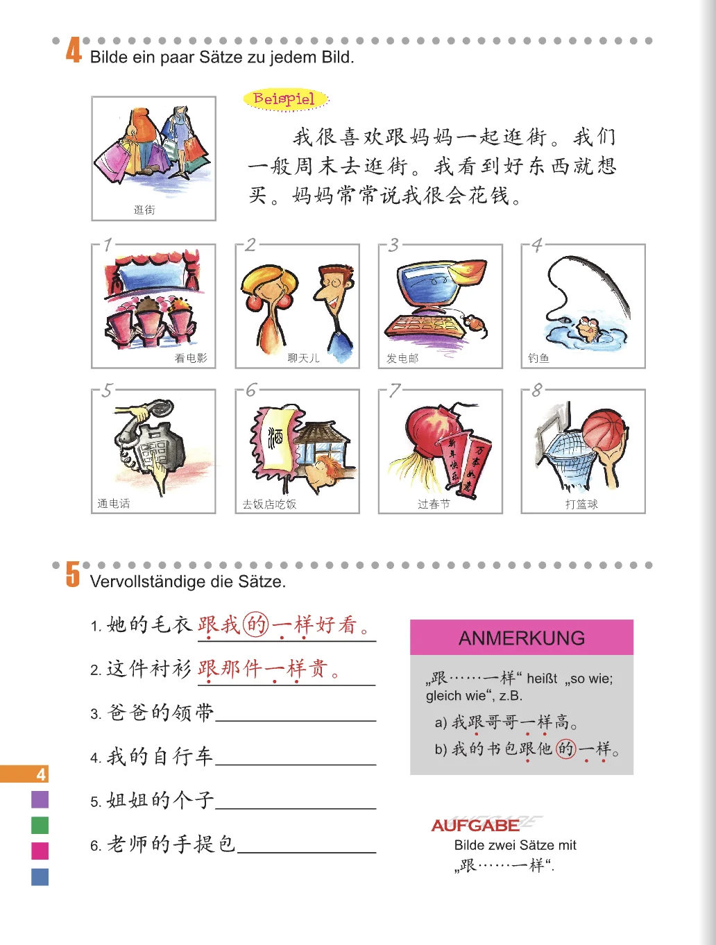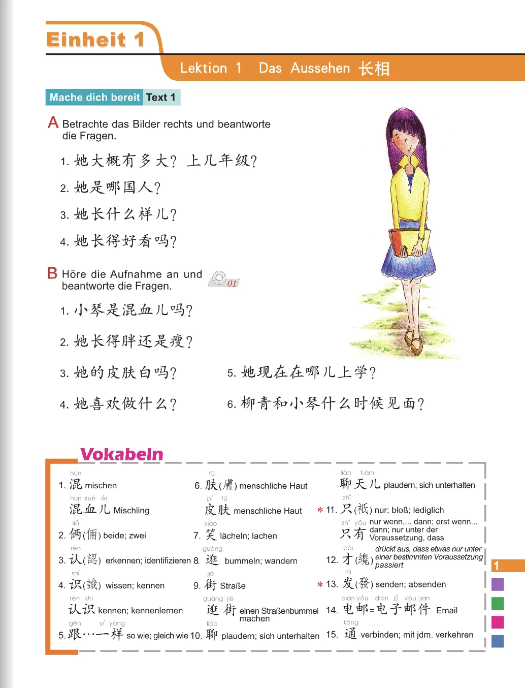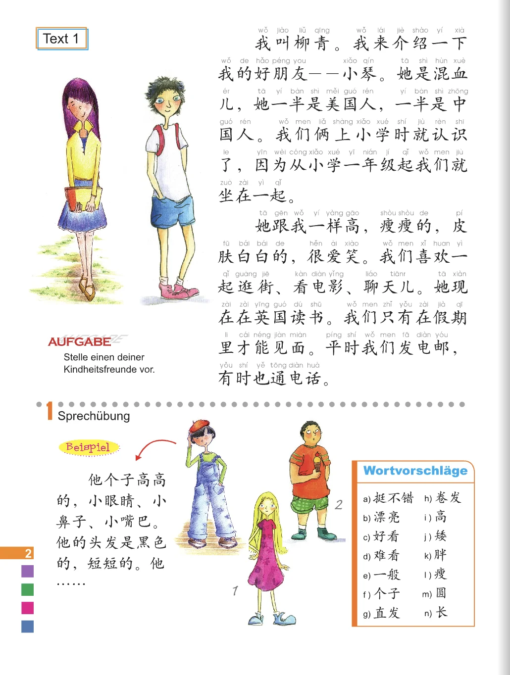 This is Textbook 4 of Easy Steps to Chinese (German Edition), including a total of five units, with three lessons in each, talking about “appearance, occupations, personality”, “daily routine, household chores, pets”, “schools, examinations, school events”, “delicious food, festivals, eating out” and “neighbourhood, travelling, accidents” respectively. It is a full-color book (1 CD included) with beautiful illustrations, practical conversations and short texts, enabling students to use Chinese fluently and accurately in simple communication.