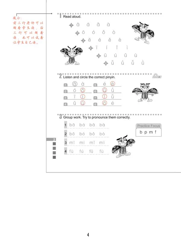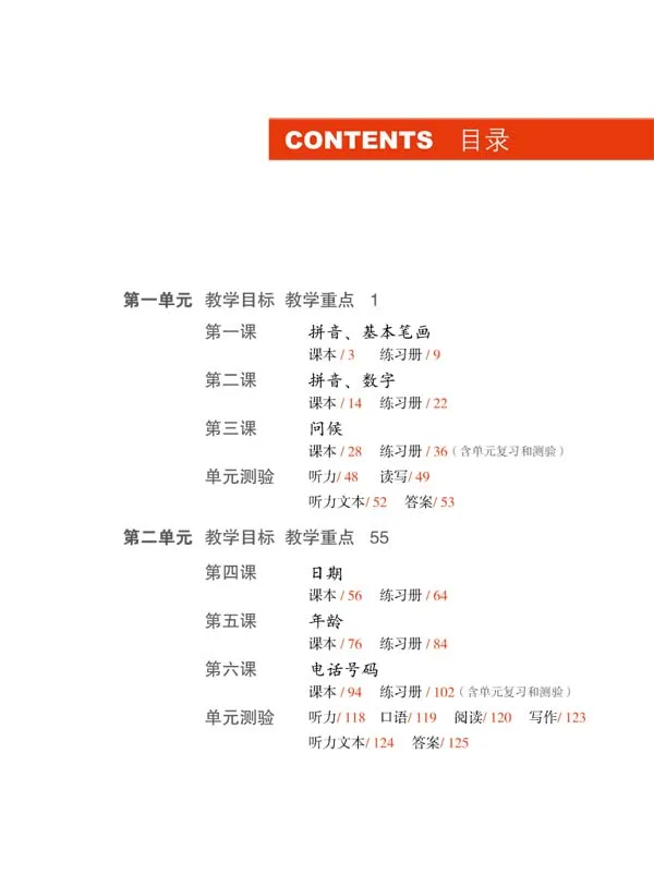 The teaching purpose and teaching focus are listed at the beginning of each unit, which will help teachers to focus on the key points when they prepare and teach lessons and achieve the teaching purpose. Listening, oral and writing examinations are designed in this book to help teachers know how well students learn each unit and develop their language communication skills. Referring to testing modes in other countries, the author tried to use these unit tests to evaluate students’ command of Chinese and their abilities to use this language.
