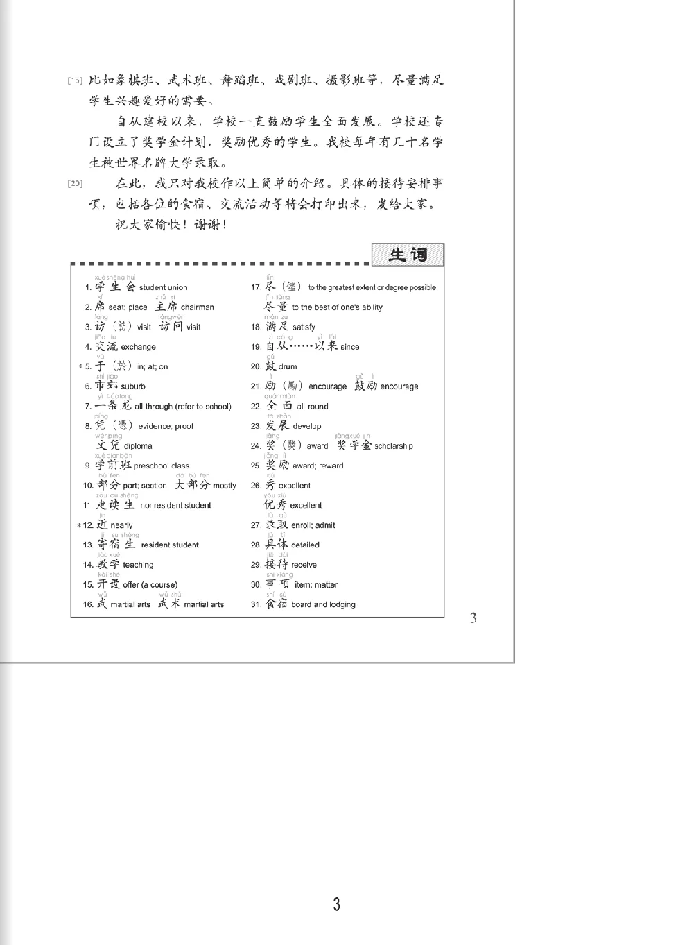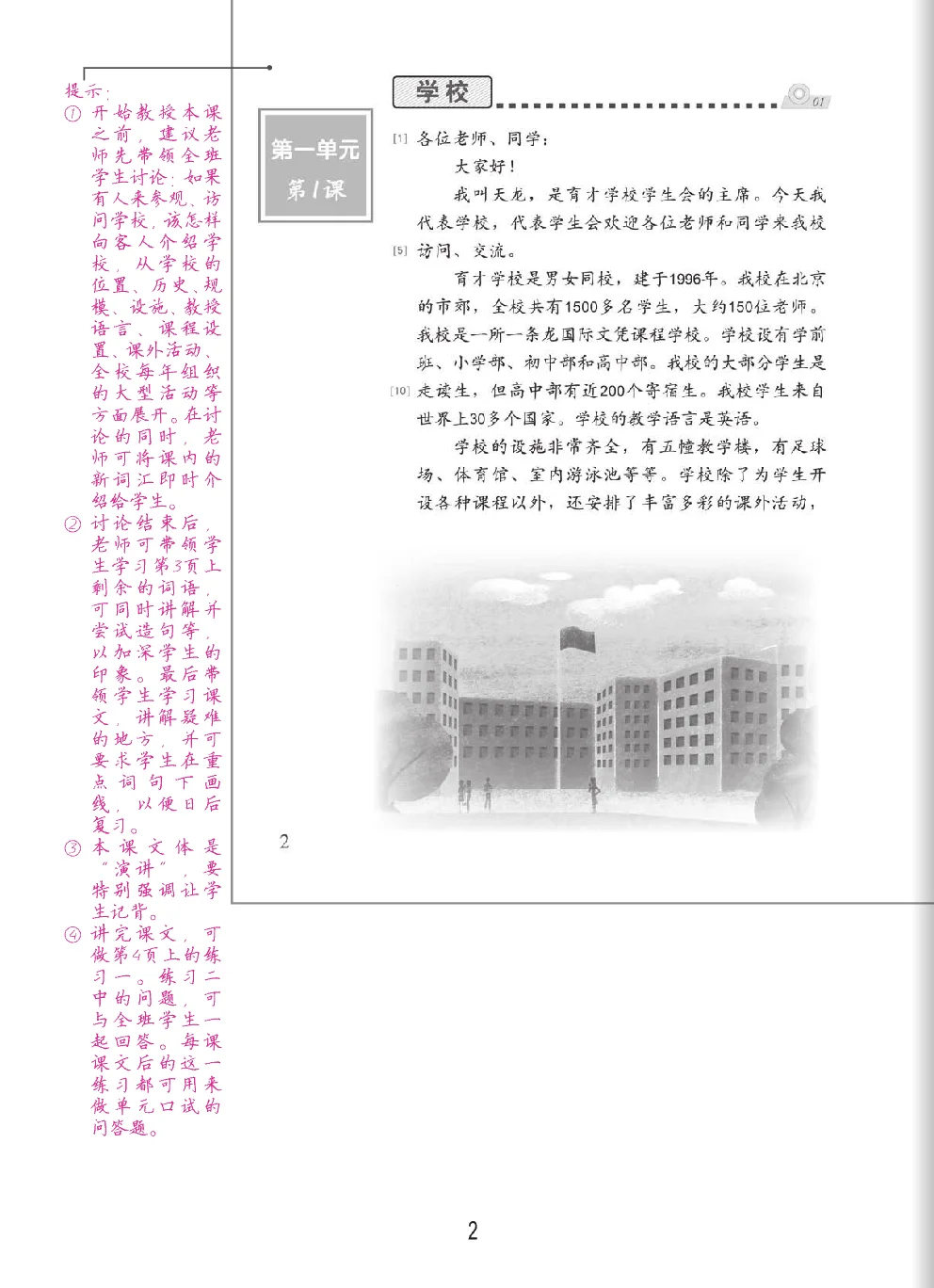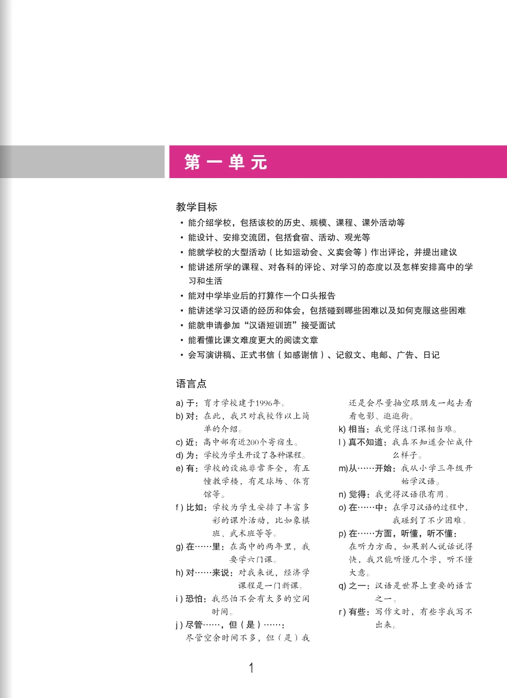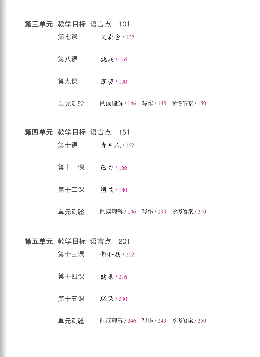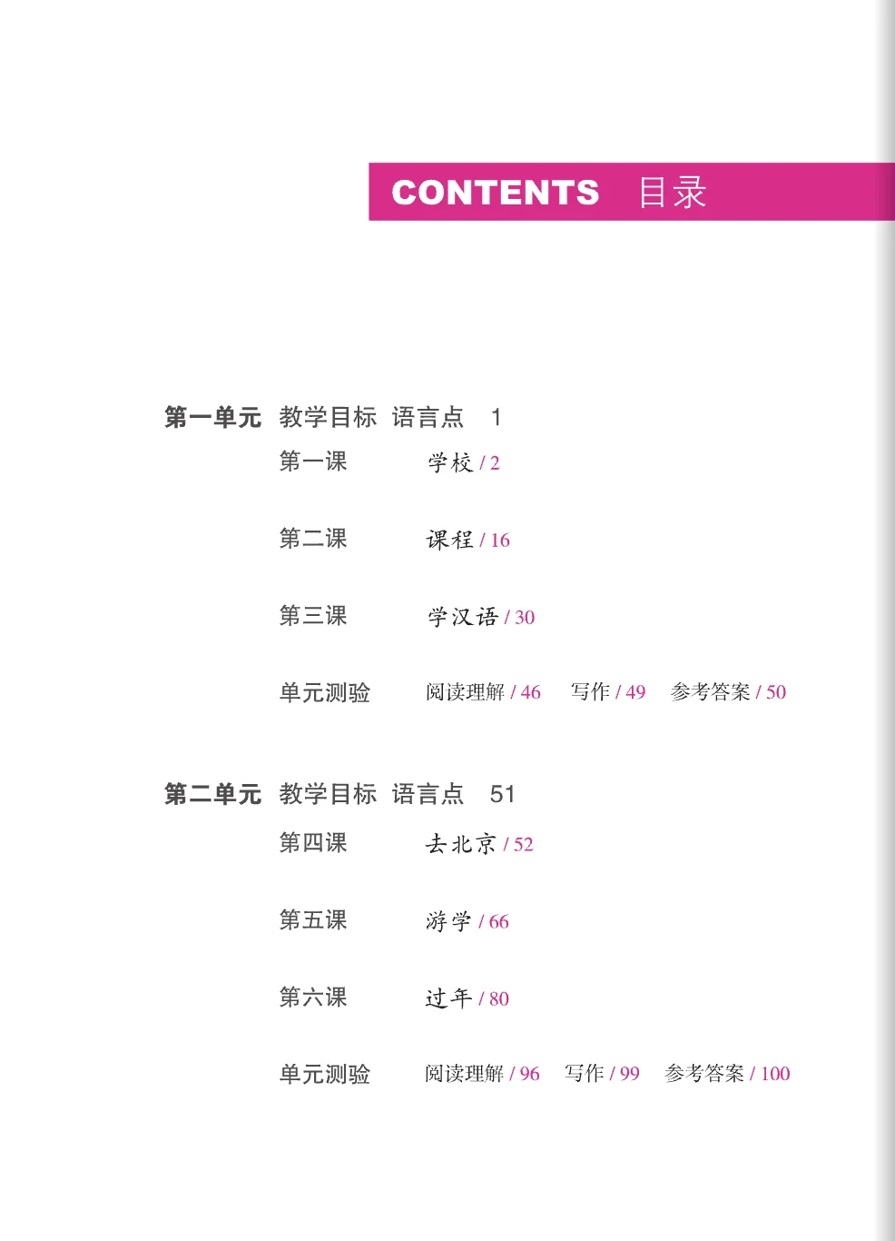 The teaching purpose and language points are listed at the beginning of each unit to help teachers focus on the key points when preparing or teaching the lesson and achieve the teaching purpose. To comprehensively test the students’ mastery of each unit and their ability of communication, the book provides unit tests of reading and writing, which are designed with reference to the test types in many other countries so that the results can be closest to the students’ actual Chinese proficiency and communicative ability. As for oral testing, teachers may use the “Oral Questions” in each unit review as reference questions to ask the students and test their speaking skills, or otherwise design some situations for the students to role-play, converse or discuss.