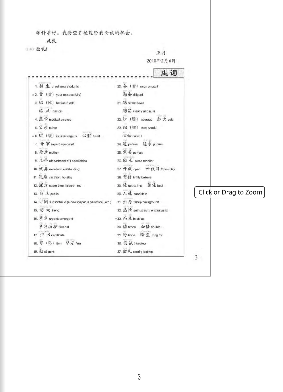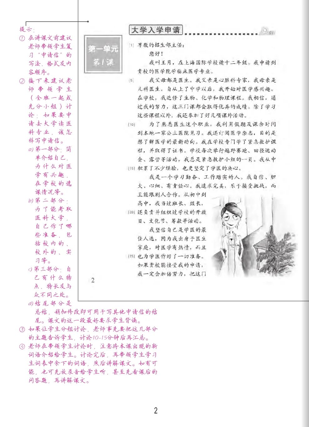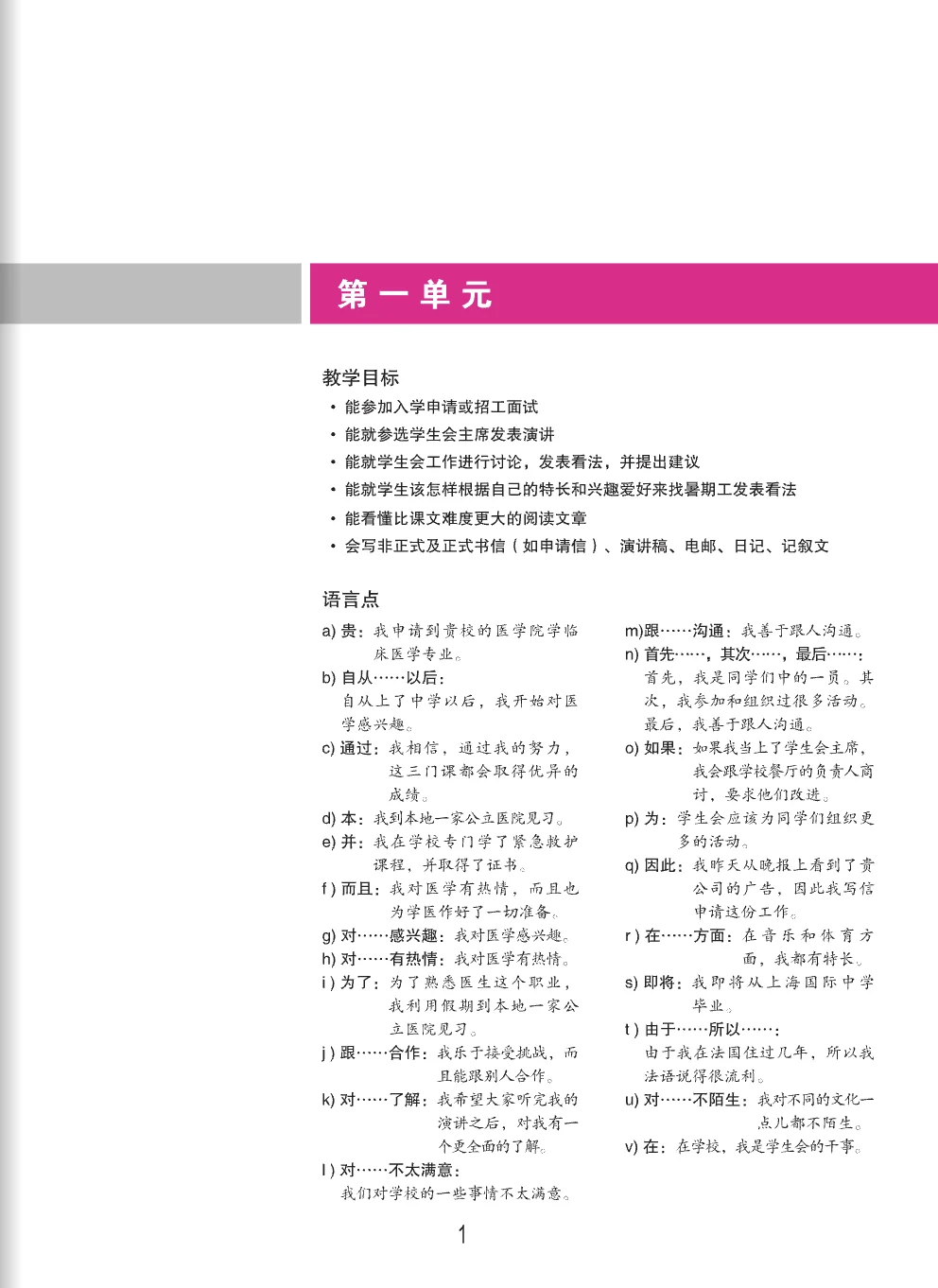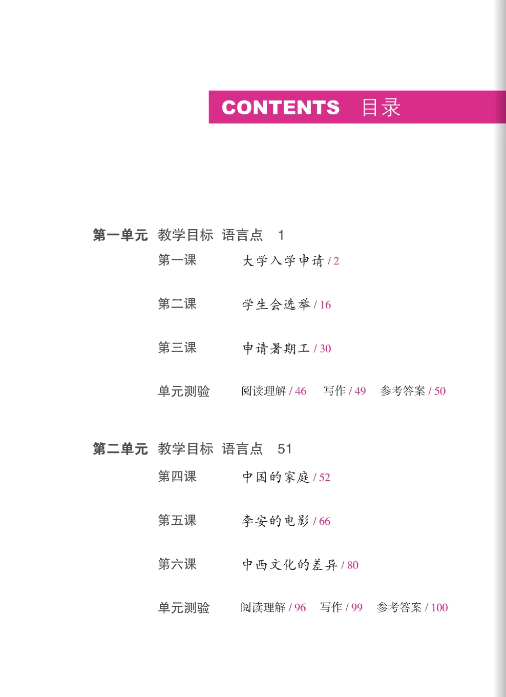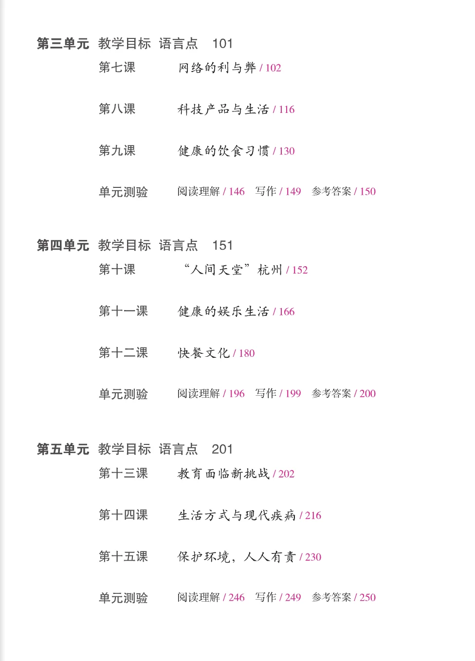 The teaching purpose and language points are listed at the beginning of each unit to help teachers focus on the key points when preparing or teaching the lesson and achieve the teaching purpose. To comprehensively test the students’ mastery of each unit and their ability of communication, the book provides unit tests of reading and writing, which are designed with reference to the test types in many other countries so that the results can be closest to the students’ actual Chinese proficiency and communicative ability. As for oral testing, teachers may use the “Oral Questions” in each unit review as reference questions to ask the students and test their speaking skills, or otherwise design some situations for the students to role-play, converse or discuss.