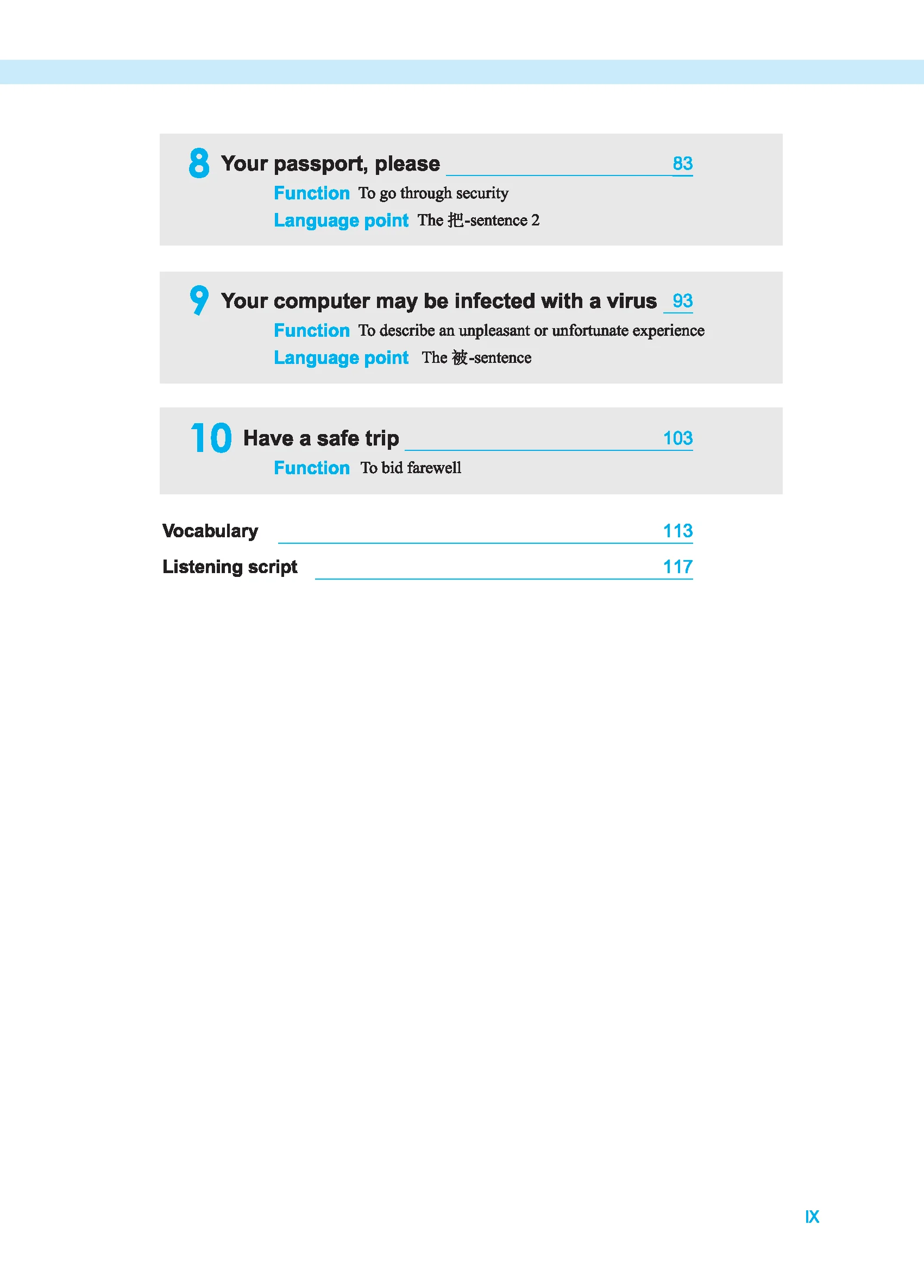 本教材为零起点普及型汉语短期进修教材。本教材主要面向来华短期进修教学项目,也适用于国内外其他各类普及型汉语进修教学项目。每册10课,建议每课3-4课时