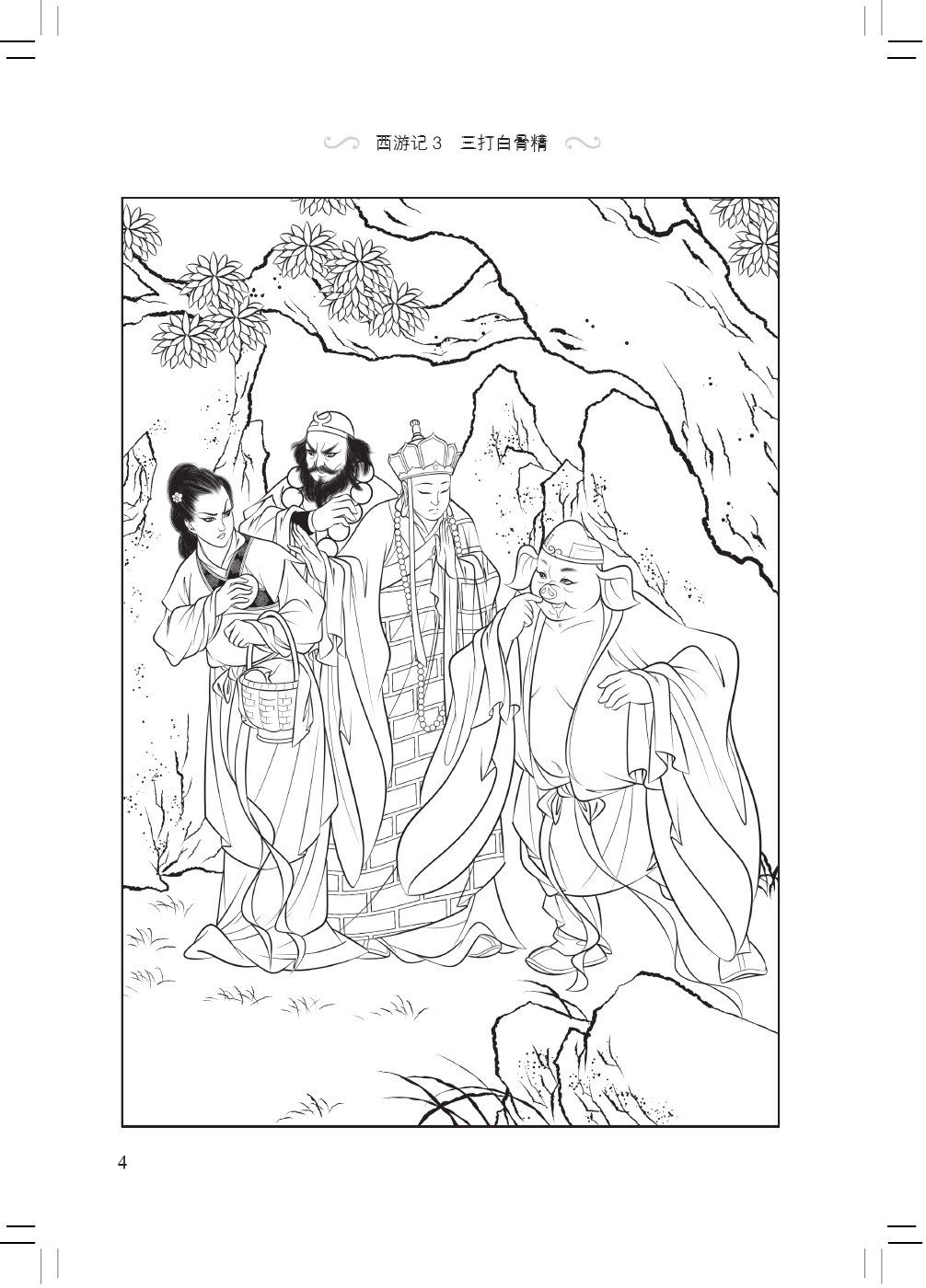 Three Battles with the White Bone Demon tells that Xuanzang and his disciples met with White Bone Demon, who transformed herself into human beings three times to cheat Xuanzang, but she was identified and killed by Monkey King. Xuanzang thought Monkey King a murder and drove him away. Zhu Bajie the Pigsy and Monk Sha couldn't defeat the evil and had to ask Monkey King back. Monkey King came and rescued his Master.
