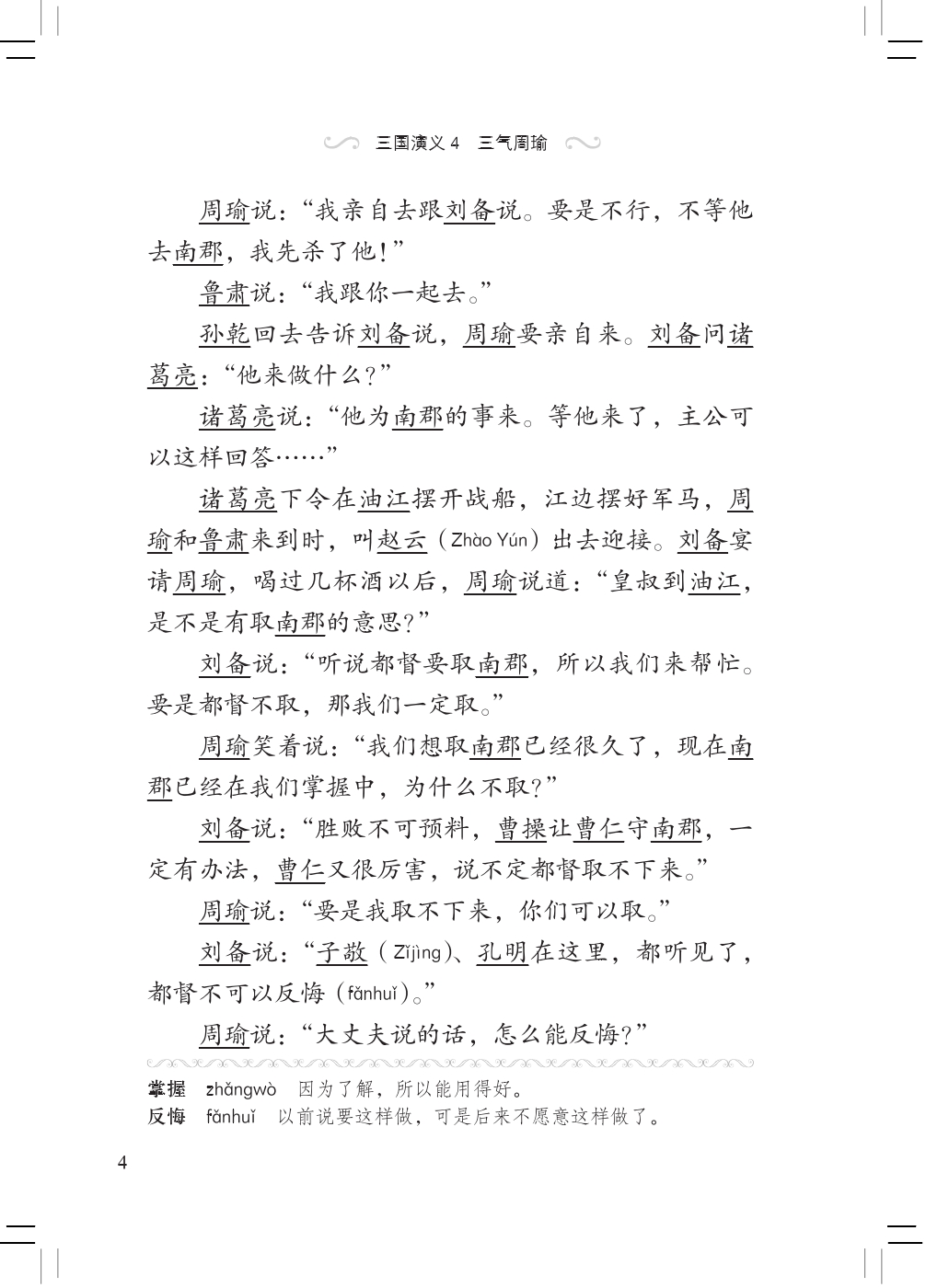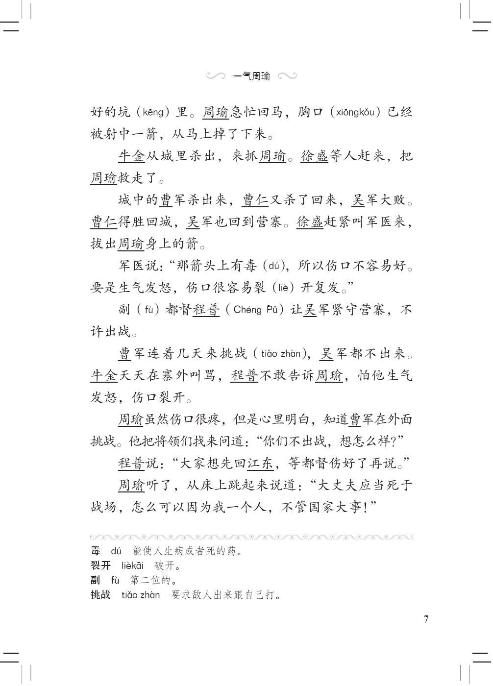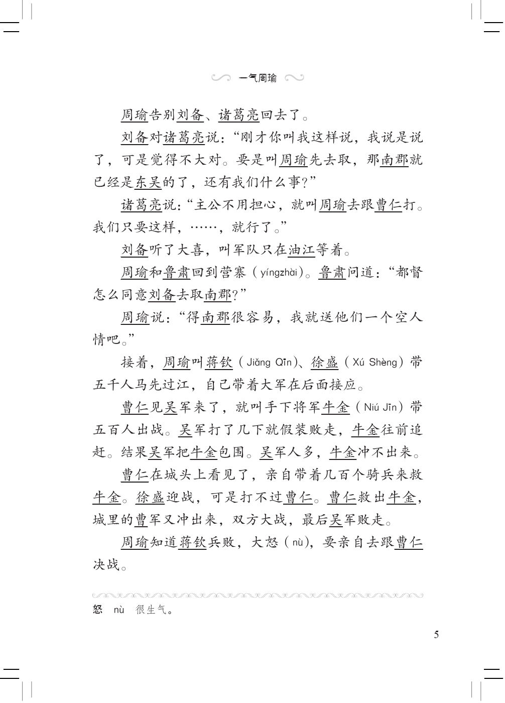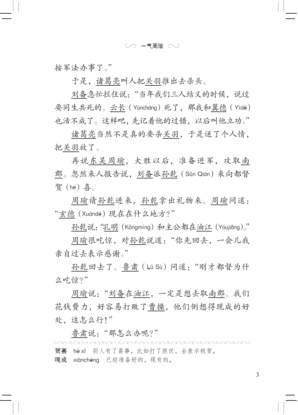 This volume tells Zhou Yu was wounded in the battle of Jingzhou against the army of Cao and Zhuge Liang played tricks to take Jingzhou effortlessly, which made Zhou Yu furious. Liu Bei took the four counties of Changsha, which greatly boosted his strength. Liu Bei's wife died. Zhou had Sun Quan ask Liu Bei to marry Sun's baby sister and got Liu Bei to Eastern Wu. Then Zhou arrested Liu Bei and asked Zhuge Liang to exchange Jingzhou for Liu Bei. Liu Bei went to Eastern Wu only with Zhao Yun and 500 soldiers and married Sun Quan's baby sister in the end. Zhou Yu was so frustrated by Zhuge Liang's three tricks that he was dead at last.