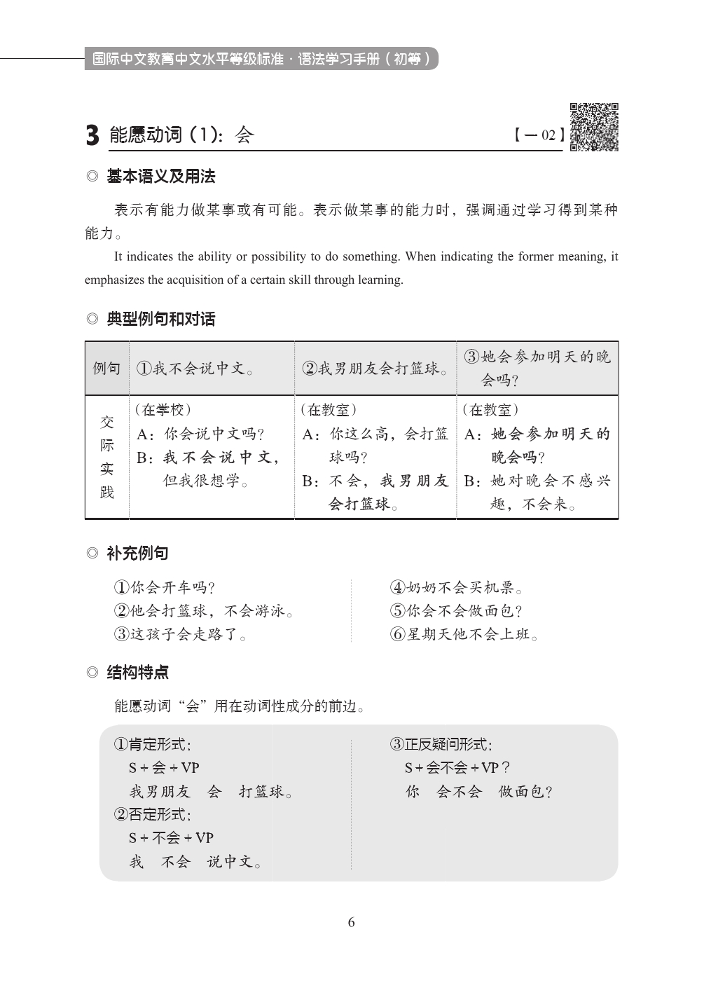 Grammar Learning Manual, a practical learning manual for students of Chinese language, is compiled in strict accordance with the “Appendix A (Normative Grammar Grading Outline)” (hereinafter referred to as “Grammar Grading Outline”) of Chinese Proficiency Grading Standards for International Chinese Language Education, which is jointly issued by the Ministry of Education and the State Language Commission. This book observes the “student-centered” education idea, and advocates the natural acquisition of grammar. Grammar Learning Manual is divided into the elementary, intermediate and advanced levels, respectively corresponding to the grammar points in the “Grammar Grading Outline”. In the book, the grammar points in the “Grammar Grading Outline” are split or merged, and each grammar point is explained in detail around several dimensions, such as its “basic meanings and usage”, “typical example sentences and dialogues”, “supplementary example sentences”, “structural features” and “tips”. Based on the teaching practice, this book strives to provide some reference and support for international Chinese grammar learning and teaching.