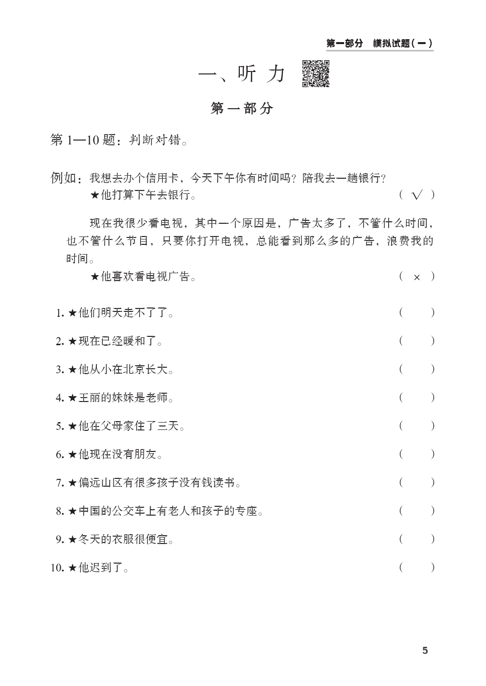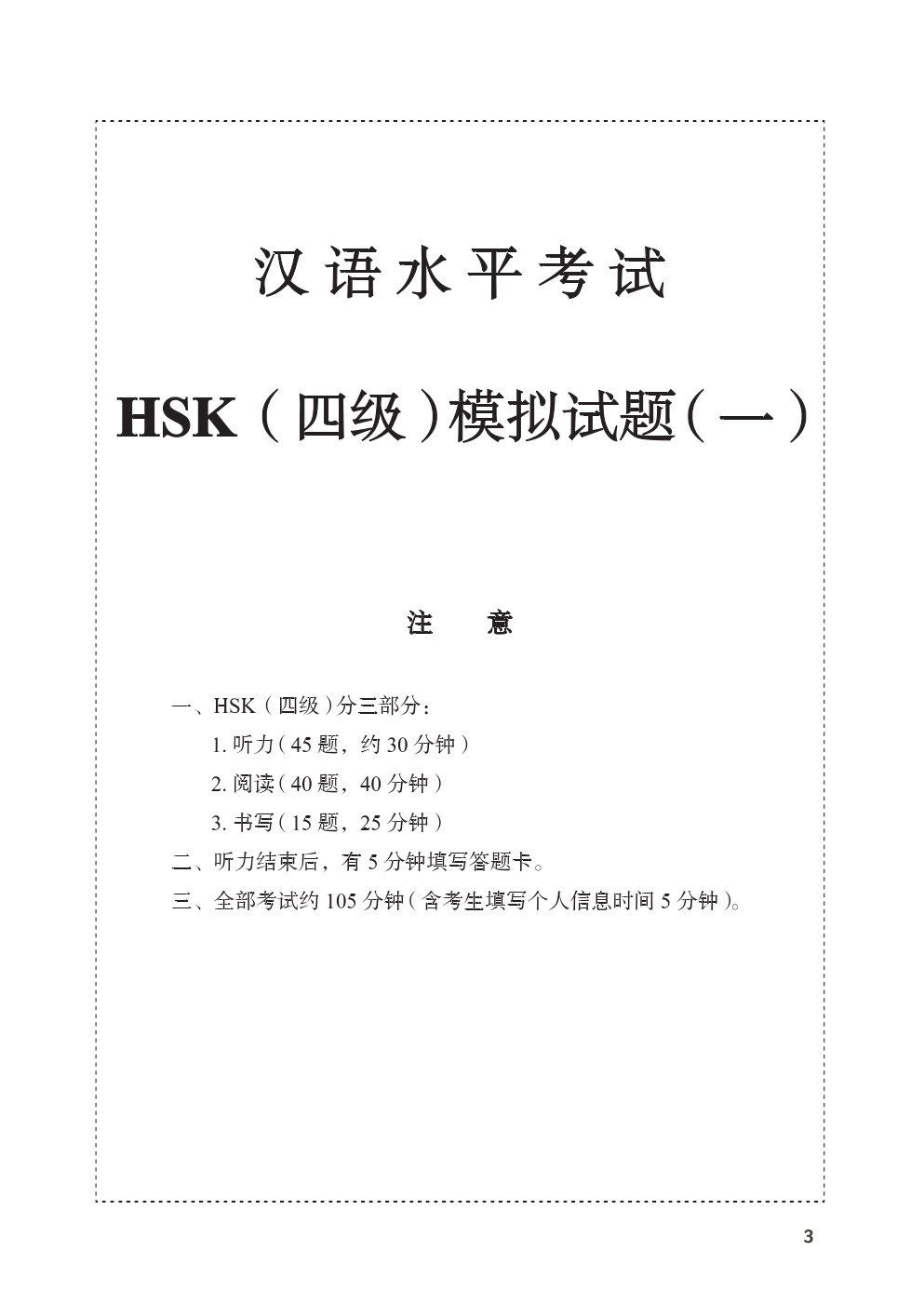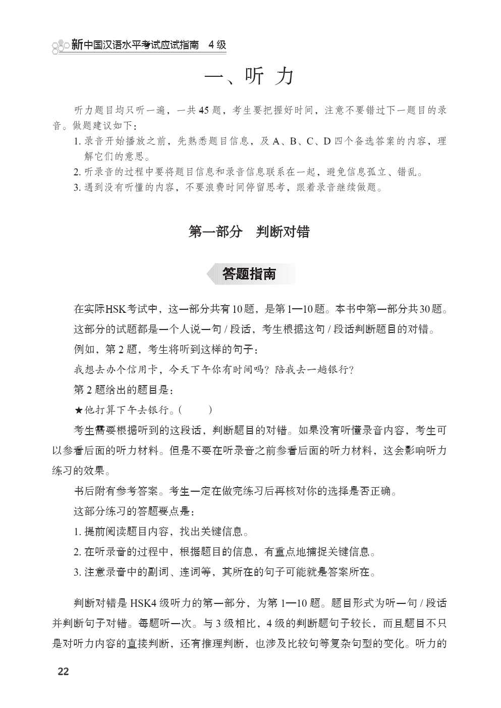 Guide to the New HSK Test provides level-specific training for each of the six levels graded in HSK. This is the level 4 volume. The amount of exercises in this book is ten times that of the HSK test paper, including 10 complete sets of test questions distributed in three parts—simulated training, skill training and timed training. Skill training is a newly added section, which summarizes the general rules and test-taking skills based on the contents and characteristics of questions in many HSK real and simulated tests and explains these rules and skills with specific examples. It gives the candidates a relatively clear idea of the basic question types and characteristics of the test to help them quickly find a proper way to answer the questions.
