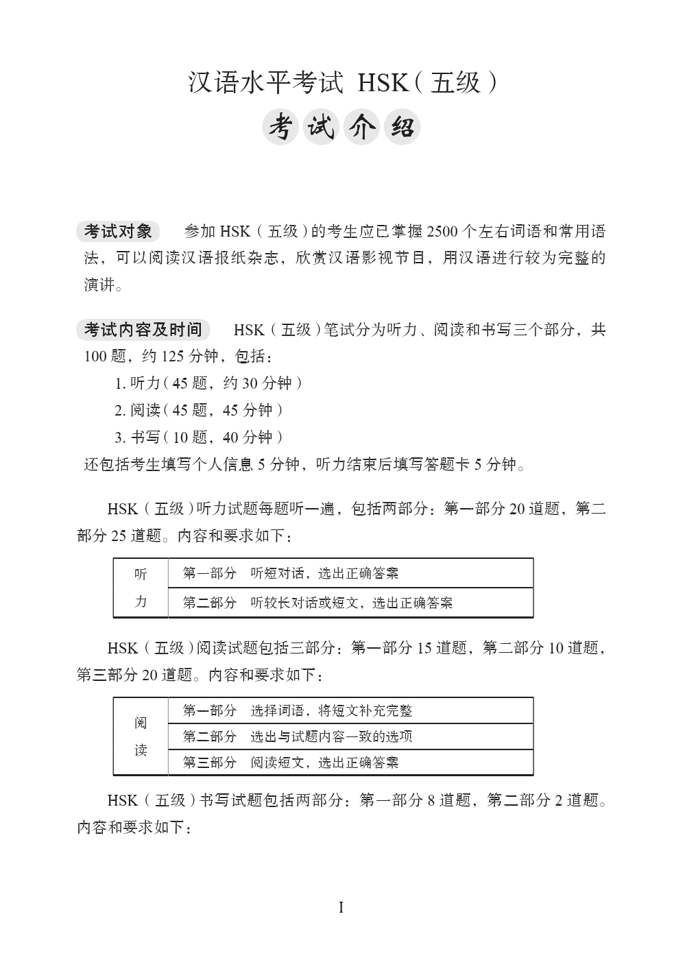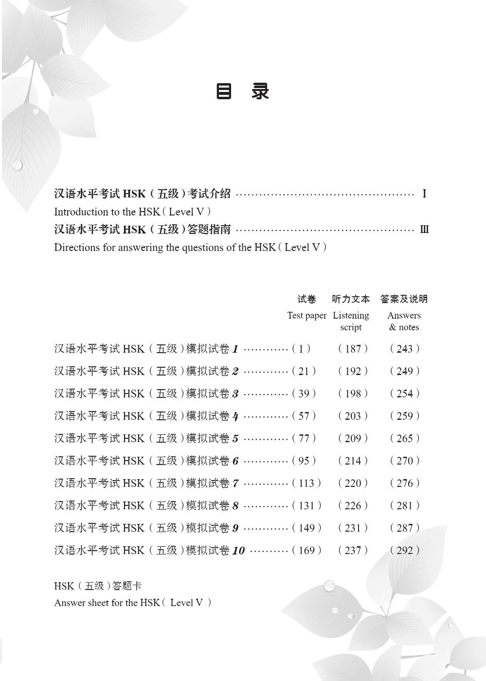This book is based on the 2015 edition of Hanban’s HSK Test Syllabus (Levels 1-6), with due consideration to experts’ suggestions and an analysis of sample questions and question design principles. The book of each level is composed of 10 sets of written simulation tests, preceded by an introduction to the test of the specific level and the methods of taking the test under the new mode, and followed by the listening script and answers. The listening sections in the book are provided with audio recordings, which can be acquired by scanning the QR codes in the book.