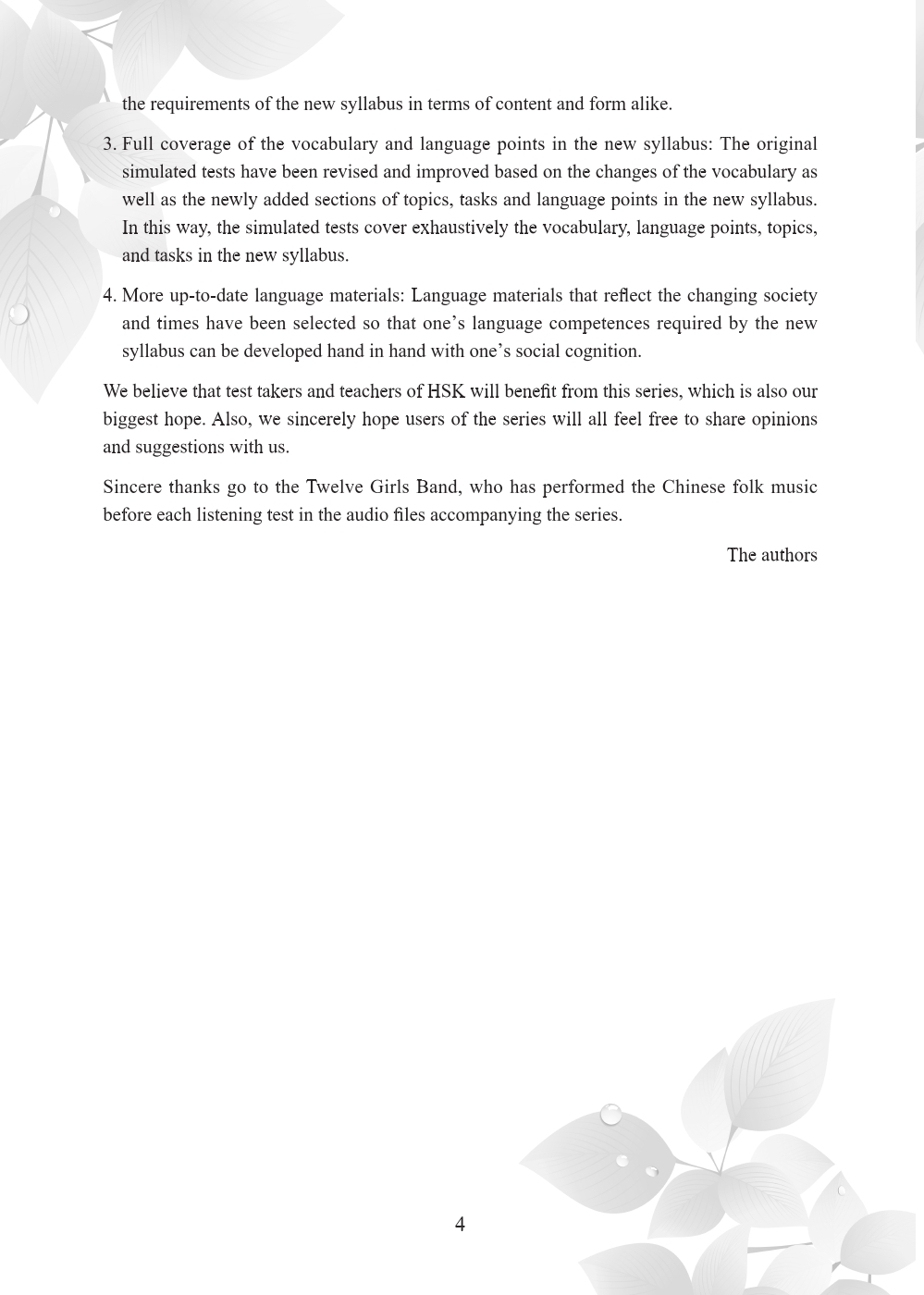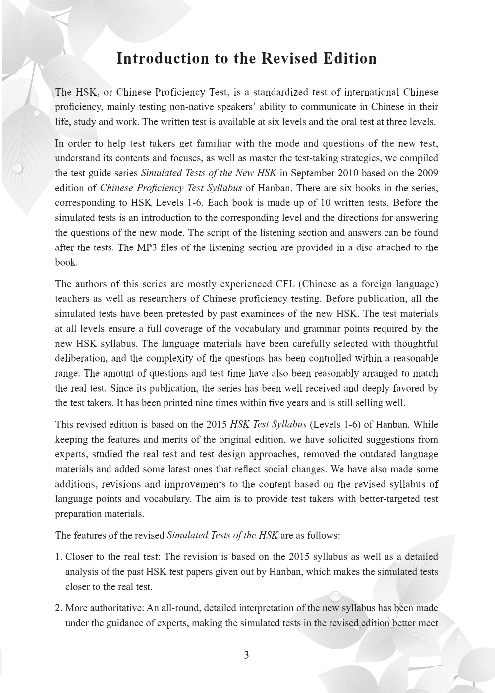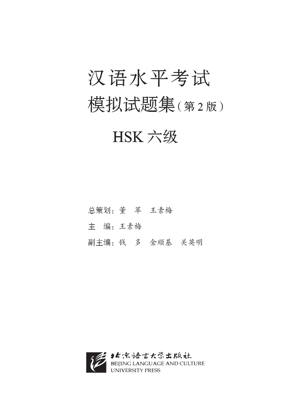 This book is based on the 2015 edition of Hanban’s HSK Test Syllabus (Levels 1-6), with due consideration to experts’ suggestions and an analysis of sample questions and question design principles. The book of each level is composed of 10 sets of written simulation tests, preceded by an introduction to the test of the specific level and the methods of taking the test under the new mode, and followed by the listening script and answers. The listening sections in the book are provided with audio recordings, which can be acquired by scanning the QR codes in the book.