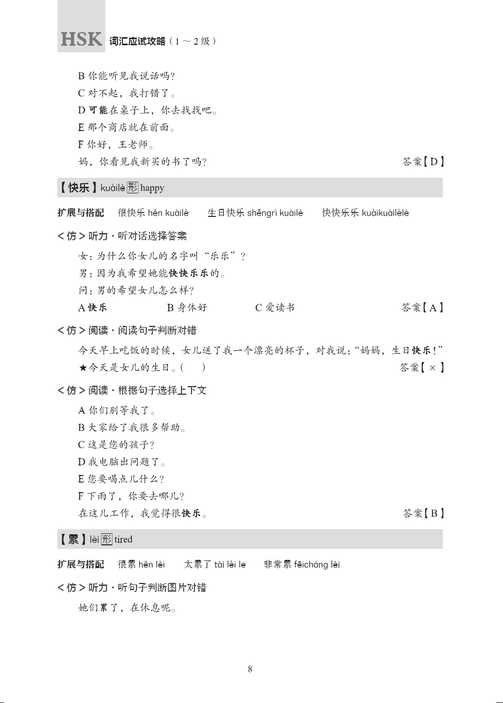 In order to help candidates successfully pass HSK and improve their proficiency in the use and proper expression of Chinese vocabulary, this book compiles a series of reference books called HSK Vocabulary Prep based on the HSK Outline newly issued by Confucius Institute Headquarters/ Hanban in 2015, in combination with all the new HSK questions that have been published so far, and referring to the reference books related to HSK vocabulary. The vocabulary in each book of this series is classified by word group, and the writing style is basically the same. It consists of pinyin, parts of speech, Chinese and English explanations, word expansion and collocation, stimulated examples, antonym or synonym discriminations, etc. It is suitable for students of HSK (whose first language is not Chinese) and also for teachers who are tutoring HSK.