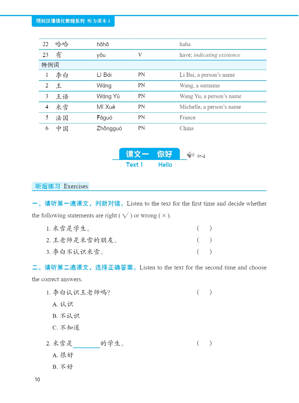 Intensive Chinese for Pre-University Student Listening, a series of beginner/intermediate level listening textbooks, is consistent with HSK SyllabusandFinal Test for the Pre-University International Students Founded by the Chinese Government Scholarship and shows the teaching ideas of “learning to use” and “combining learning with testing”. This series is designed for pre-university students who study science, engineering, literature and history in China. It can also be used as Chinese listening textbooks for beginner/intermediate level students who come to China for long-term language training. It is also suitable for learners of Chinese who want to pass HSK levels 1-5.
