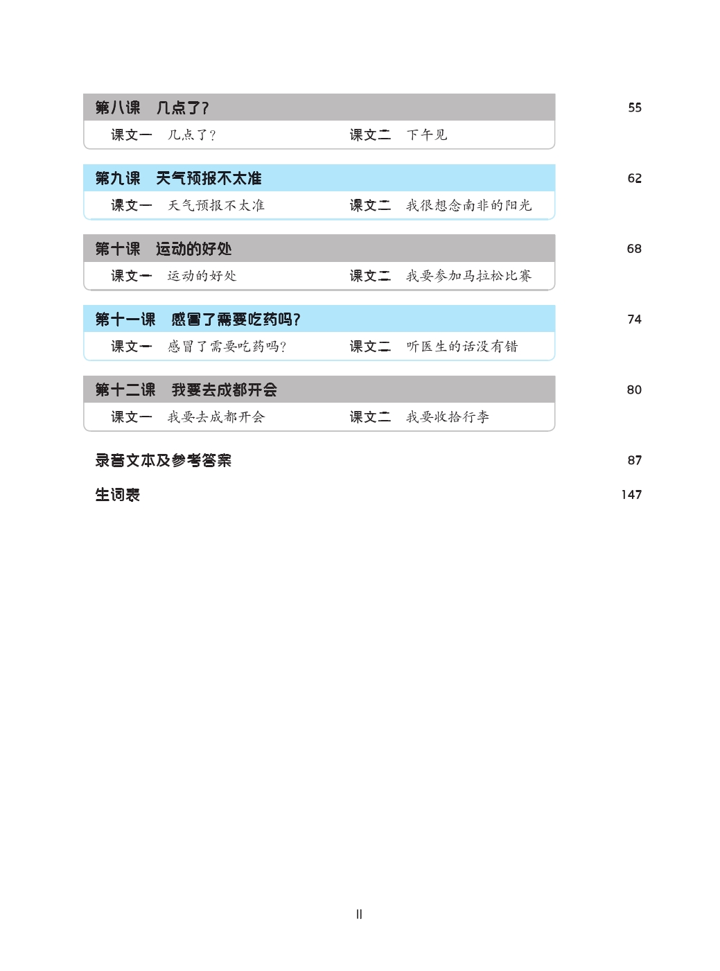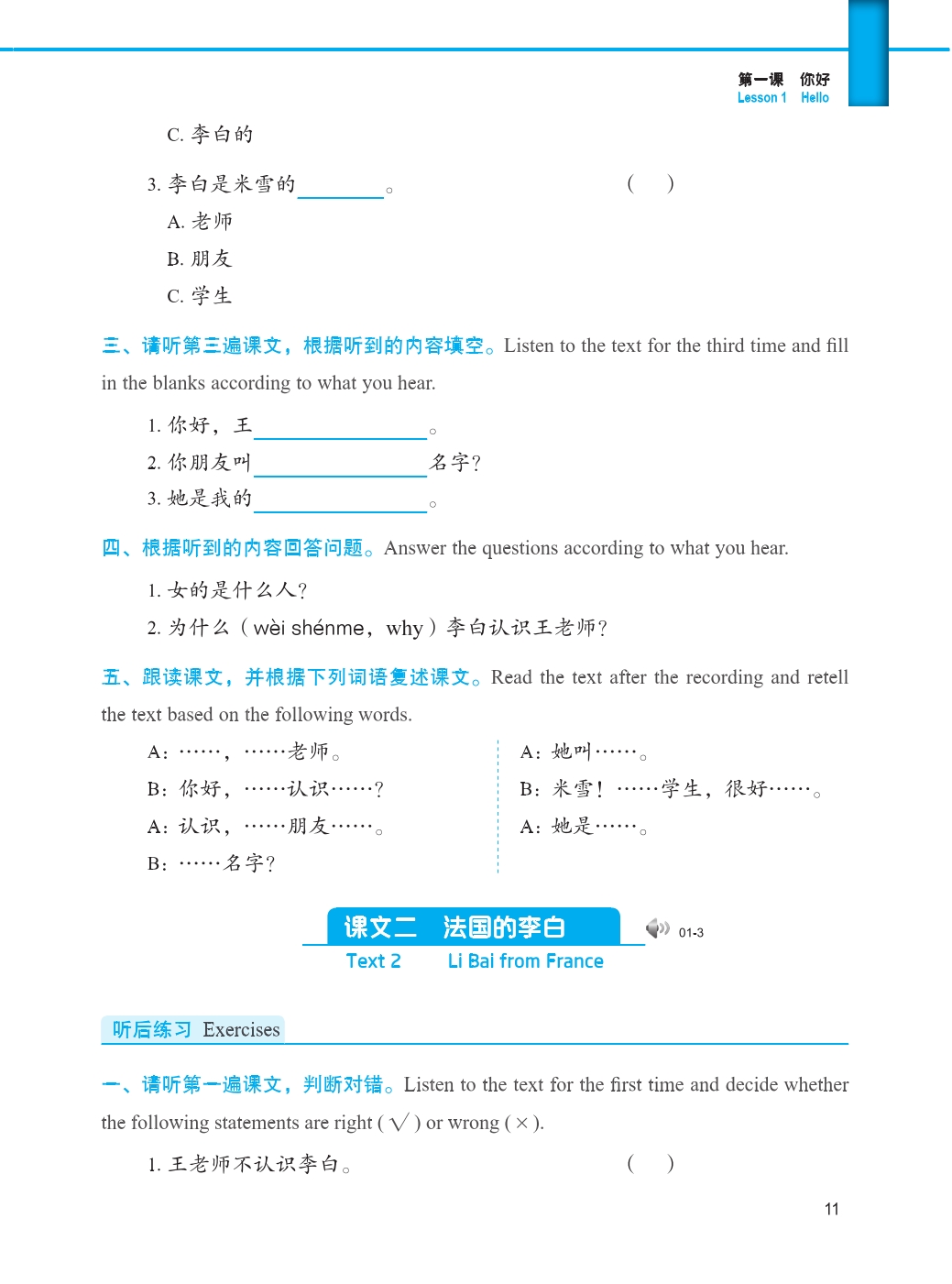 This is the first volume of the listening textbooks designed for students without previous Chinese learning experience. It has 16 lessons, the first four of which teach phonetics, and each of the other 12 lessons has such parts as “Text”, “Exercises”, “Let’s Talk” and “Challenge Ourselves”.