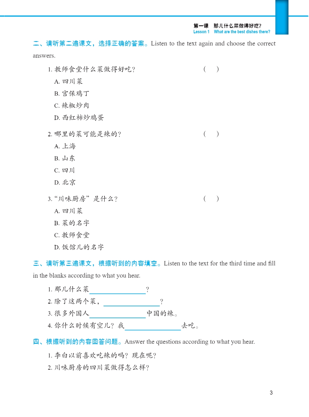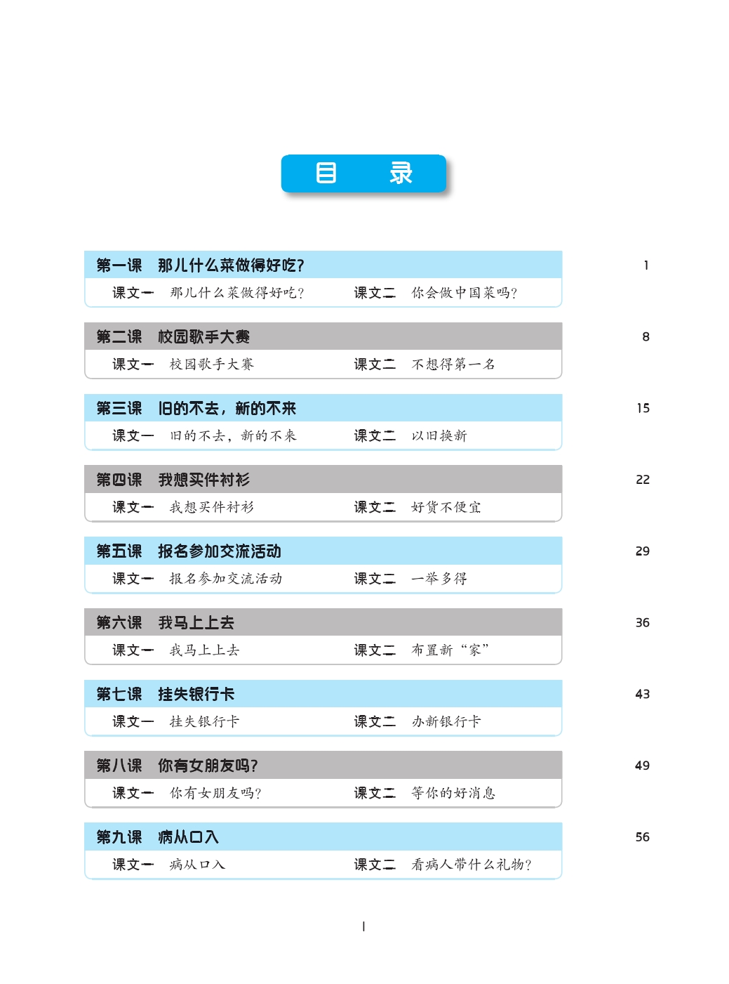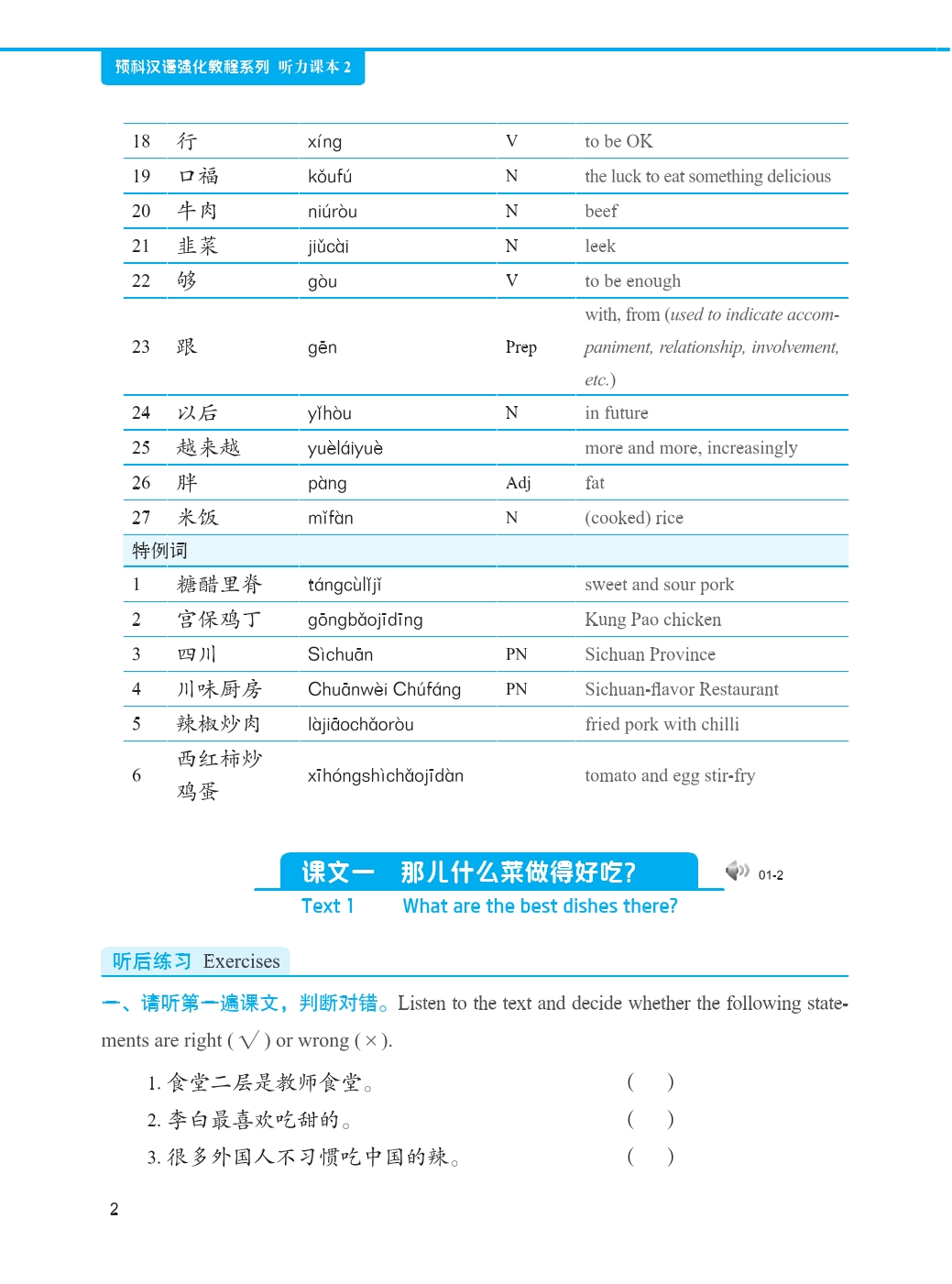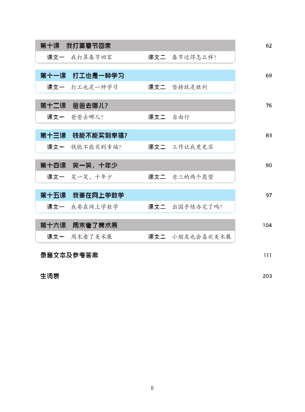 This is the second volume of the listening textbooks designed for beginner-level students of Chinese. It has 16 lessons, each of which has such parts as “Text”, “Exercises”, “Let’s Talk” and “Challenge Ourselves”.