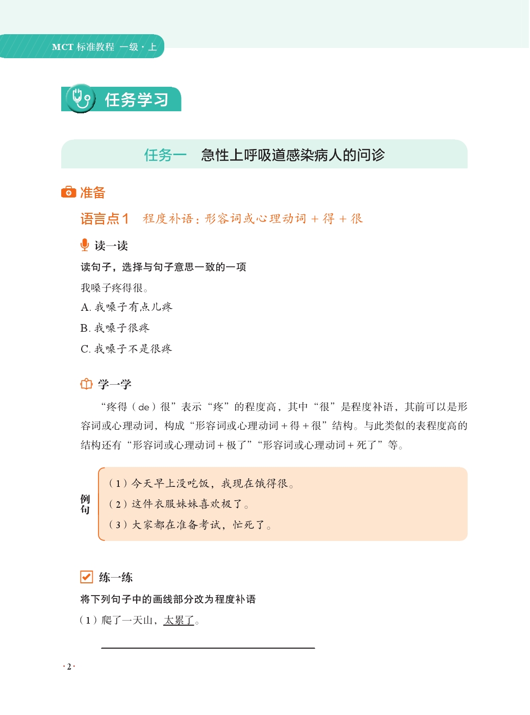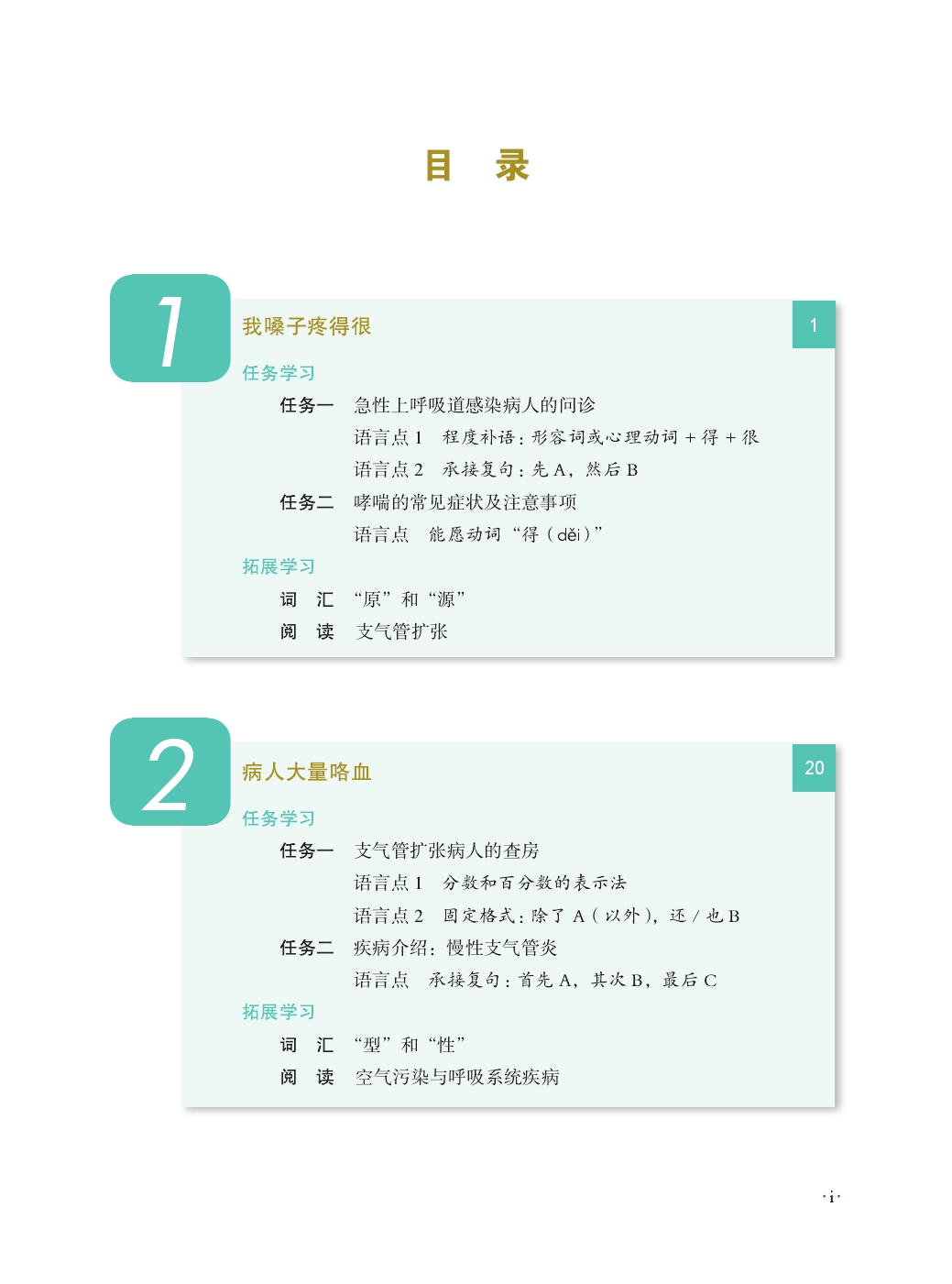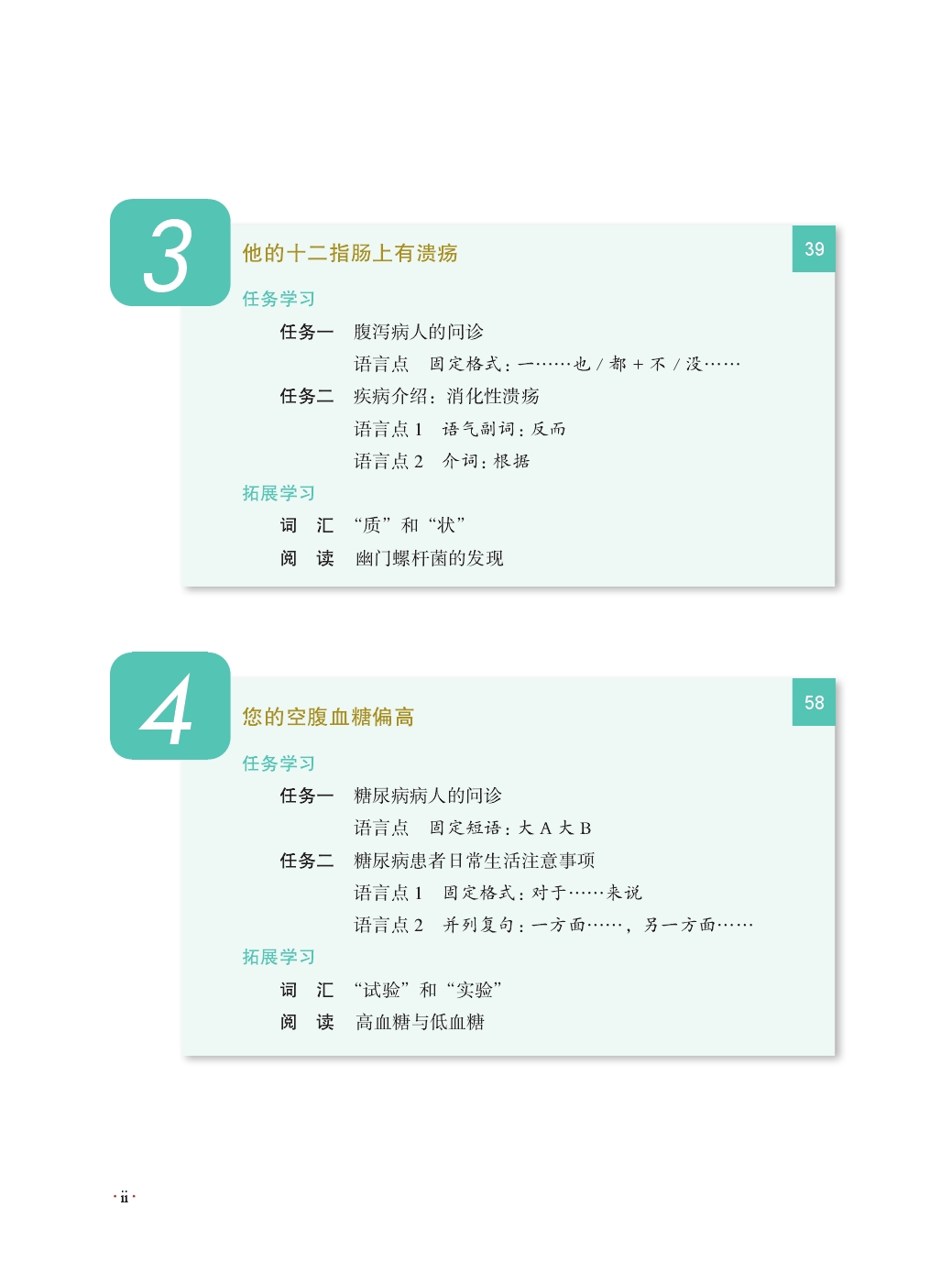 Based on the Syllabus of Medical Chinese Test (MCT) and the Chinese Proficiency Grading Standards for International Chinese Language Education, MCT Standard Course is written to integrate professional medical knowledge and common Chinese knowledge, and to comprehensively develop learners’ medical competence and Chinese listening, speaking, reading and writing skills. It is fully aligned with the requirements of vocabulary, test contents, test forms and grading standards of MCT in all aspects, combining test and teaching with learning and practicing. After learning each volume, learners can reach the corresponding MCT level. All volumes of the MCT Standard Course cover the four main clinical disciplines of internal medicine, surgery, gynaecology and paediatrics, as well as other disciplines. The first volume focuses on the description of symptoms and diagnosis of diseases, the second one the diagnosis and treatment of diseases, and the third one the exploration of pathological mechanisms of diseases. The content mainly involves the basic information of hospitals and medical procedures, symptoms and signs of common diseases, routine examinations and diagnostic and therapeutic operations. Furthermore, the description of symptoms and introduction of diagnostic and therapeutic programs are presented in the form of pictures in order to make them vivid and intuitive.