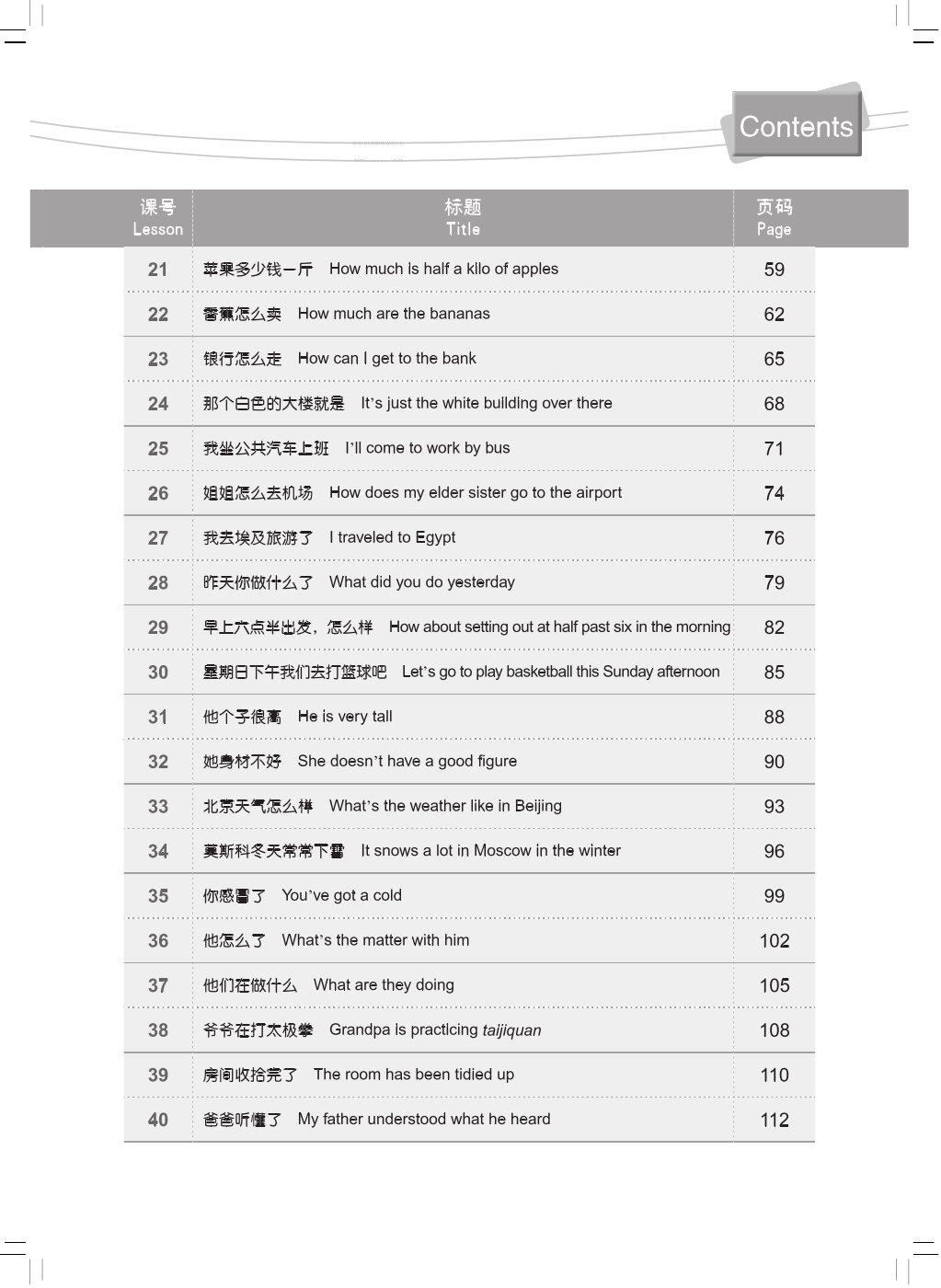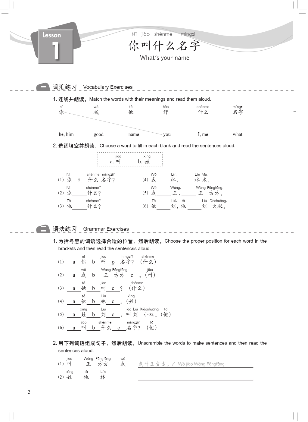 New Concept ChineseWorkbook 1 is composed of 40 lessons, each including vocabulary exercise, grammar exercise, communication exercise, character drills and task/activity, etc. It will effectively improve students’ comprehensive language skills in listening, speaking, reading, writing and translating.