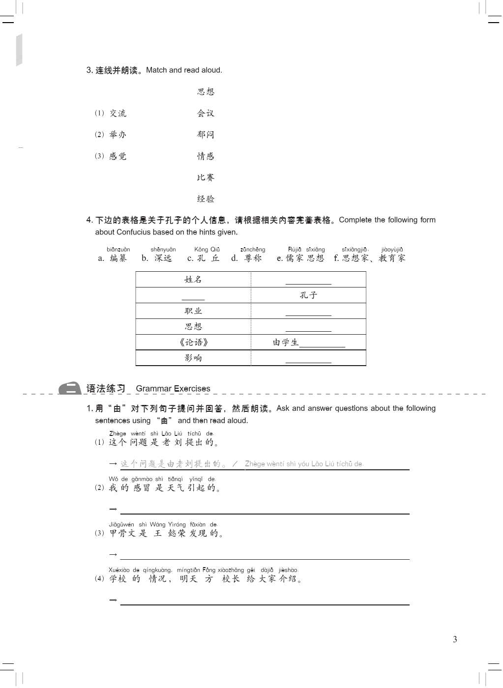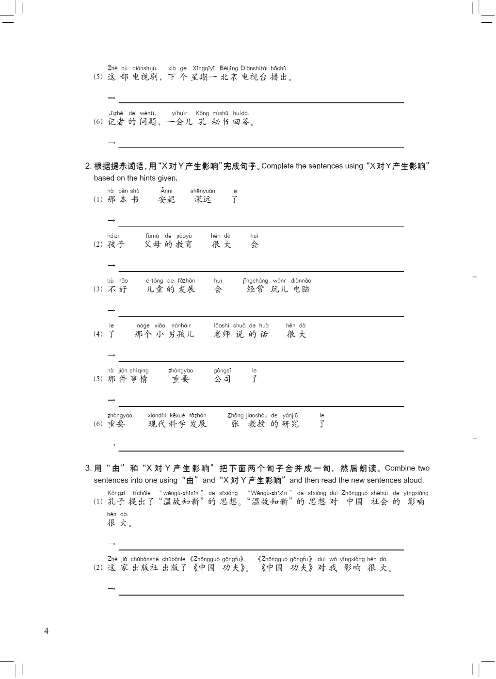 New Concept Chinese Workbook 4 is composed of 20 lessons, each including vocabulary exercises, grammar exercises, listening exercises, exercises on Chinese characters, communicative exercise and textual exercise, etc. It will effectively improve students’ comprehensive language skills in listening, speaking, reading, writing and translating.