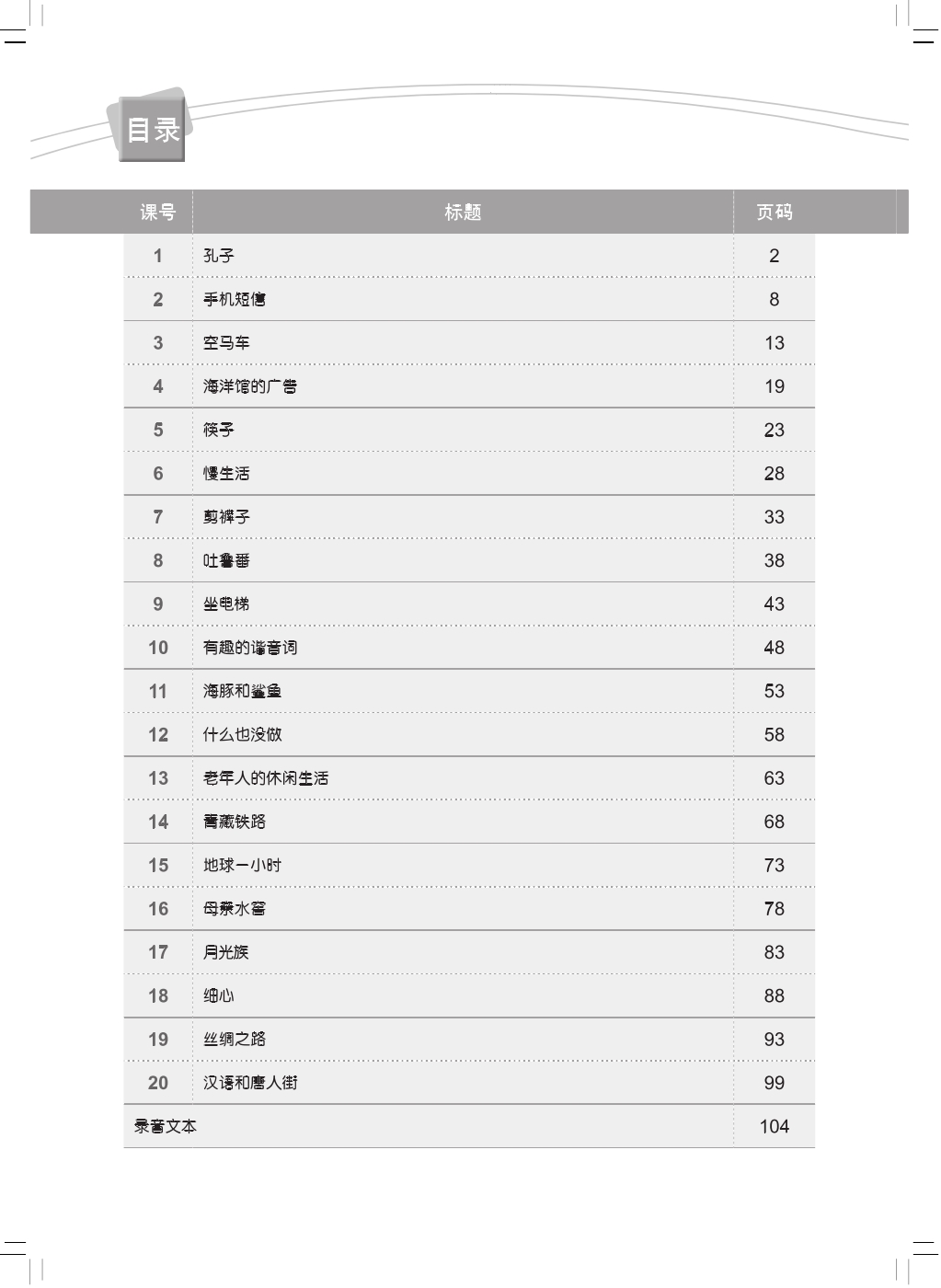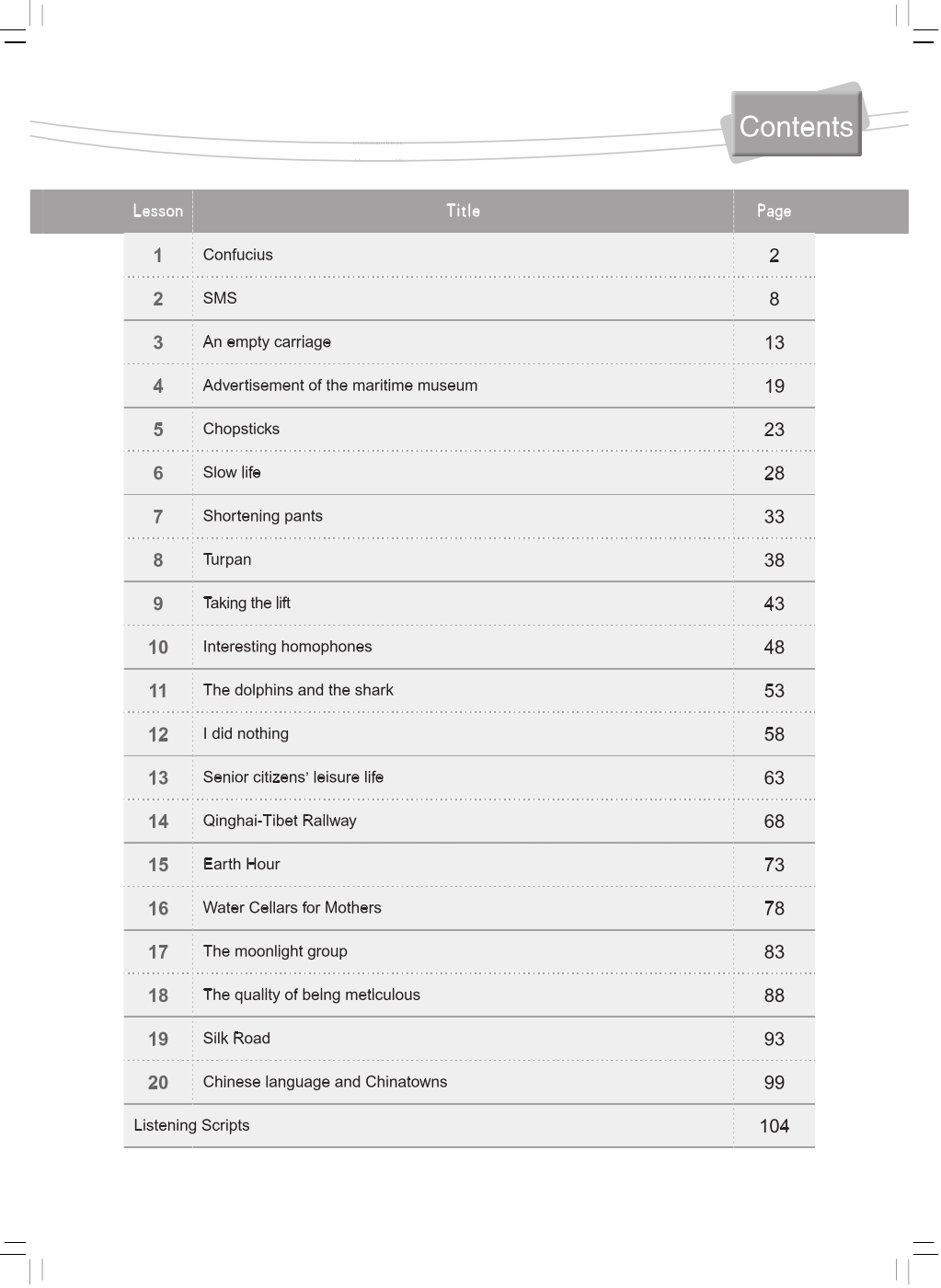 New Concept Chinese, a series of Chinese textbooks for adults, is suitable for both self-teaching and classroom teaching. Observing the principle of “making Chinese easier to learn”, this series presents practical, concise and interesting teaching materials and employs easy, flexible and effective teaching methods so that students and teachers can learn and teach Chinese in a convenient and effective way.